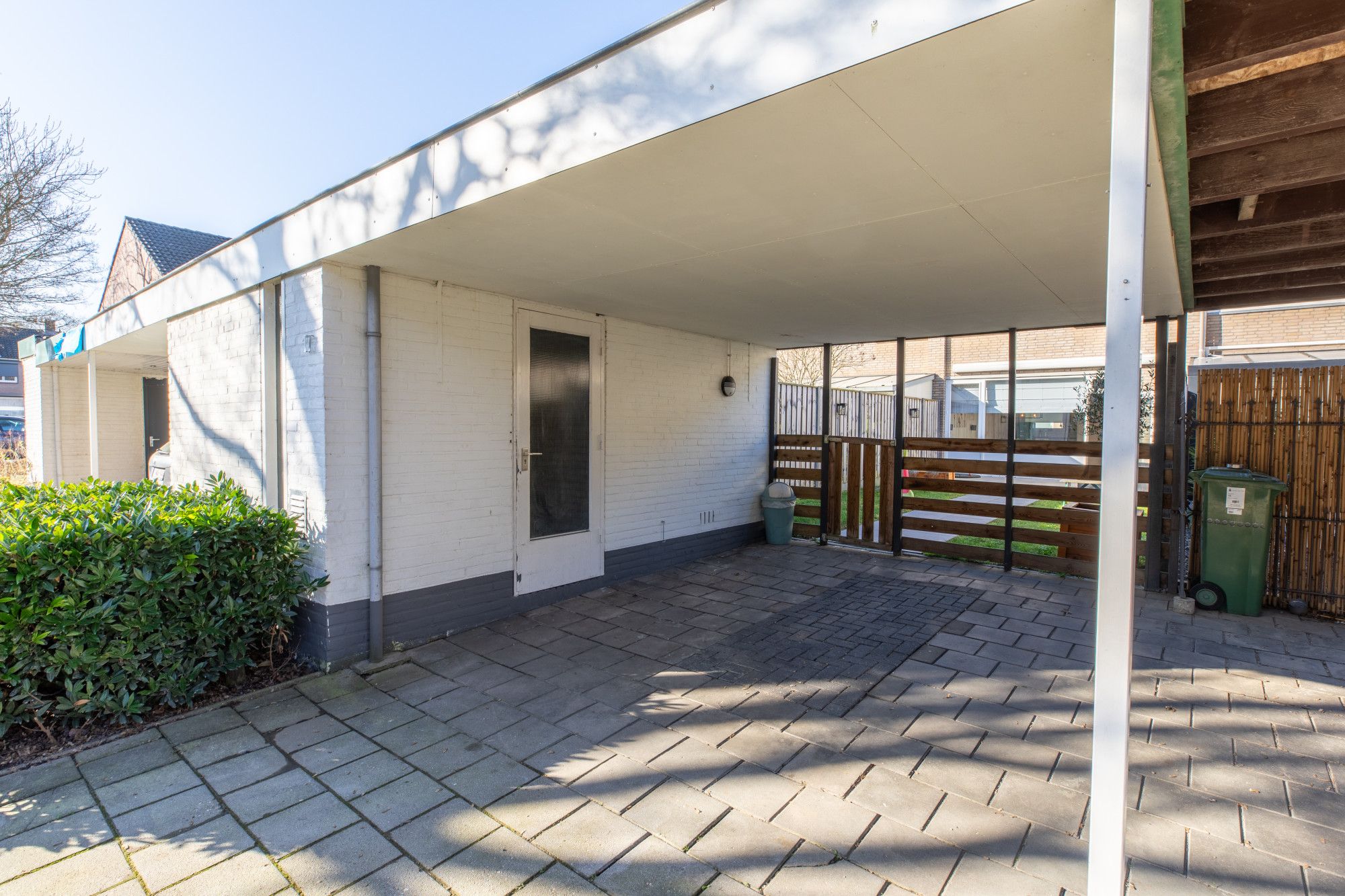 - Via achterom bereikbare onderhoudsvriendelijke achtertuin op het oosten met een gemetselde berging van ca. 6 m² met elektra en aangrenzende carport.
