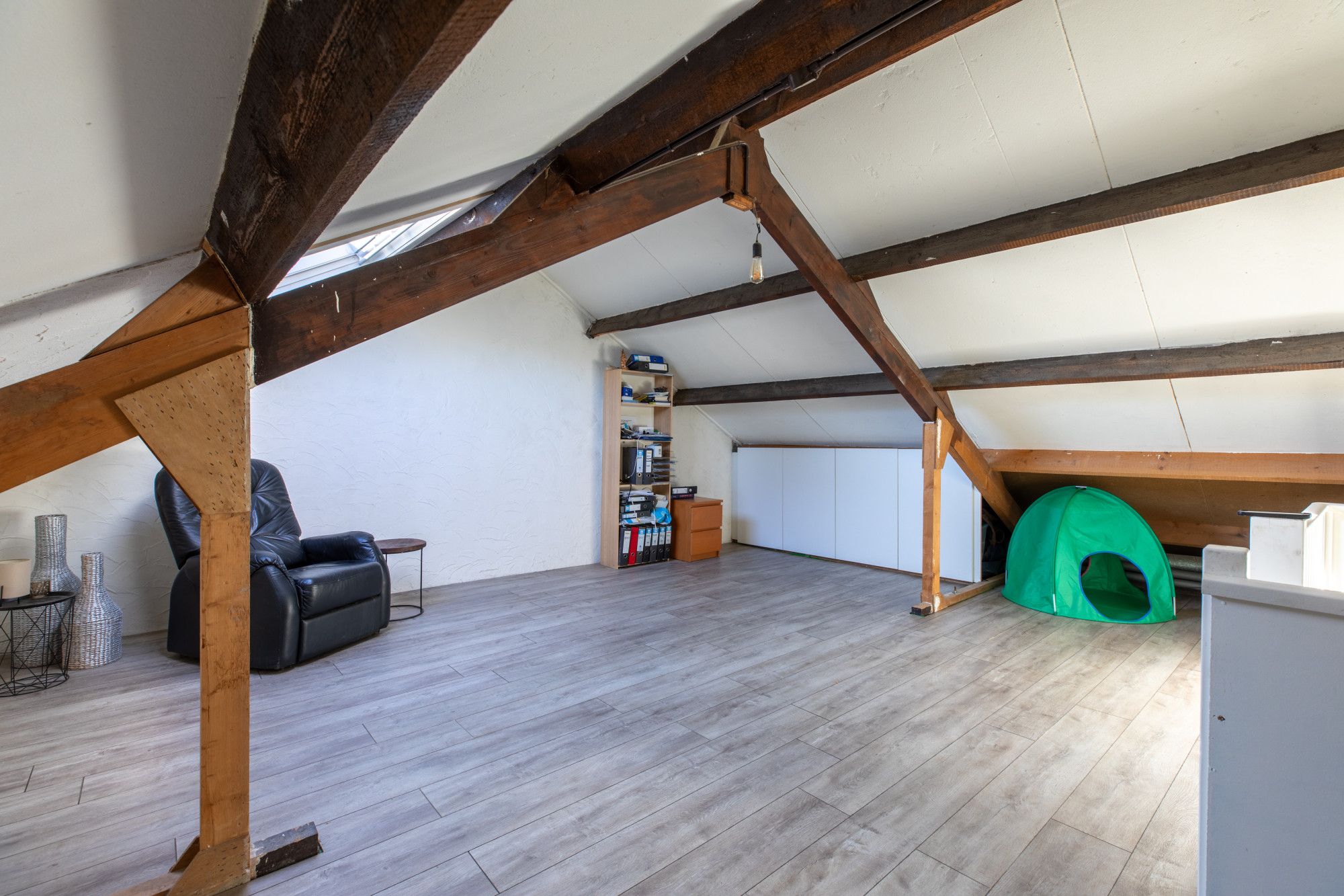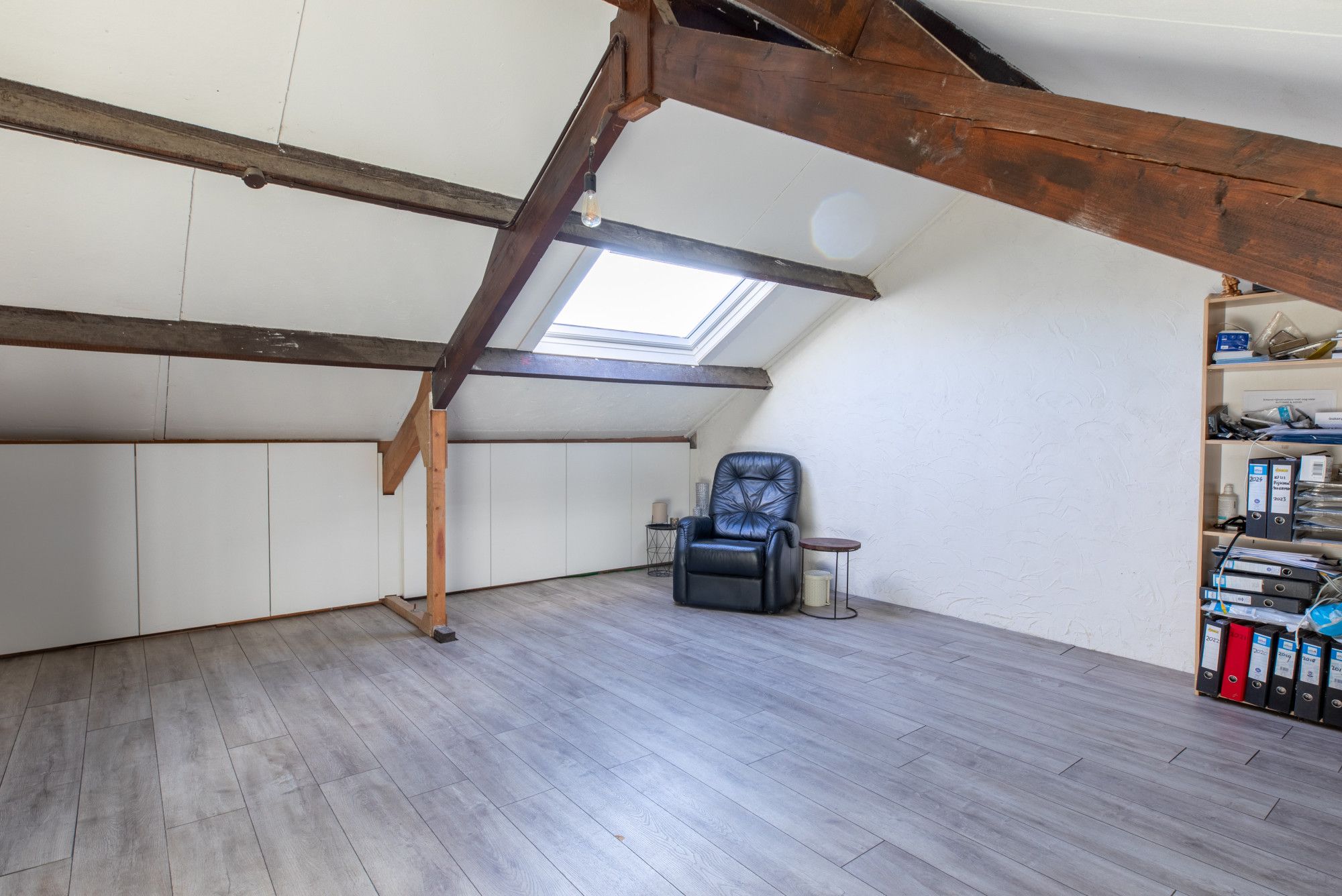- Middels vaste trap bereikbare ruime kamer van ca. 20 m² met een kantelraam (2026), de HR combi installatie (eigendom, ca. 2024) en wasmachine aansluiting.