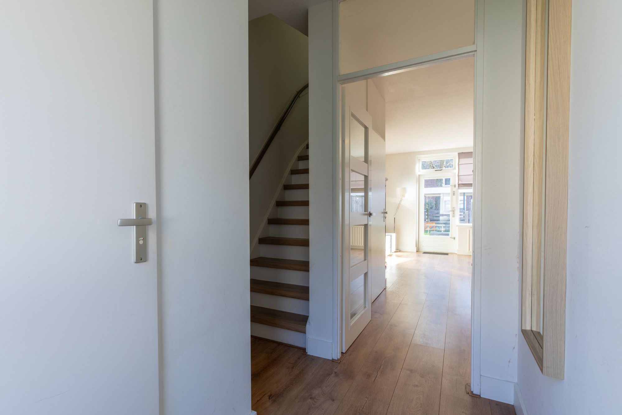 - Ontvangsthal met de meterkast, het trappenhuis en toegang tot de woonkamer.