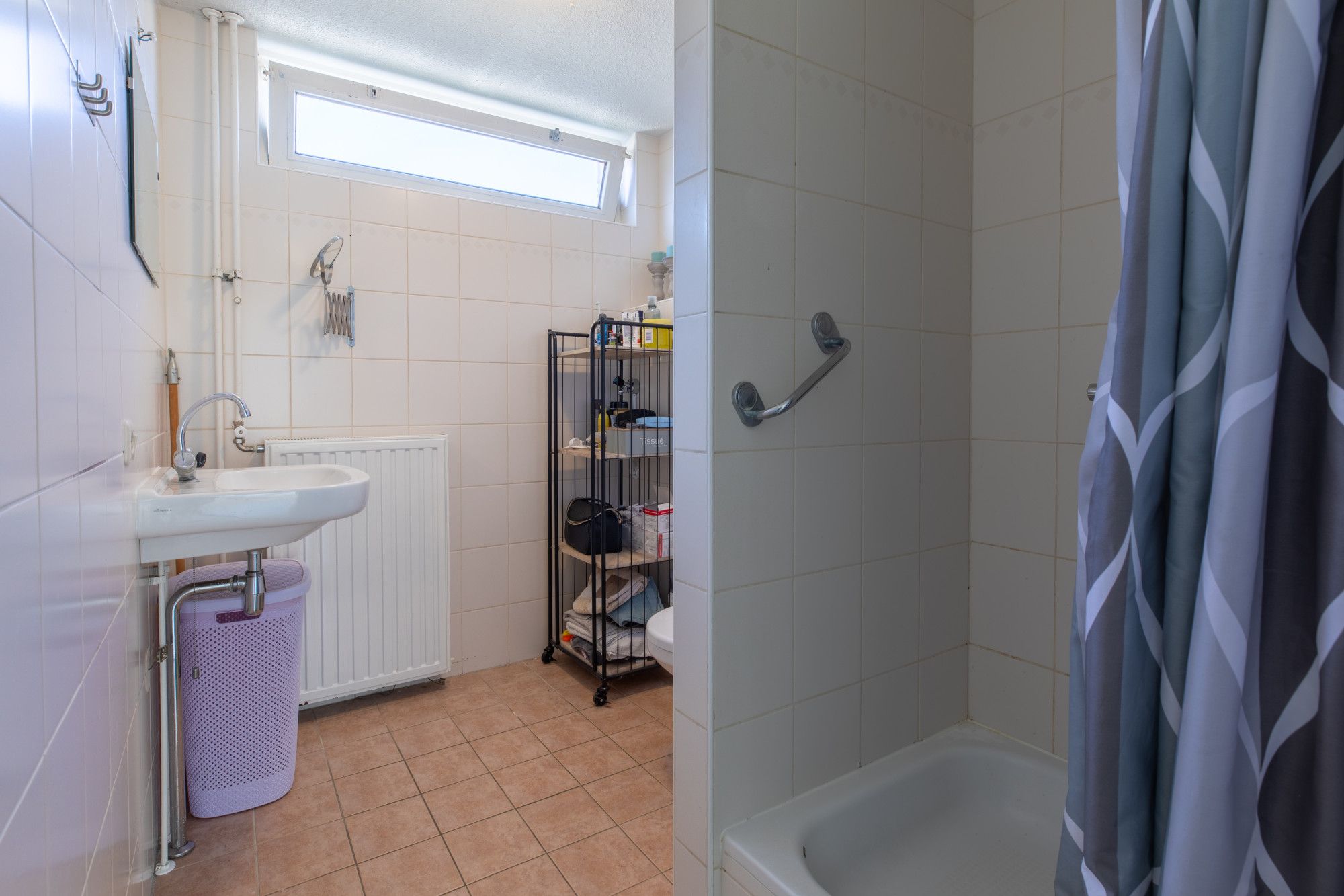 - Geheel betegelde badkamer van ca. 5 m² met een wastafel, douche, 2e toilet en aansluiting voor de wasmachine.