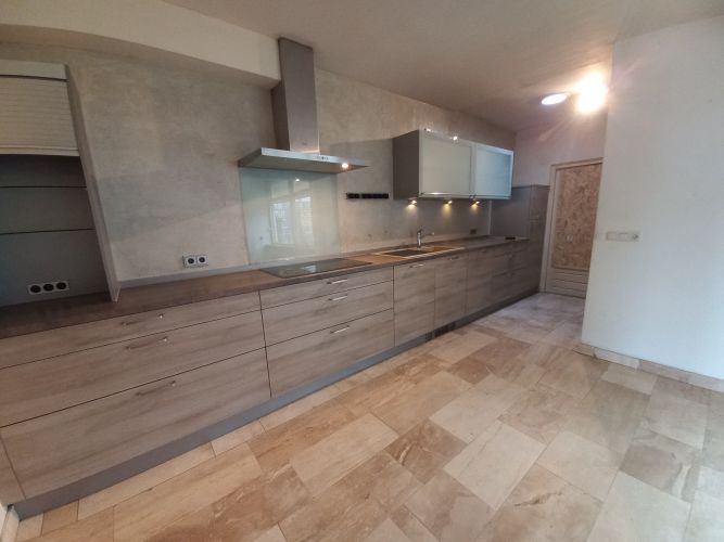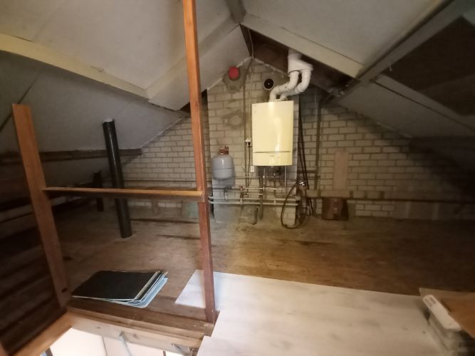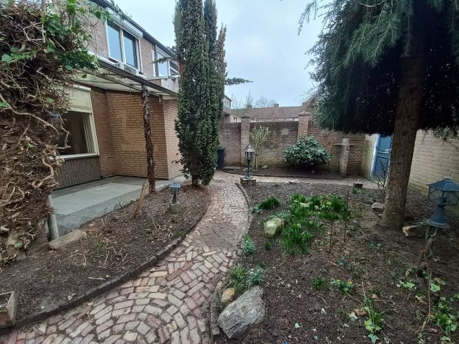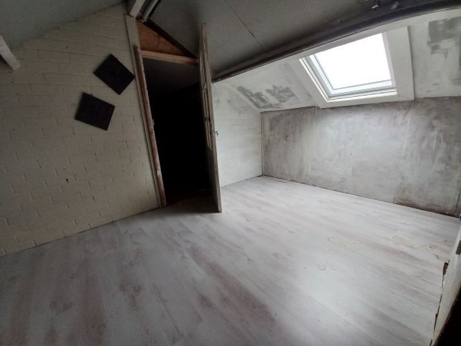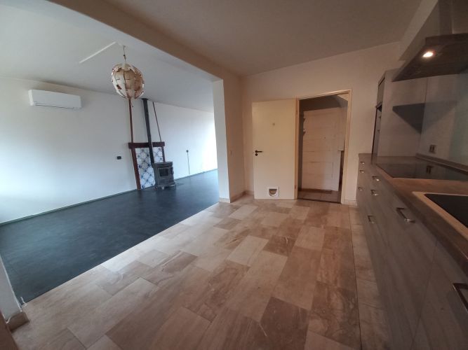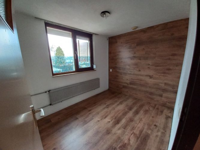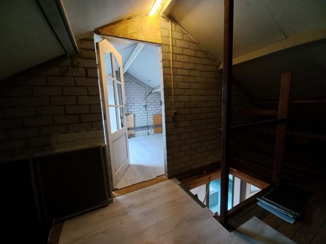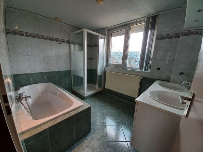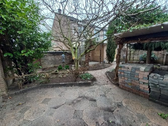 Indeling: Hal met meterkast en toilet. Open keuken (+/- 17 m2)met apparatuur en voorzien van tegelvloer. Doorzon woonkamer (+/- 34 m2) met dubbelglas en rolluiken en voorzien van PVC vloer. Vanuit de keuken toegang tot de tuin met overkapping en garage. 1e Etage: 3 slaapkamers (+/- 2.98 x 2.32 m/3.9 x 3.45 m/2.58 x 3.9 m), Badkamer (+/- 2.3 x 3 m)met ligbad, douche en wastafel. Separaat toilet met wasruimte. De zoldervliering is via een vlizotrap te bereiken. Daar staat ook de HR CV (eigendom 2013).