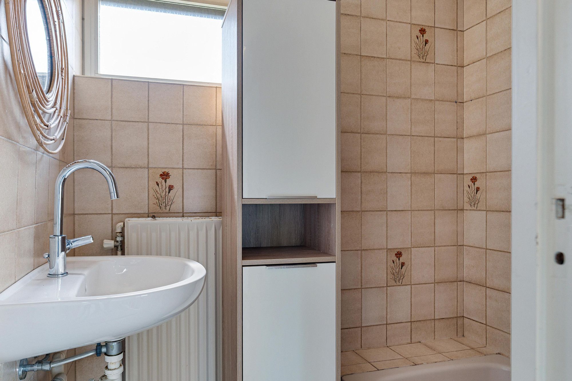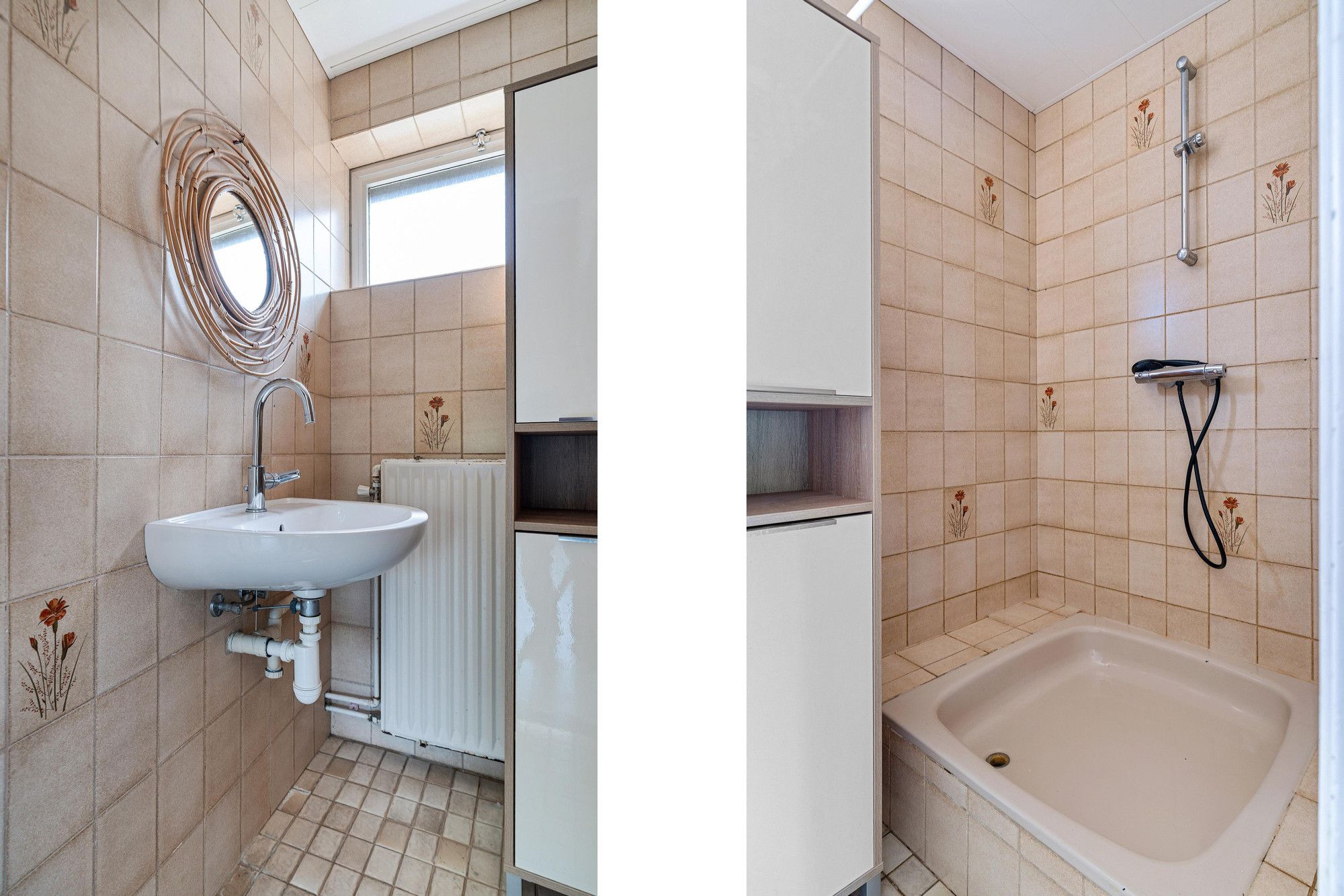Volledig betegelde badkamer met douche (2.00mx1.30m), vaste wastafel.