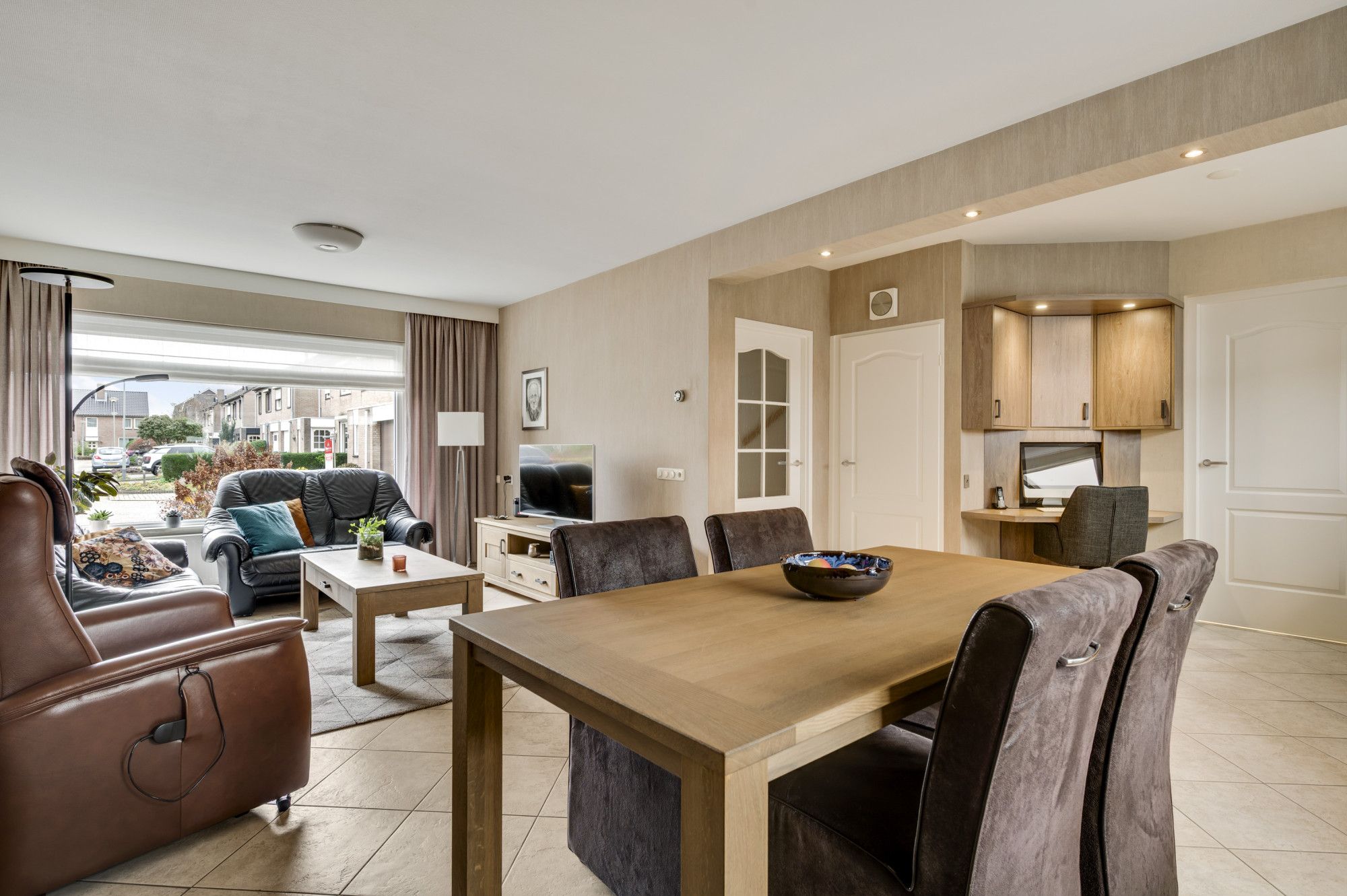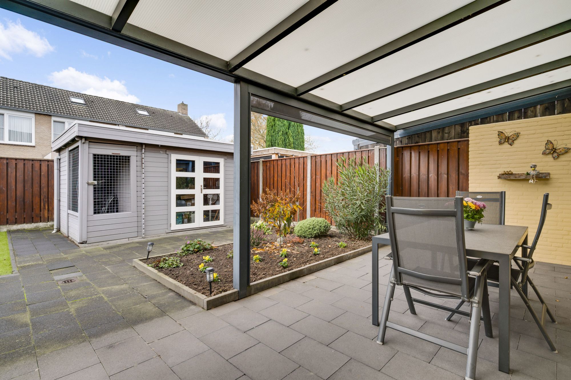 De voortuin is onderhoudsvriendelijk aangelegd en de oprit biedt toegang tot de inpandige garage. De achtertuin is een echte meerwaarde van deze woning: zonnig, verzorgd en gunstig gelegen op het zuidwesten. Dankzij de mooie overkapping met zonnescherm, het kunstgazon en de houten berging is dit een plek waar u het hele jaar door kunt genieten — ideaal voor lange zomeravonden of gezellige momenten met vrienden en familie.