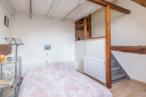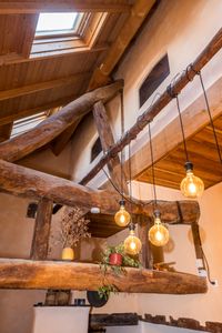 De woonkamer is voorzien van een houten vloer en haardpartij. Verder zijn de authentieke houten balken zichtbaar in de gehele woning. De keuken met blauwstenen plavuizen en landelijke stijl keukenblok maken het geheel af.