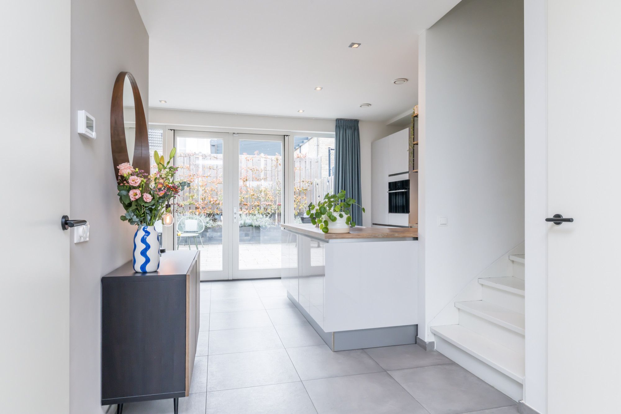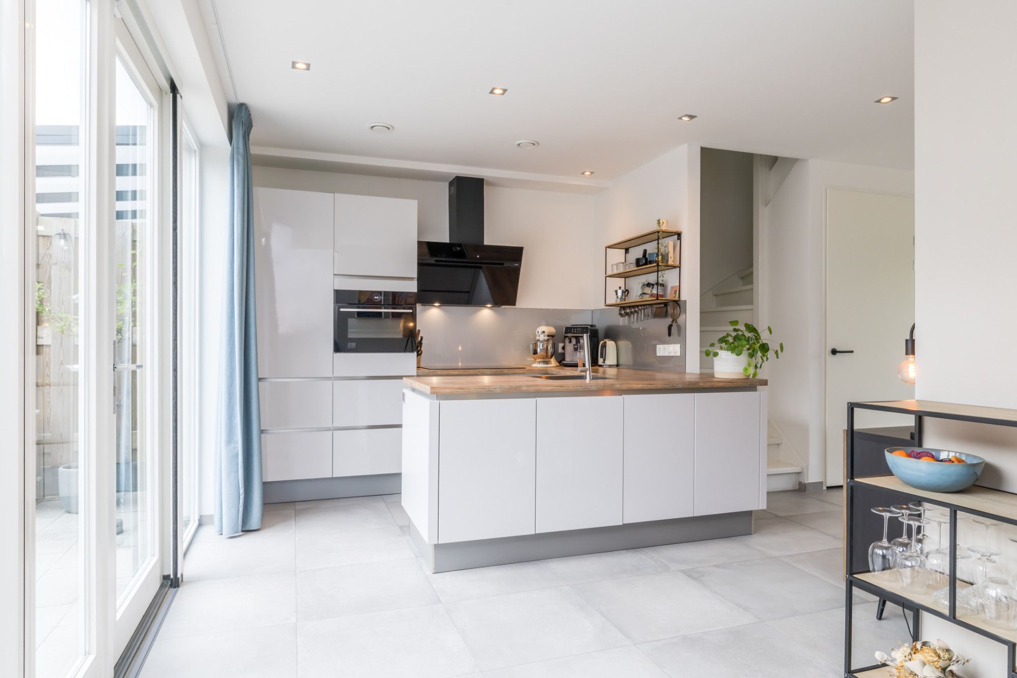 Moderne open leefkeuken (5,50 m x 2,99 m) met installatie en apparatuur t.w.: oven (2024), 4 pits inductiekookplaat, afzuigkap, vaatwasser en koelkast. De dubbele openslaande deuren, beide voorzien van plissé hordeur zorgen voor het ideale tuincontact. Inpandig vanuit keuken te bereiken garage, tevens gebruikt als opslag en bijkeuken (5,99 m x 3,40 m) is v.v. aanrecht met wasbak en een deur naar de tuin.