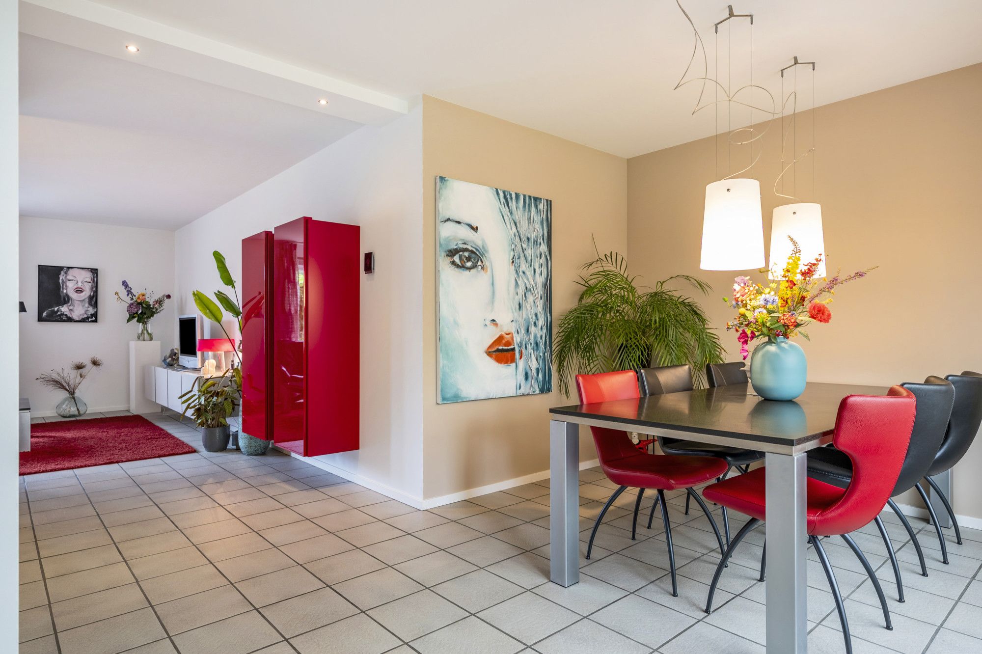 Sfeervolle woonkamer (6.00/4.10 x4.60 m) voorzien van tegelvloer.