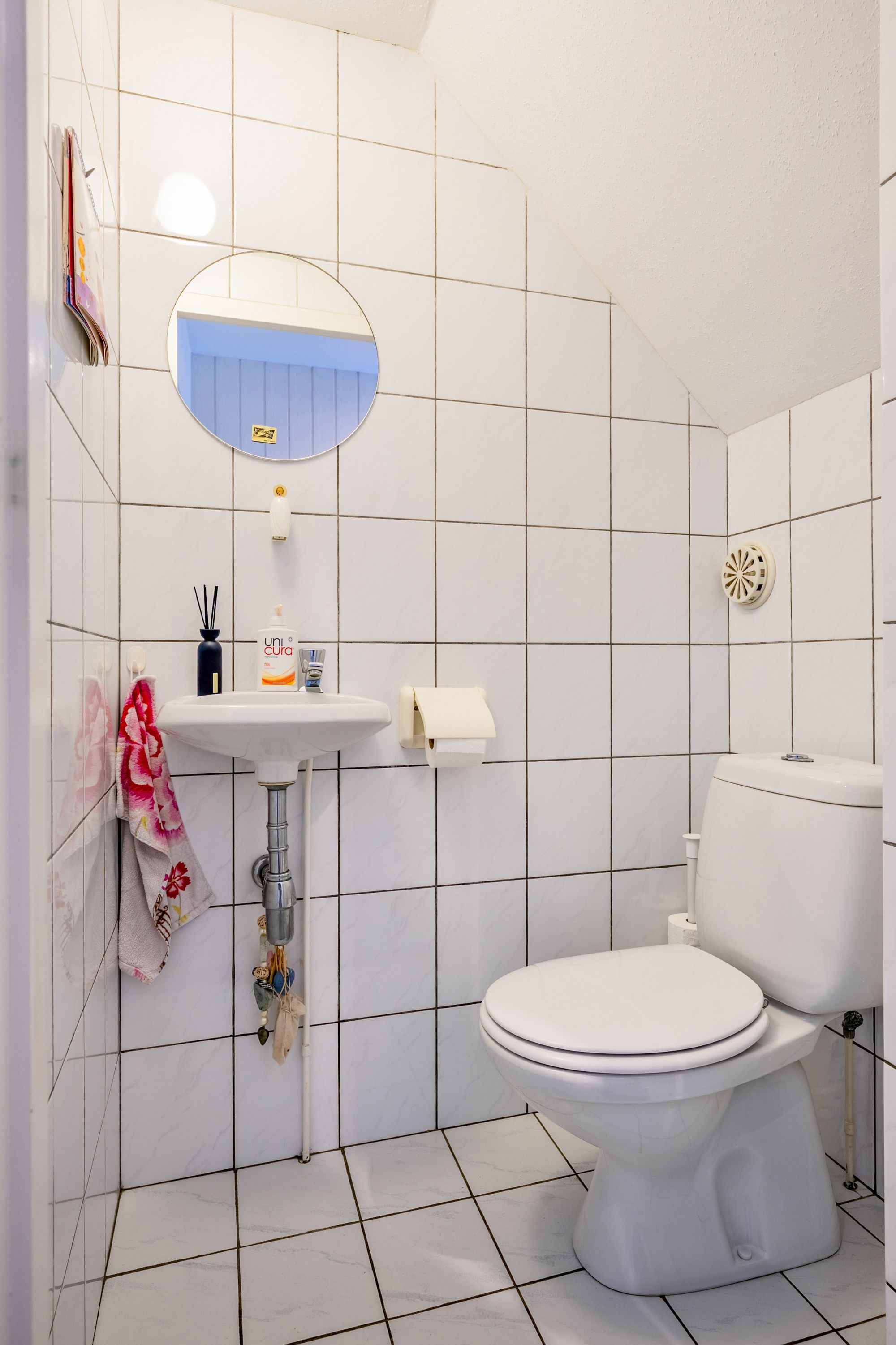 Betegelde toiletruimte voorzien van duo closet en fontein.