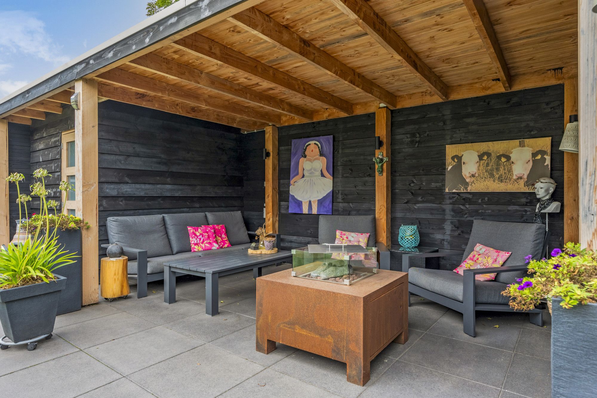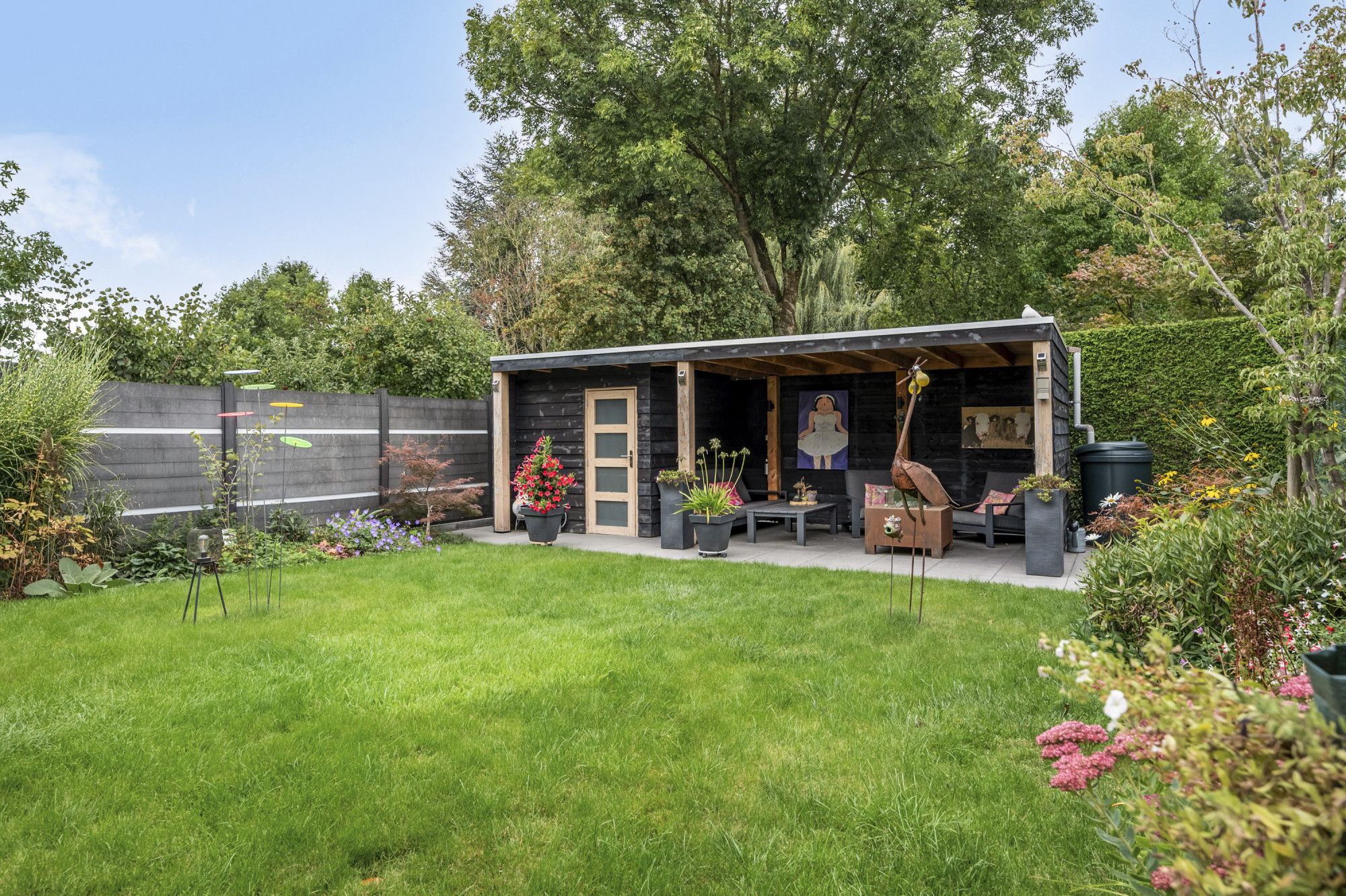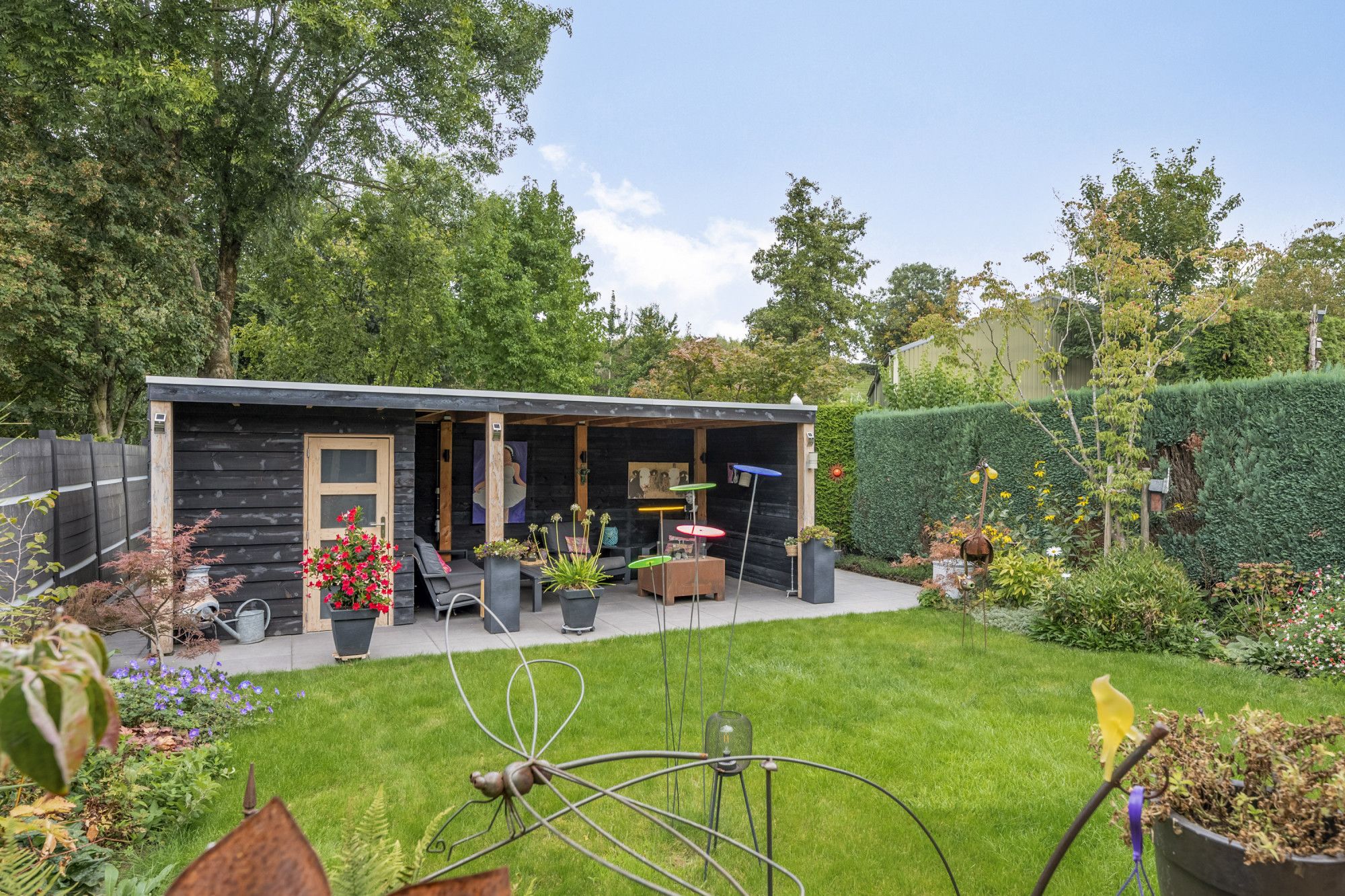 In de achtertuin bevindt zich nog een fijne houten berging met overkapping.
