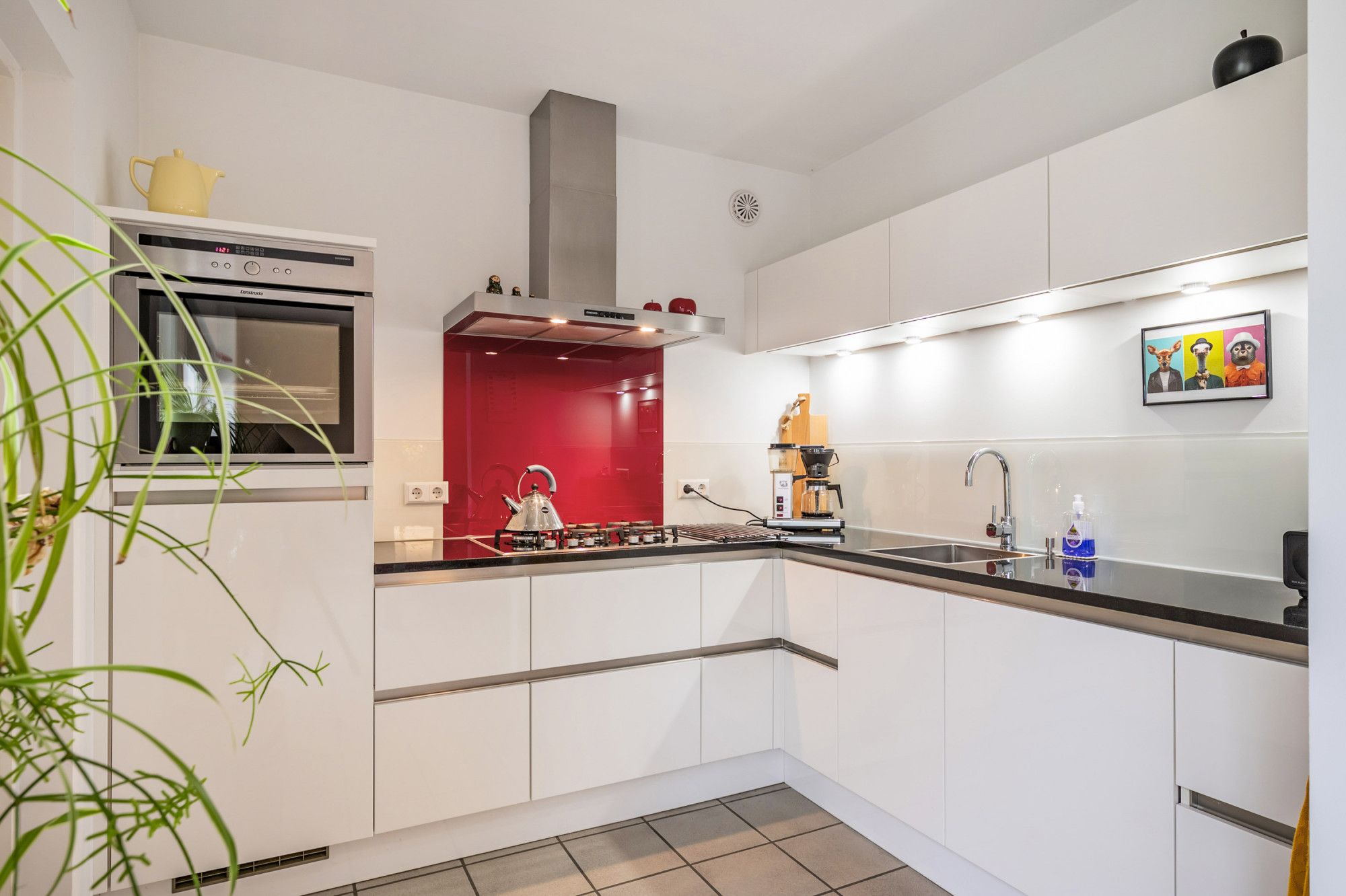 Halfopen keuken (2.60 x 2.40 m) met keukenopstelling. De keuken is voorzien van de volgende inbouw apparatuur: 5-pits gaskookplaat, afzuigkap, vaatwasser, koelkast en heteluchtoven.
