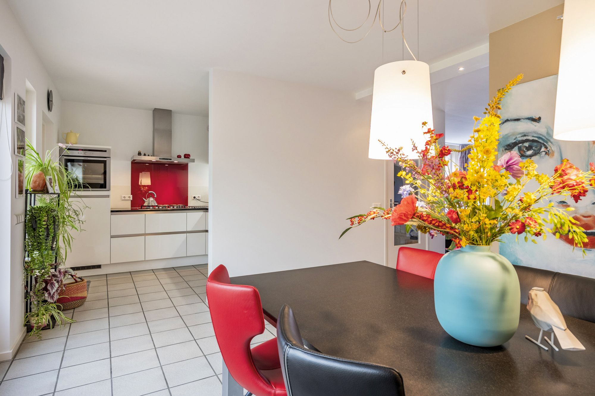 Eetkamer (4.10 x 3.50 m) voorzien van tegelvloer en dubbele openslaande tuindeuren naar de overkapping en achtertuin.