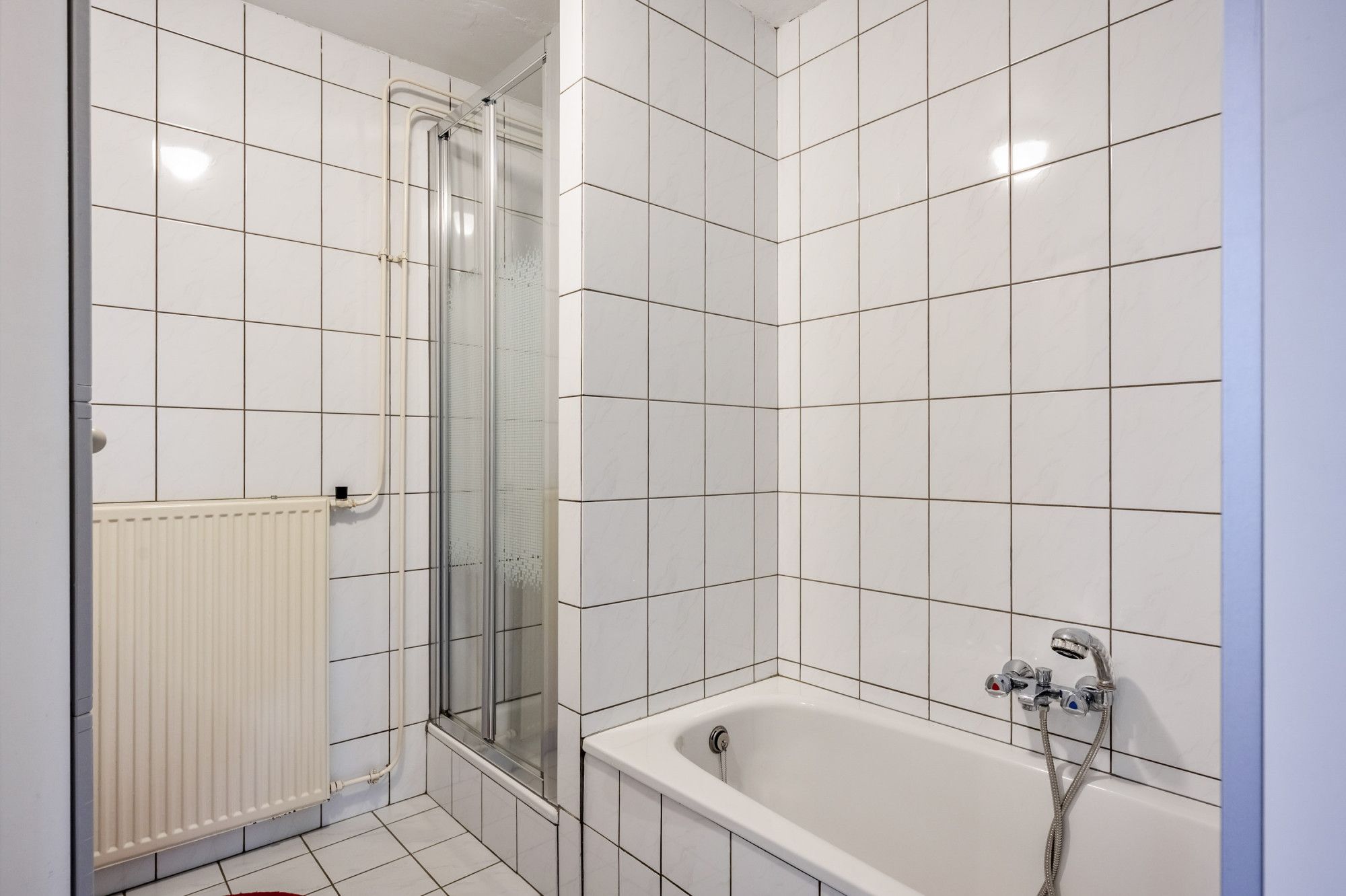 Badkamer (2.58 x 2.40 m) met ligbad, separate douche en vaste wastafel.