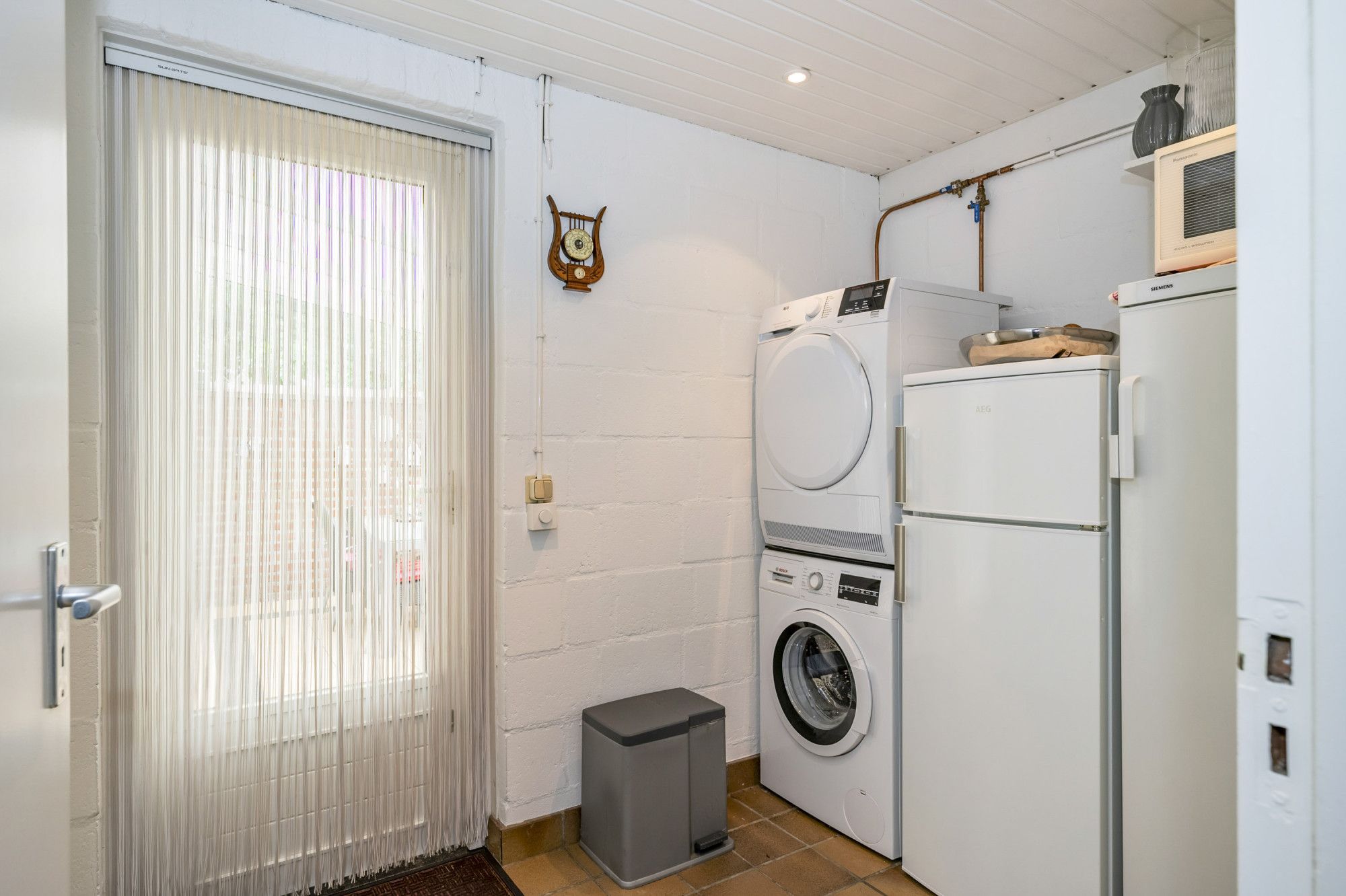 Bijkeuken (1.90 x 1.80 m) met aansluitpunten voor de witgoedapparatuur. Loopdeur naar de overkapping en de achtertuin.