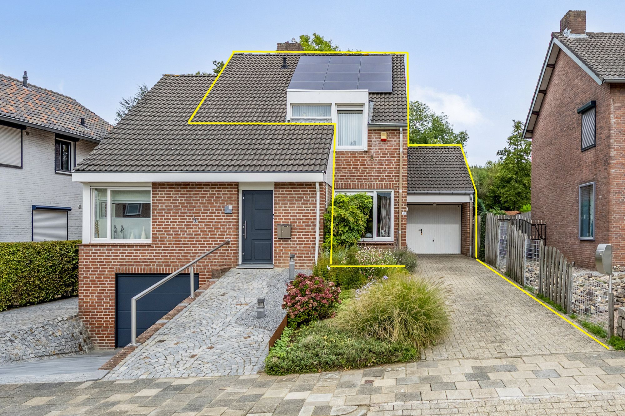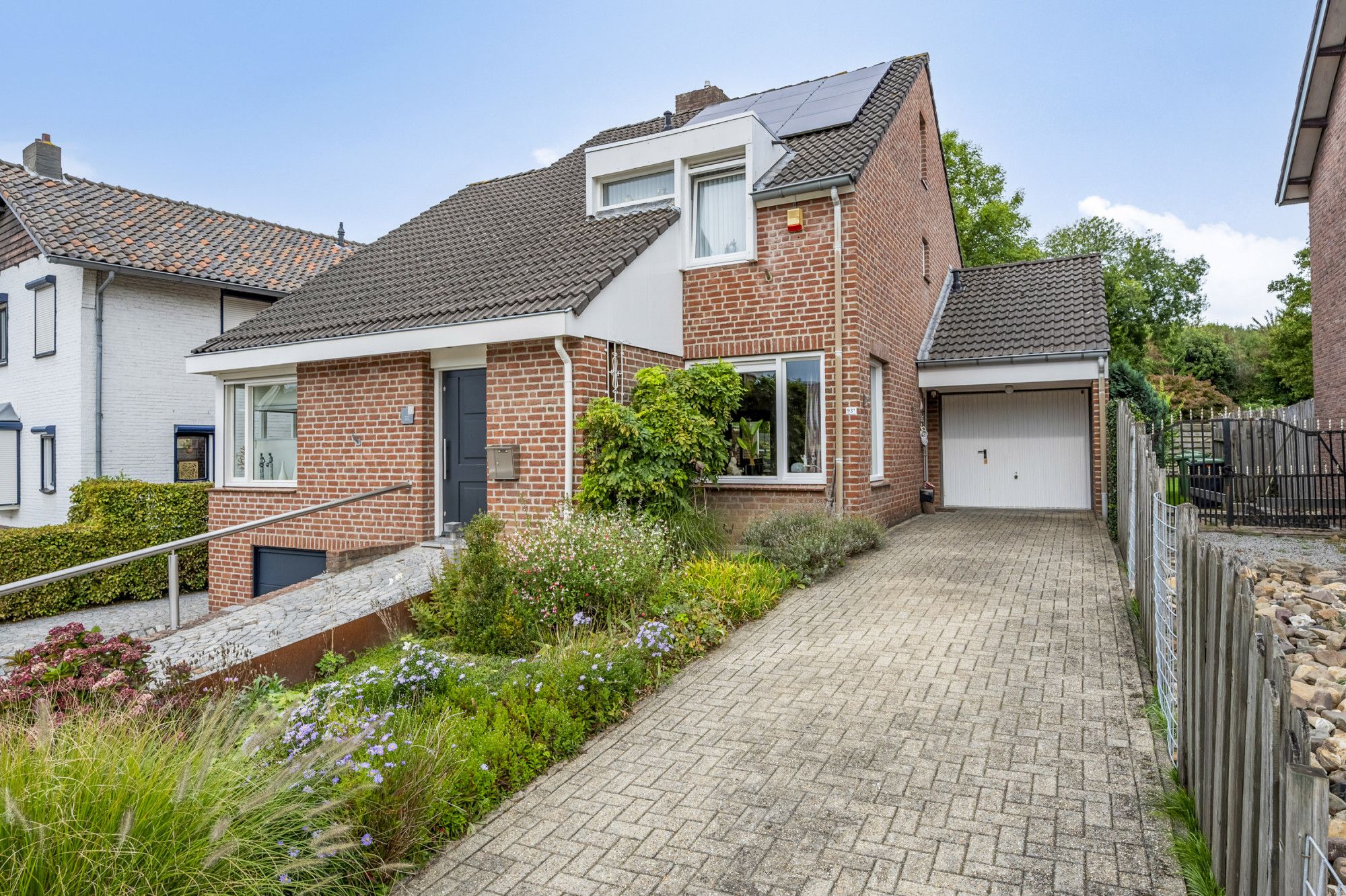 Voortuin met bestrating naar garage en entree.