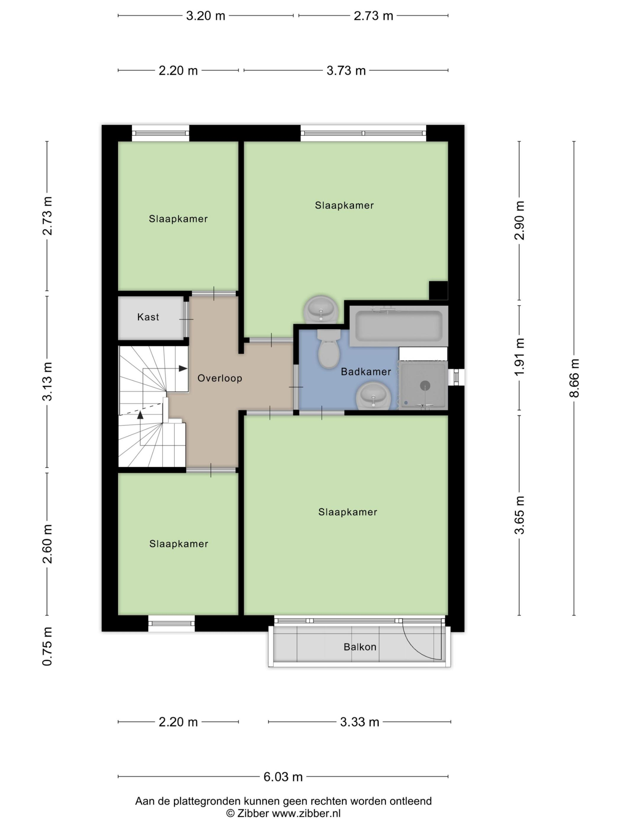 Via de vaste trap kom je op de overloop welke toegang geeft tot 4 slaapkamers, badkamer en vaste trap naar de zolder. De badkamer is voorzien van een ligbad, apparte douche, wastafel en tweede toilet. De slaapkamers zijn voorzien van een lichte vloerbedekking en hebben een oppervlakte van respectievelijk 6 m2, 6 m2, 11 m2 en 12 m2.