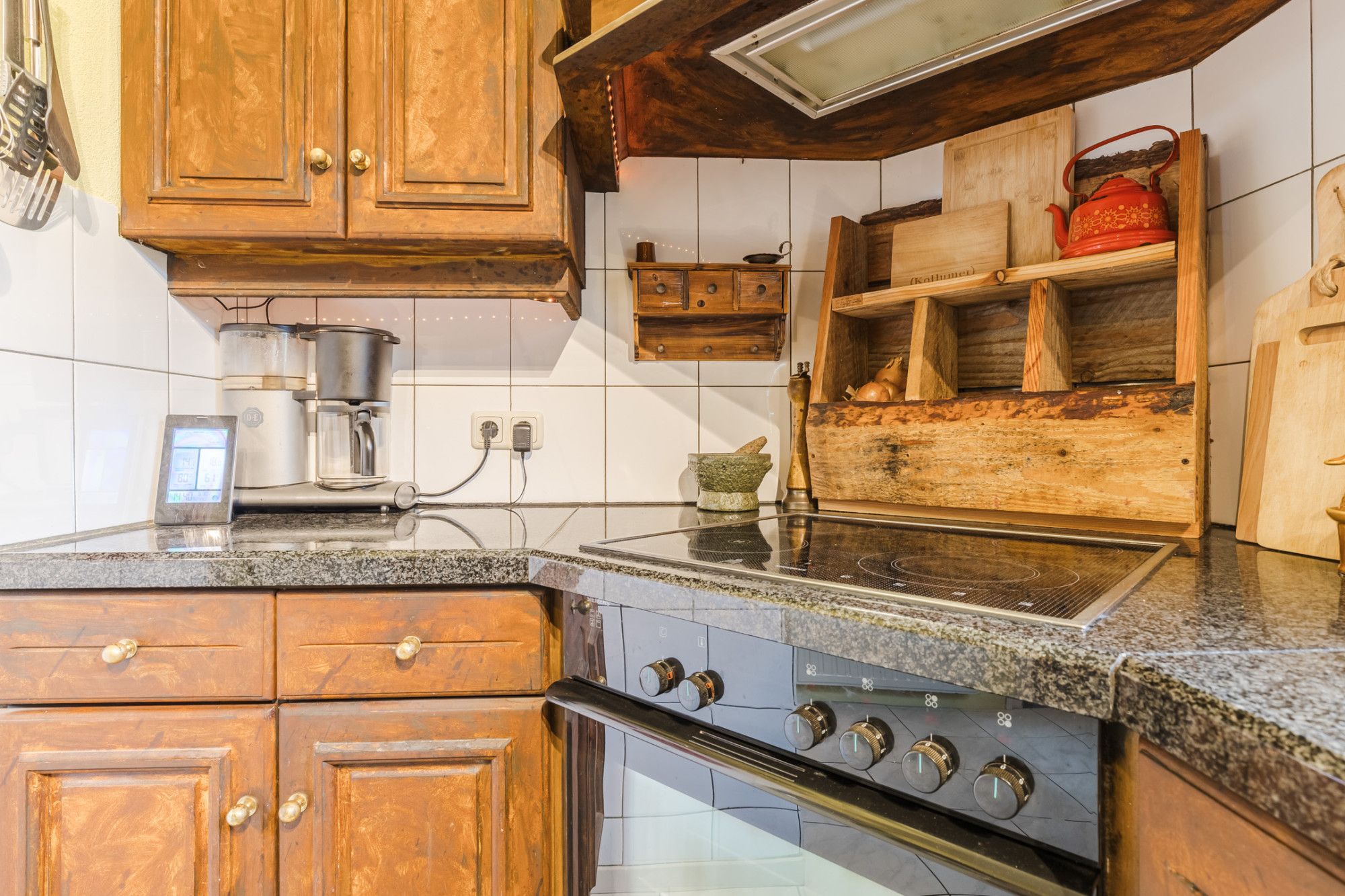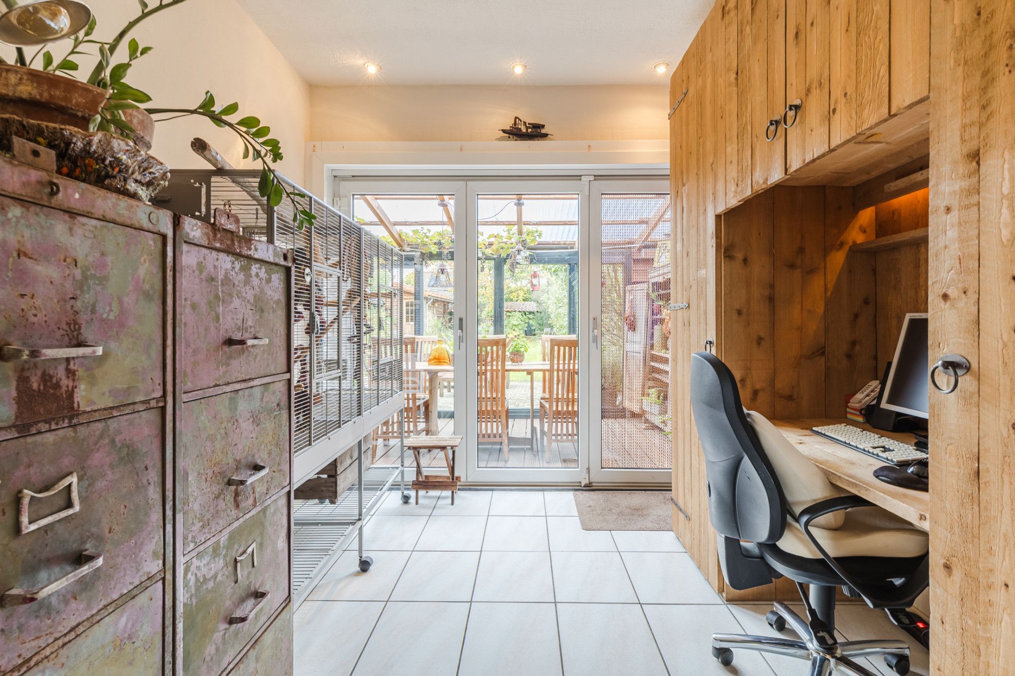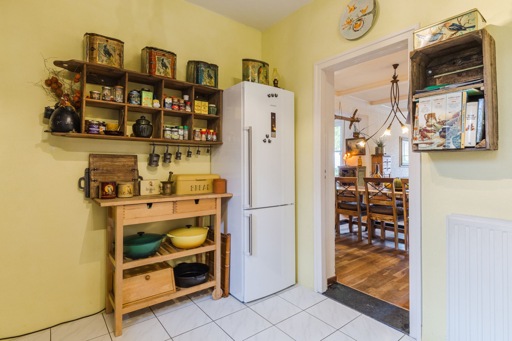 Keuken in de achteraanbouw (gedateerde opstelling) met tuinkamer