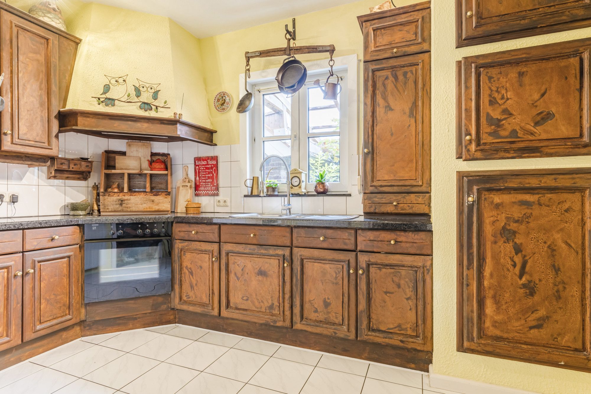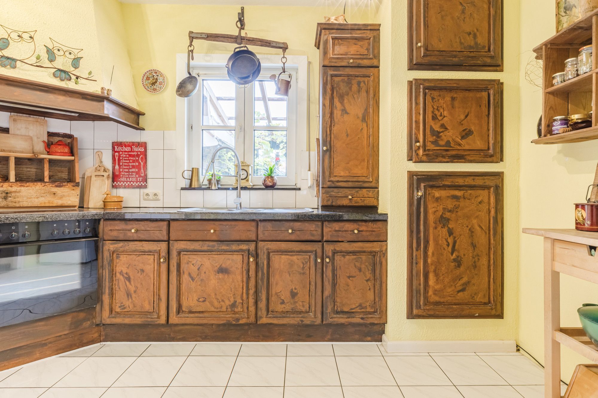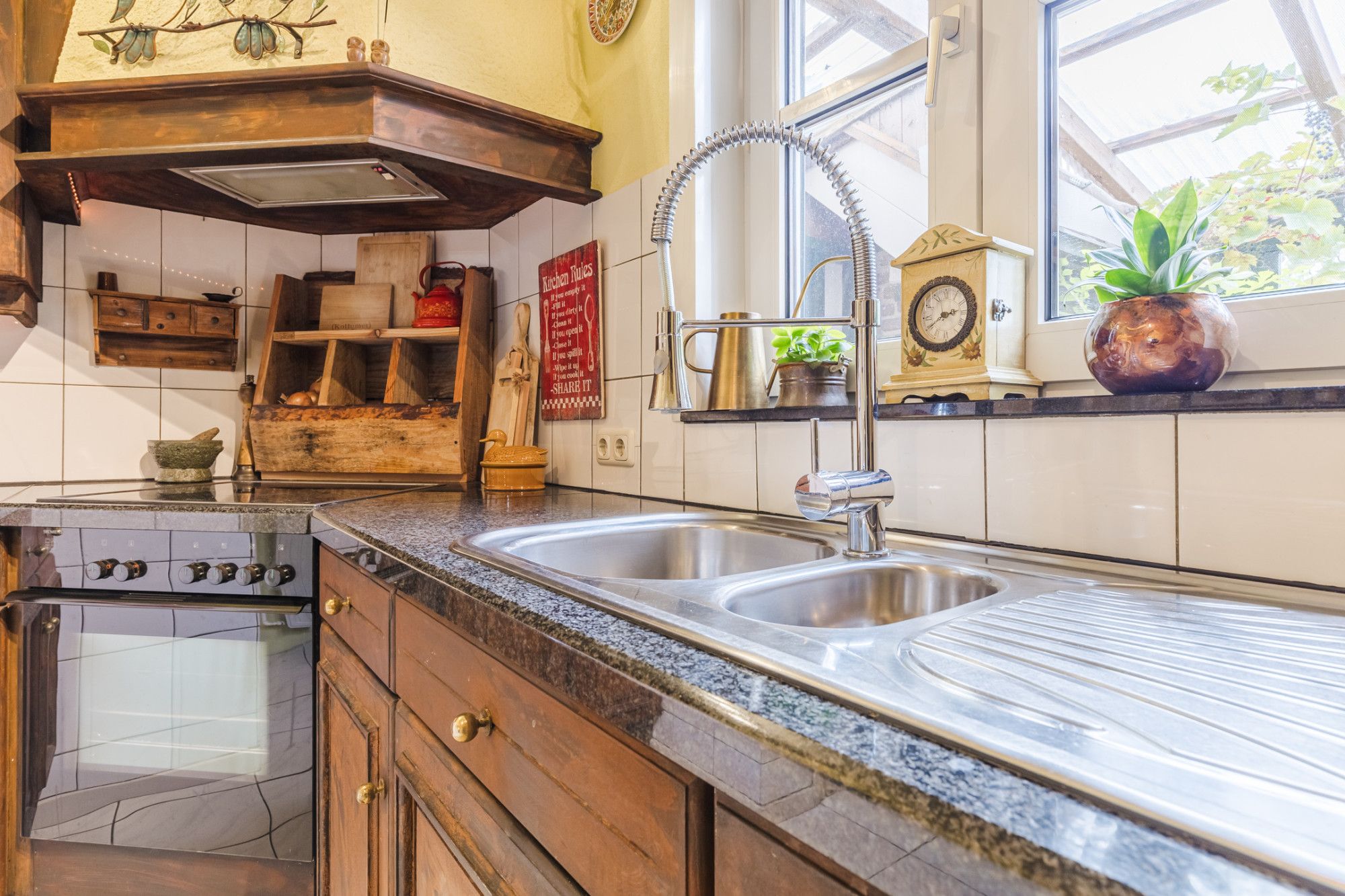 Keuken in de achteraanbouw (gedateerde opstelling) met tuinkamer