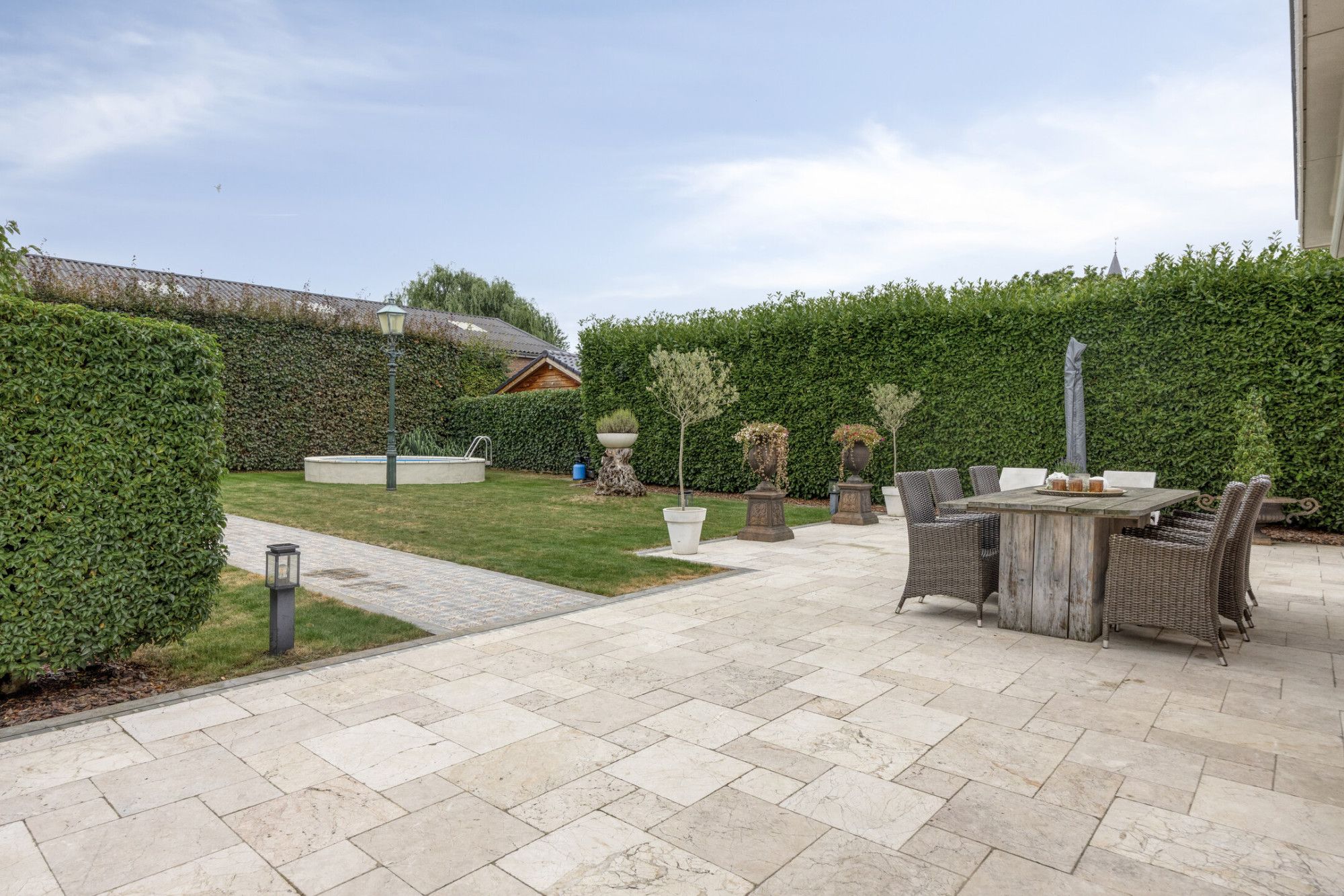 Prachtige tuin met een buitenzwembad en een terras, ideaal voor zomerse dagen.