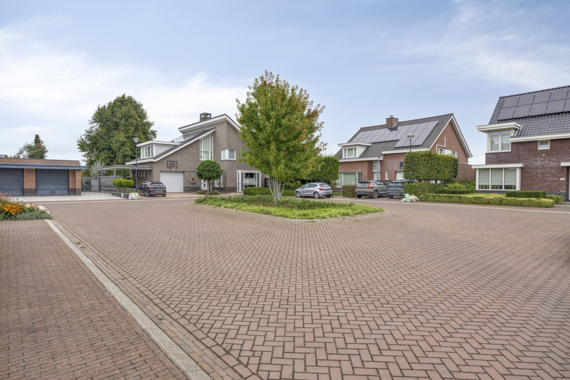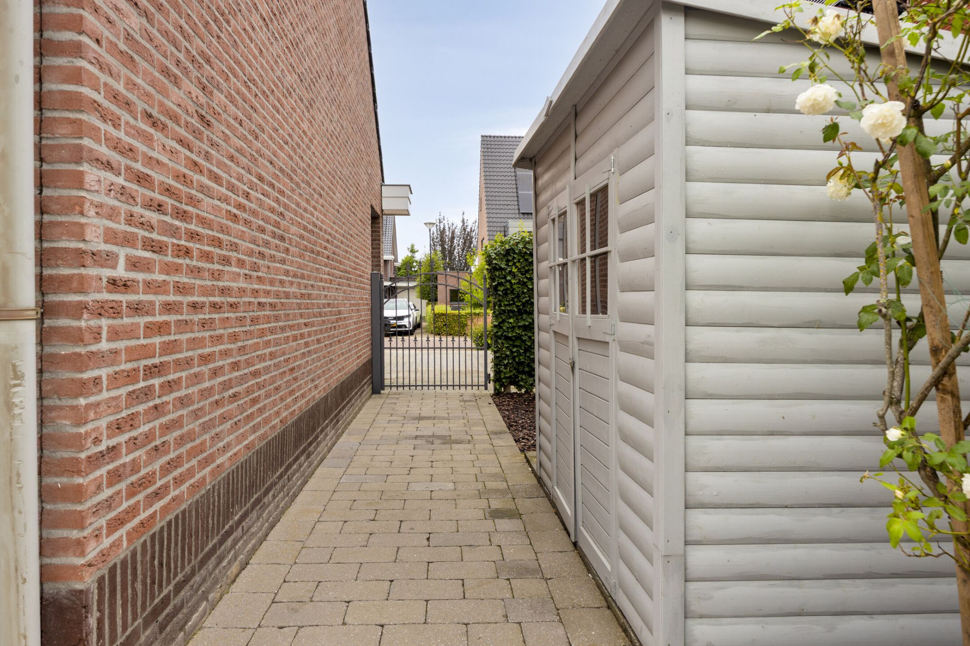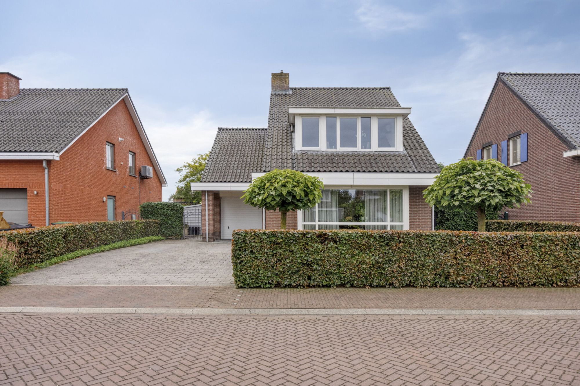 Aangrenzende garage met kleine overkapping aan de voorzijde voor extra gemak.