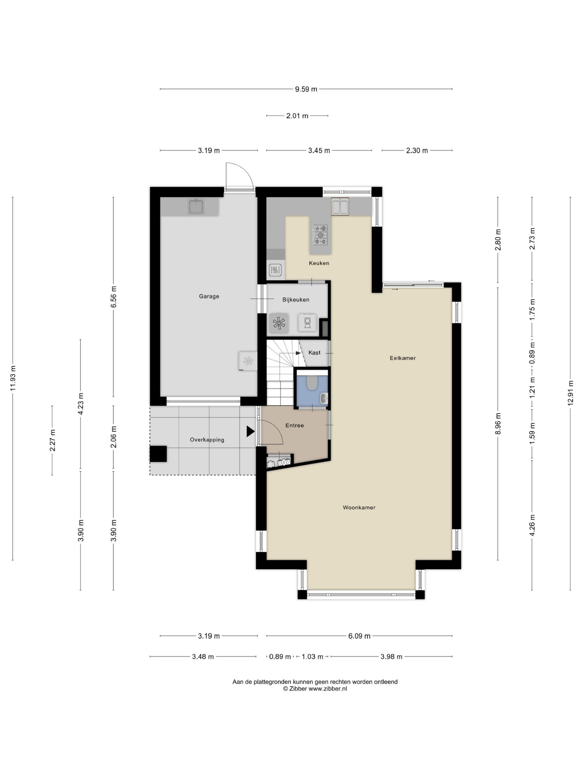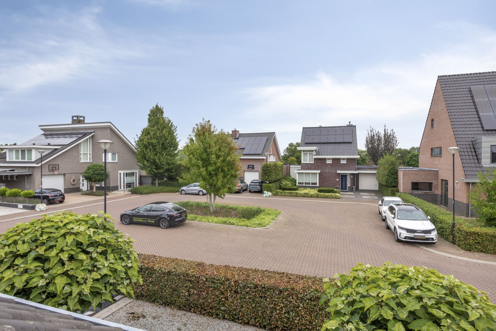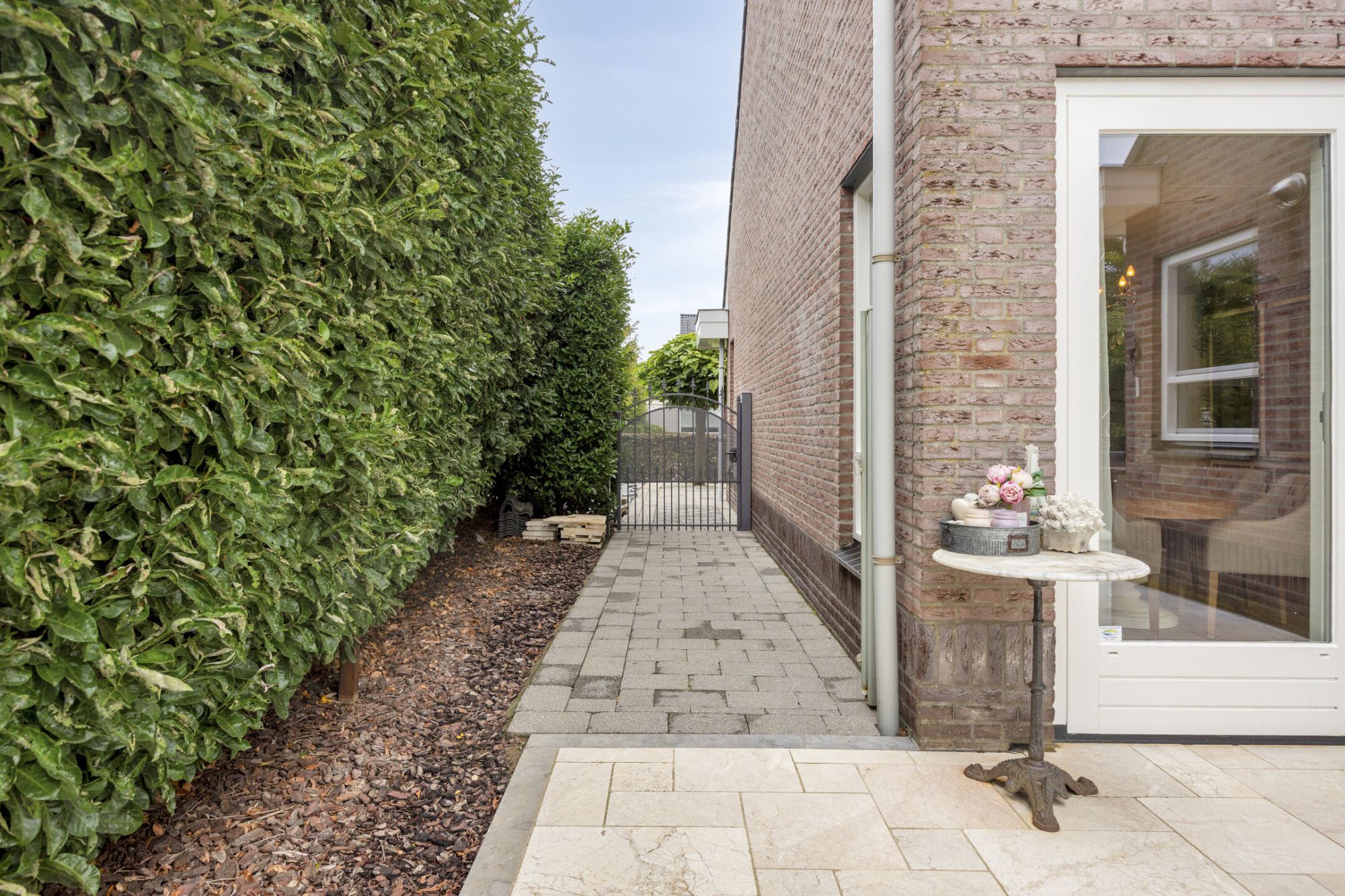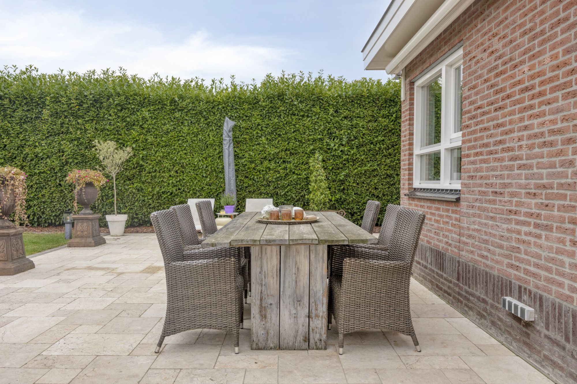 Aangrenzende garage met kleine overkapping aan de voorzijde voor extra gemak.