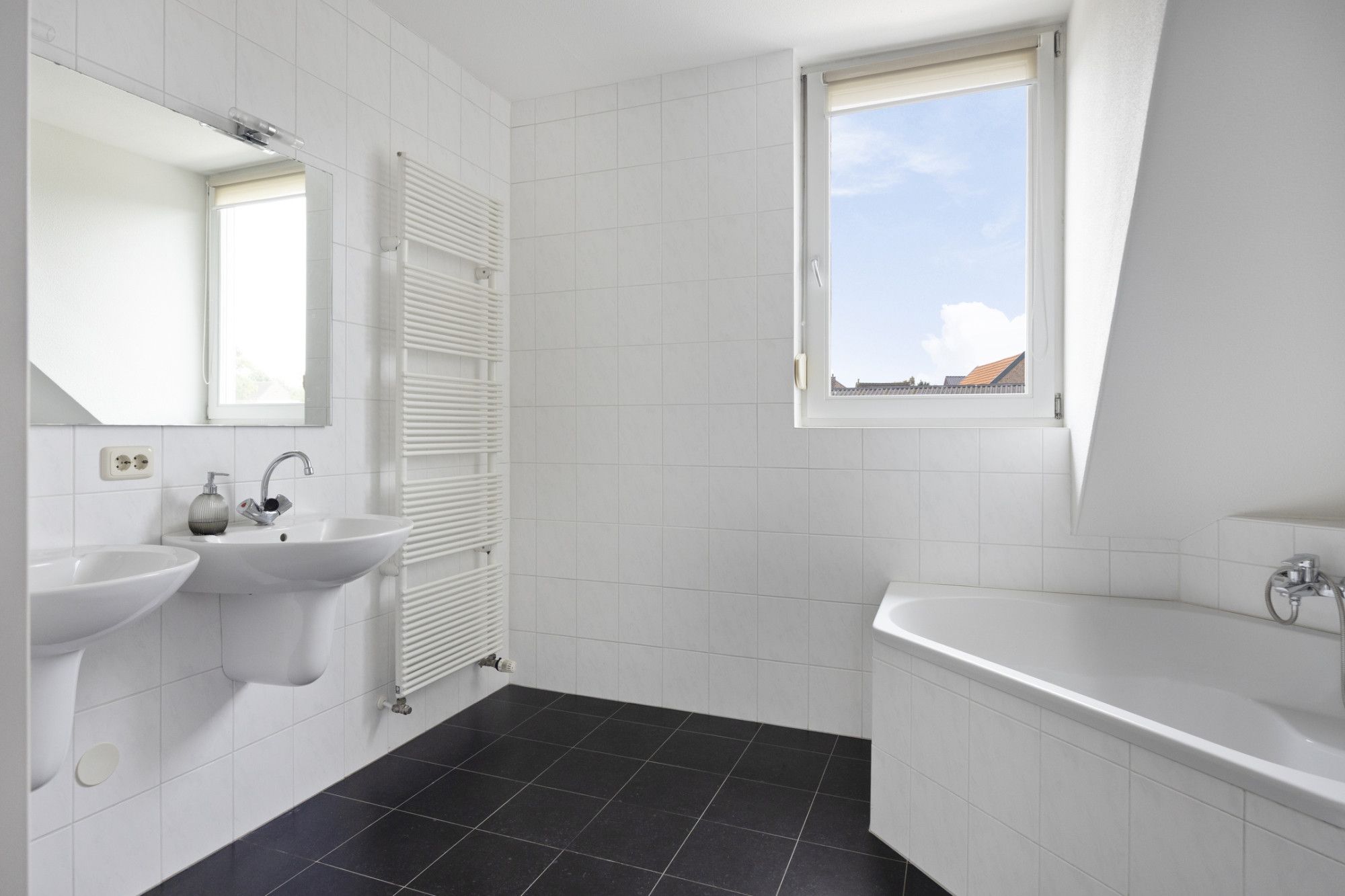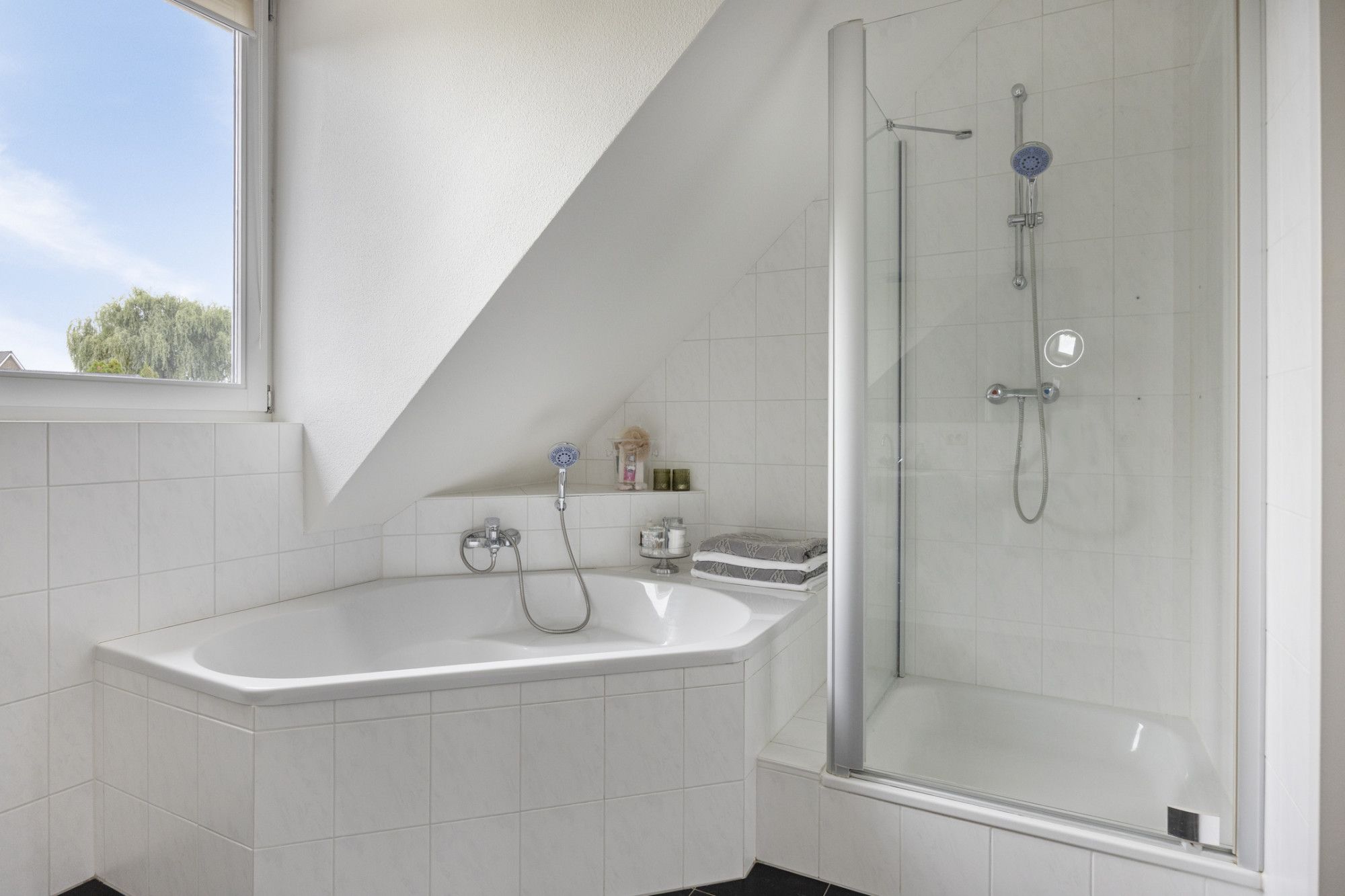 Moderne badkamer met luxe voorzieningen: een heerlijk hoekbad, een inloopdouche en een dubbele vaste wastafel.
