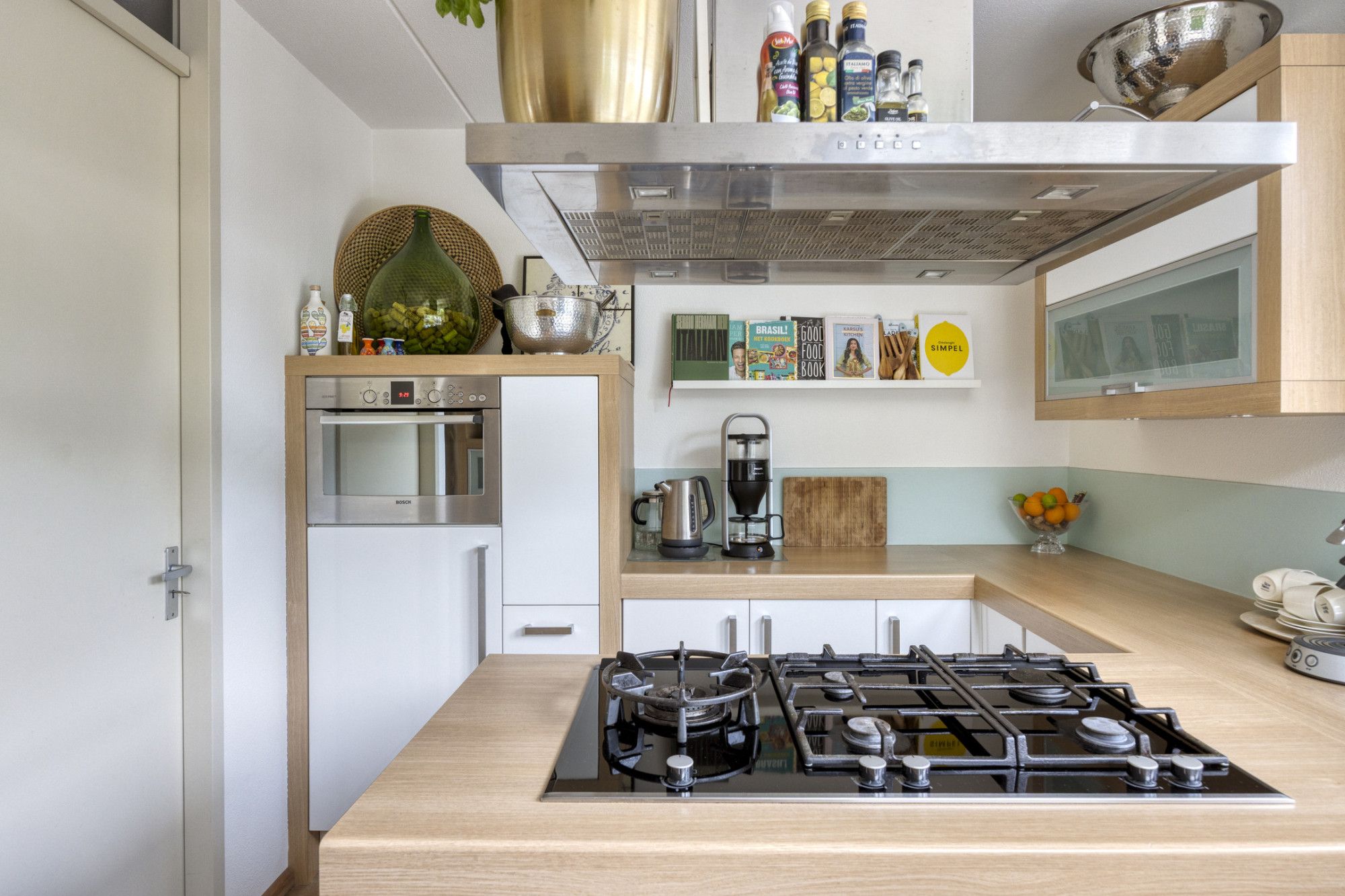 Open keuken, voorzien van diverse inbouwapparatuur zoals een afzuigkap, combi-oven, koelkast, vaatwasser en gaskookplaat.