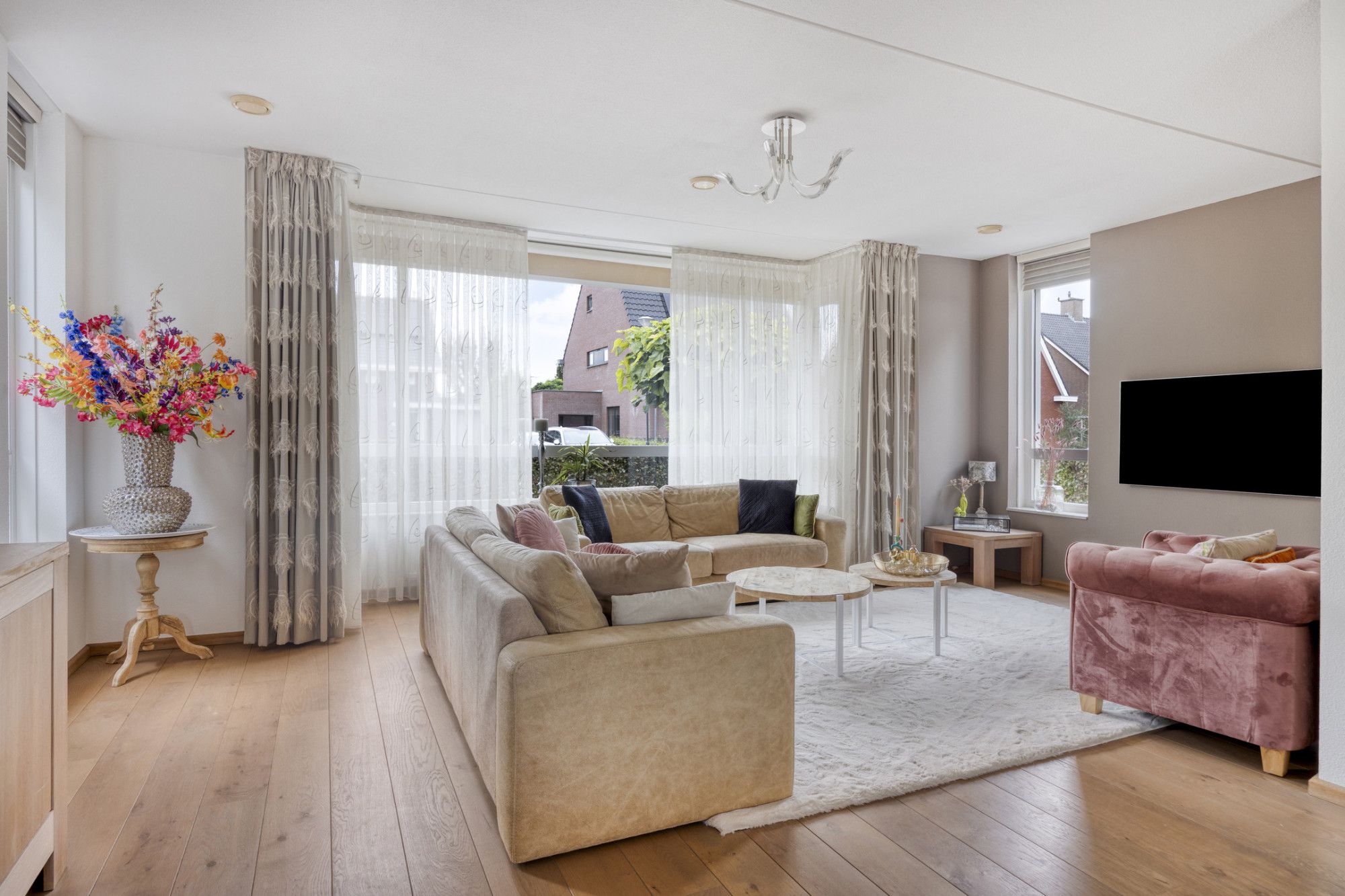 Royale woonkamer met een prachtige houten parketvloer, ideaal voor gezellige momenten met familie en vrienden.