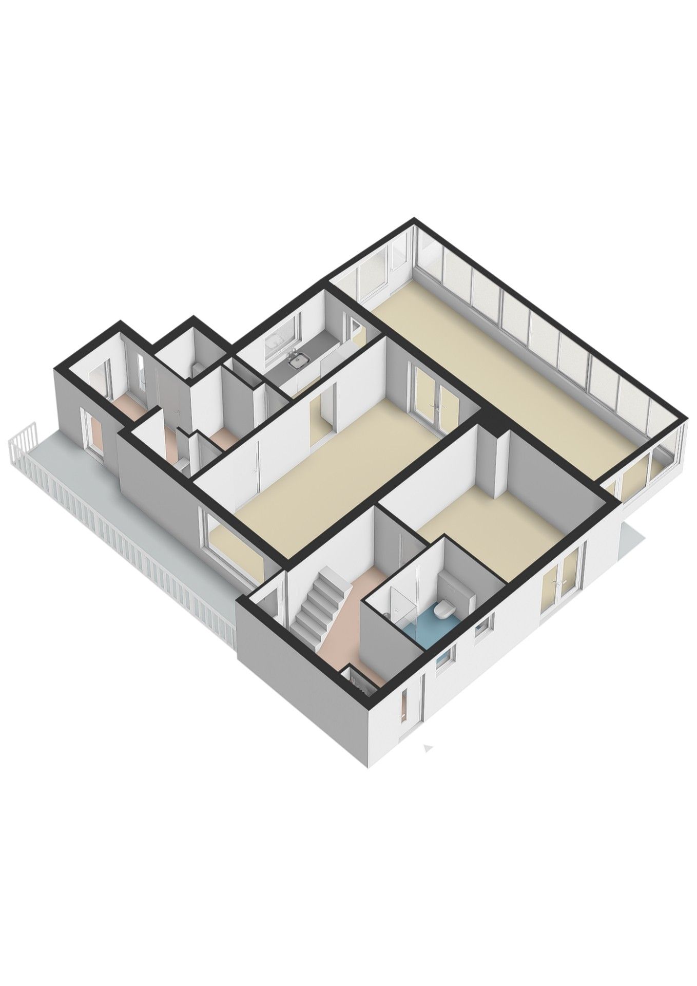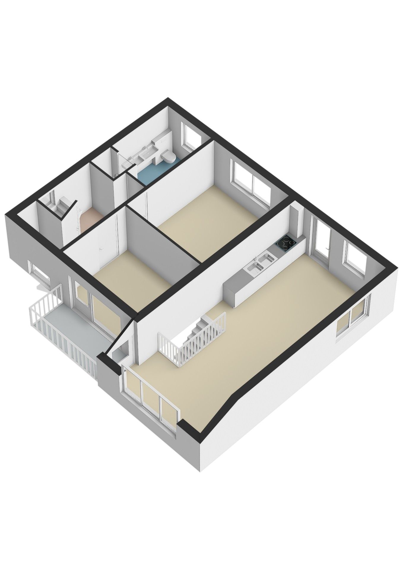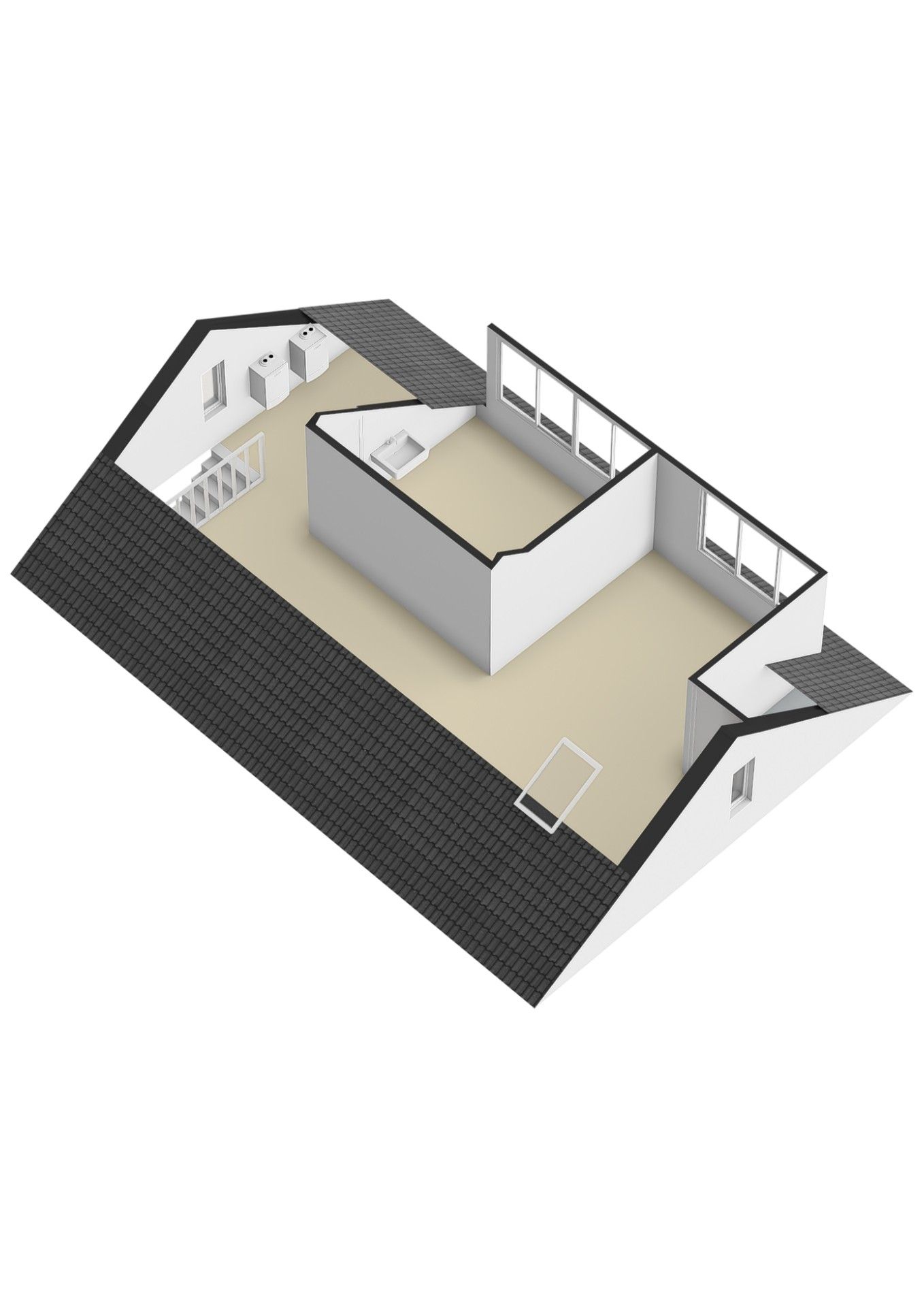 Middels vaste trap bereikbare woonkamer met open keuken. De keuken beschikt over een eenvoudige aanbouwkeuken in rechte opstelling. De ruimte (ca. 37 m²) beschikt over veel lichtinval en een fraaie laminaatvloer. Door deze ruimte bij de hoofdwoning te betrekking, kan het aantal slaapkamers op de 1e verdieping ook vergroot worden.