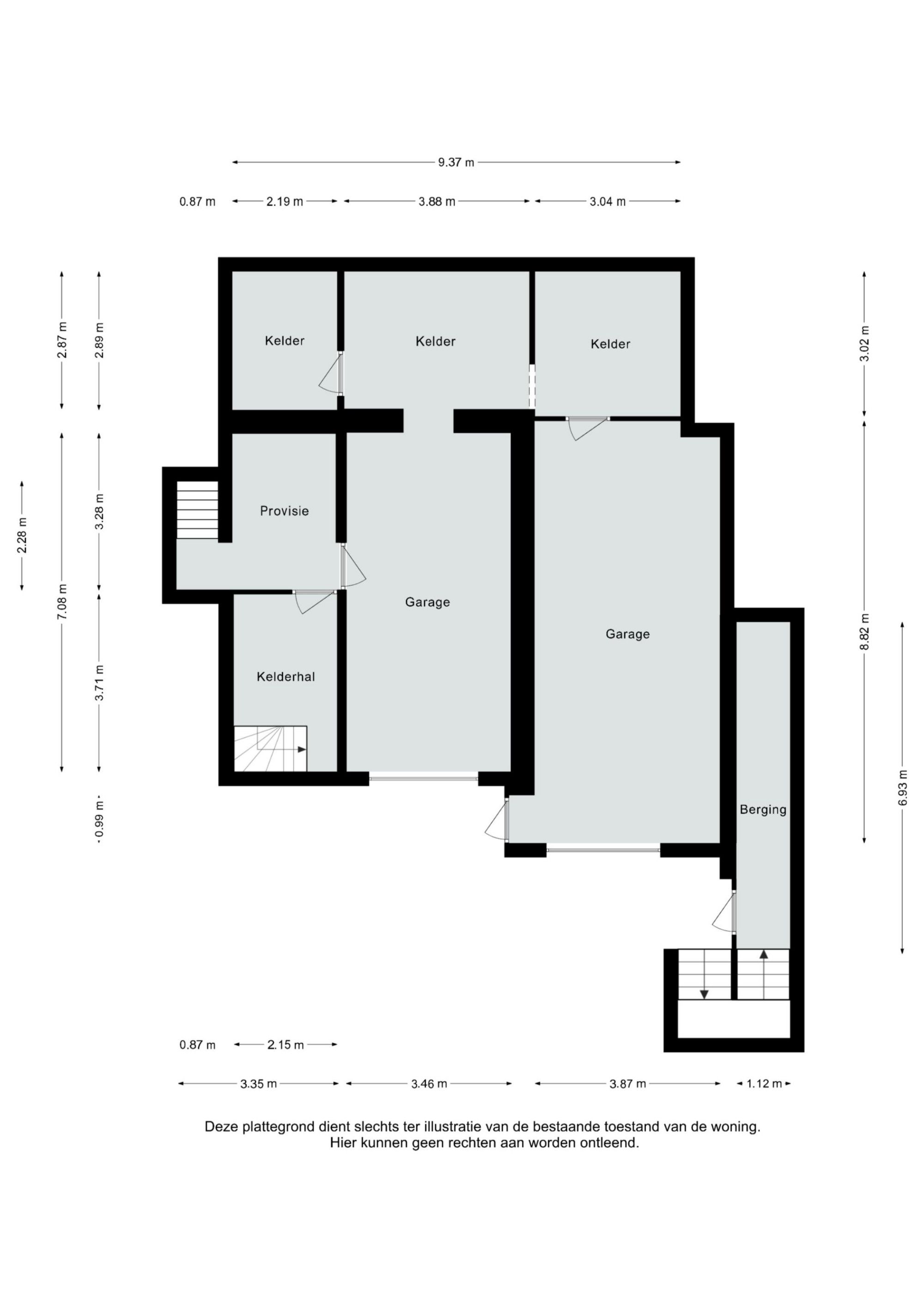 De woning is volledig onderkelderd en zowel vanuit de entree/hal van de woning alsook via een van de garages bereikbaar. Vanuit de entree/hal is allereerst een provisiekelder met aansluitend 2 bergingen (ca. 7 en 4 m²), van waaruit de eerste garage inpandig bereikbaar is. De garage (ca. 19 m²) beschikt over een elektrische sectionaal poort en wateraansluiting. Achter de garage is een inpandige berging (ca. 7 m²) gelegen, met toegang tot een 4e bergruimte (ca. 11 m²) die toegang biedt tot de tweede garage. De garage (ca. 28 m²) is eveneens voorzien van een elektrische sectionaal poort, krachtstroom en wateraansluiting.