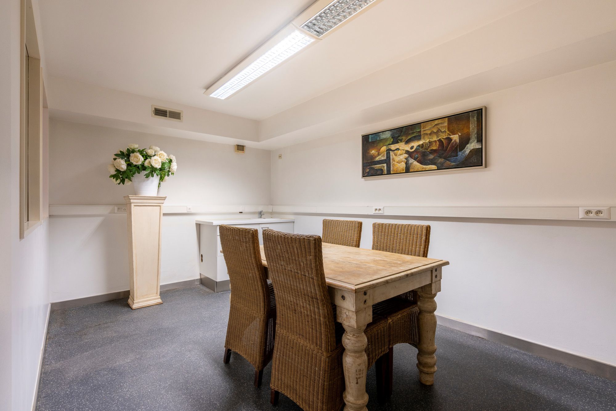 The professional/practice area on the ground floor consists of a reception and waiting area, two treatment rooms, and a shower room. An internal staircase leads to three additional treatment rooms on the upper floor. All rooms are fitted with a water connection and a single washbasin. In addition, the practice area is equipped with a heat pump. The practice section also provides access to the basement level underneath the entire property, offering space for storage, a relaxation area, and technical rooms.