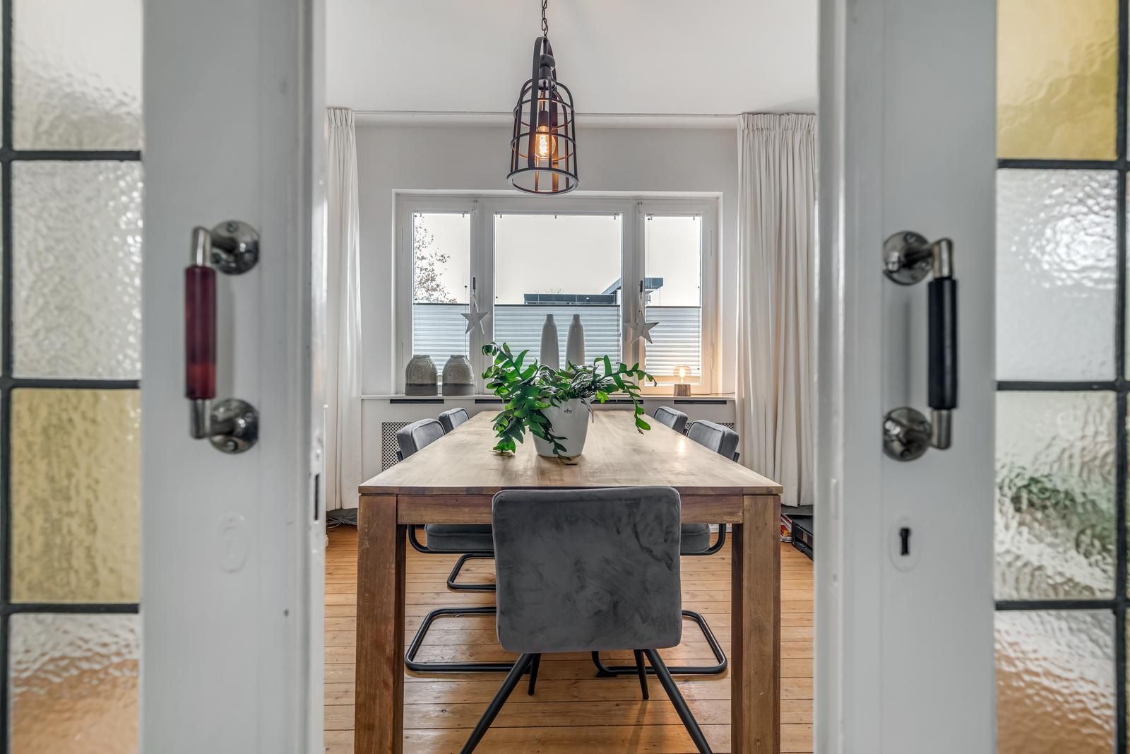 Sfeervolle woonkamer met mooie authentieke ansuite schuifdeuren, voorzien van mooie hard houten plankenvloer met eetkamer.
