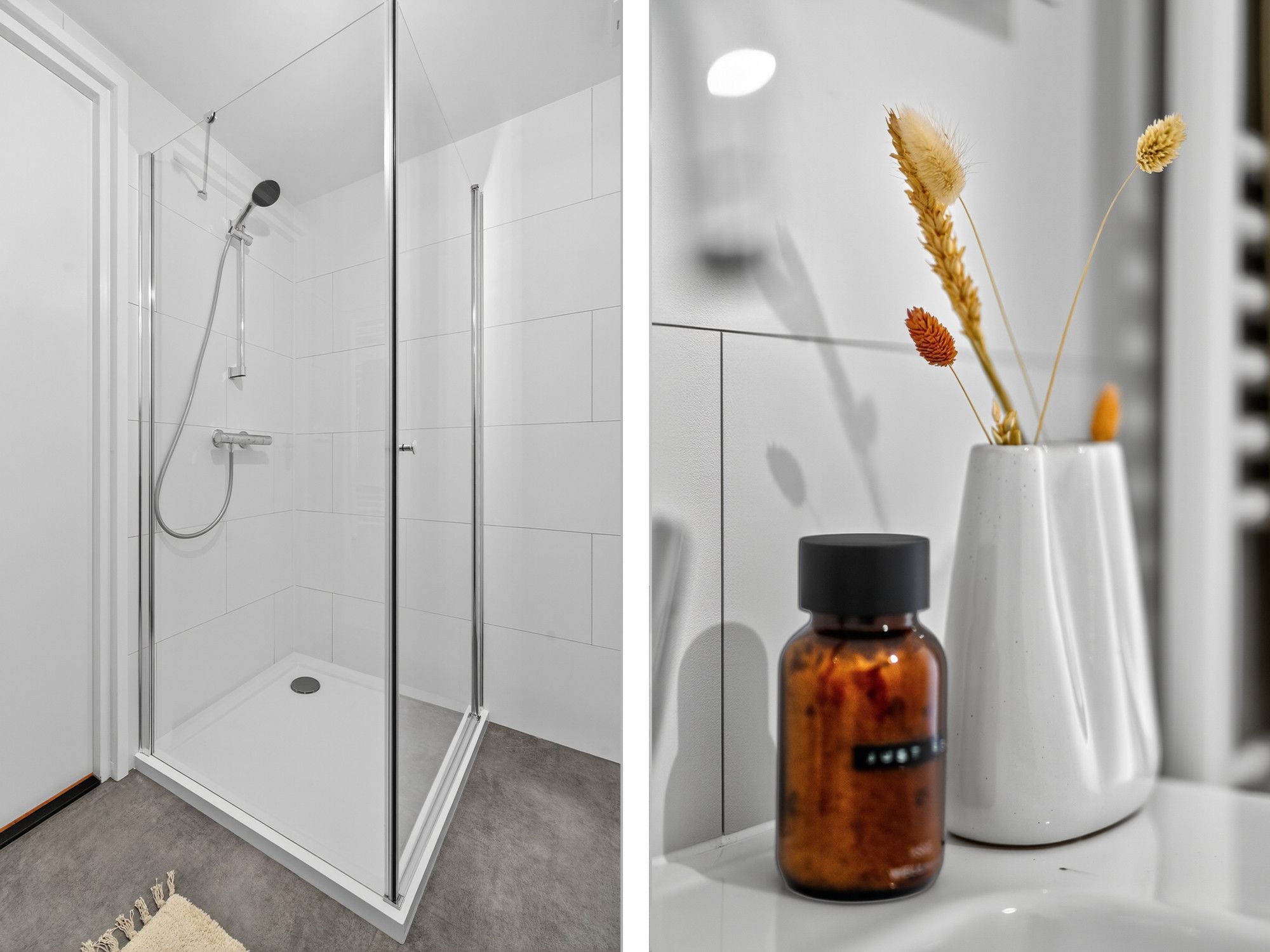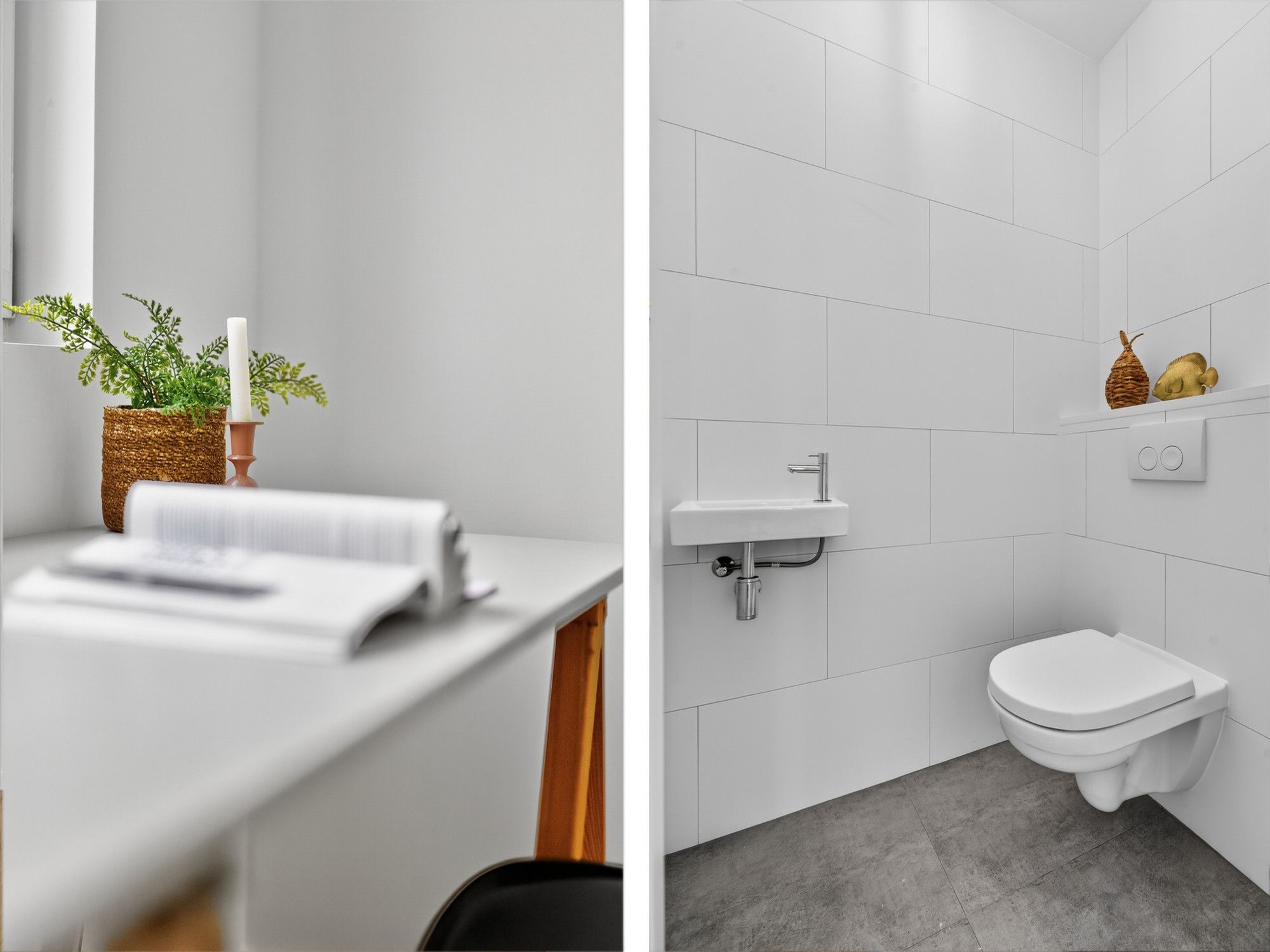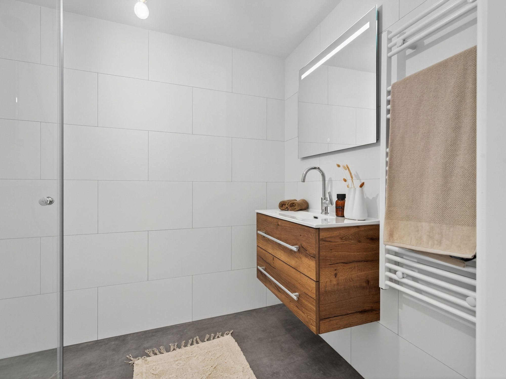 De badkamer, bereikbaar via de slaapkamer aan de achterzijde, is volledig betegeld en voorzien van een wastafel met meubel, designradiator en douche. Het aparte toilet is eveneens volledig betegeld en beschikt over een fonteintje.