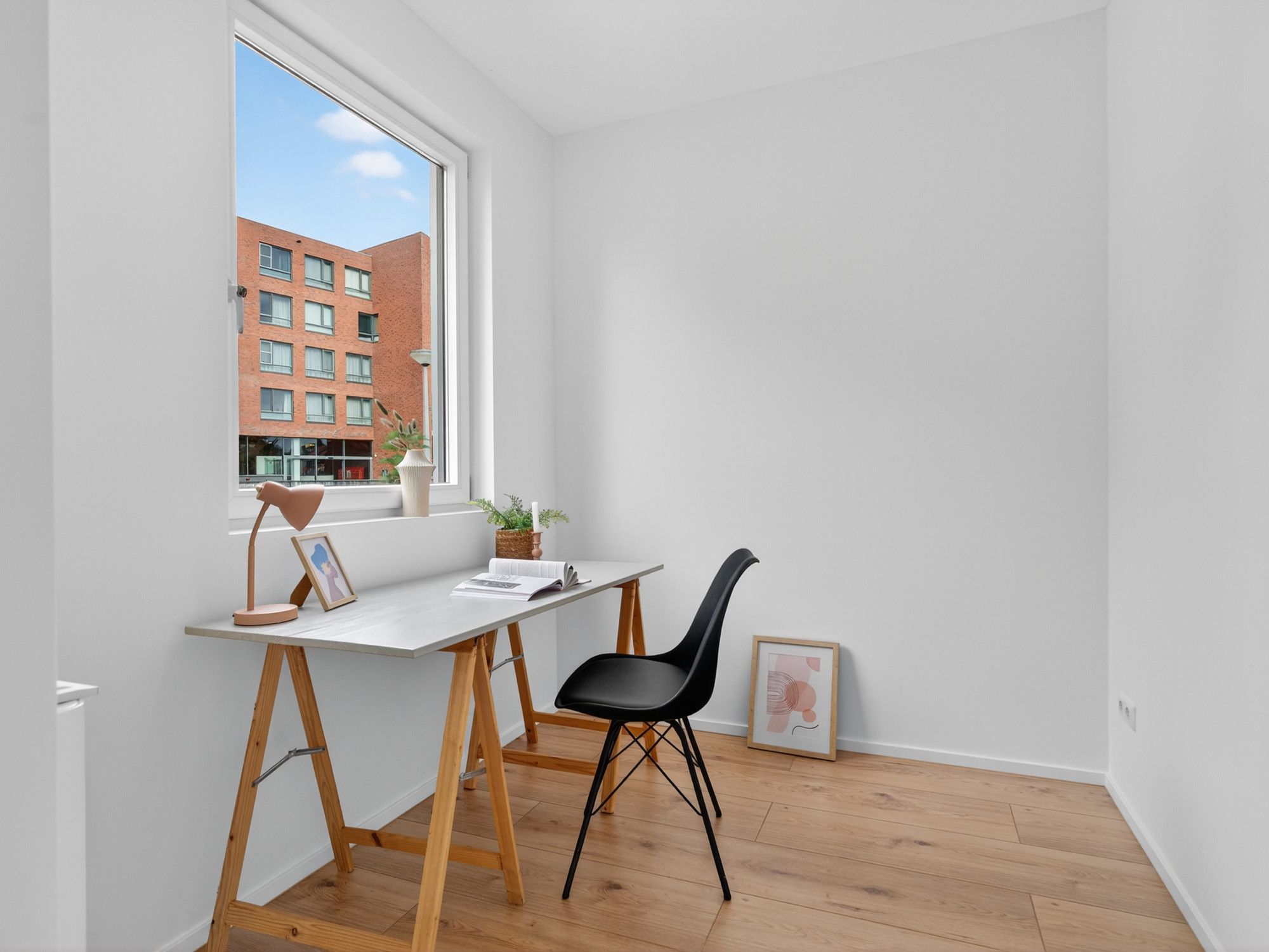Bij binnenkomst in de hal vind je toegang tot de woonkamer met open keuken, de meterkast, het toilet en de eerste slaapkamer aan de voorzijde van de woning. De lichte woonkamer heeft een prettige indeling en staat in open verbinding met de moderne keuken, die is uitgerust met een combi-oven, koelkast, 4-pits inductiekookplaat, vaatwasser, afzuigkap en wasbak. Vanuit de woonkamer bereik je de patiotuin, de wasruimte en de tweede slaapkamer aan de achterzijde van de woning.