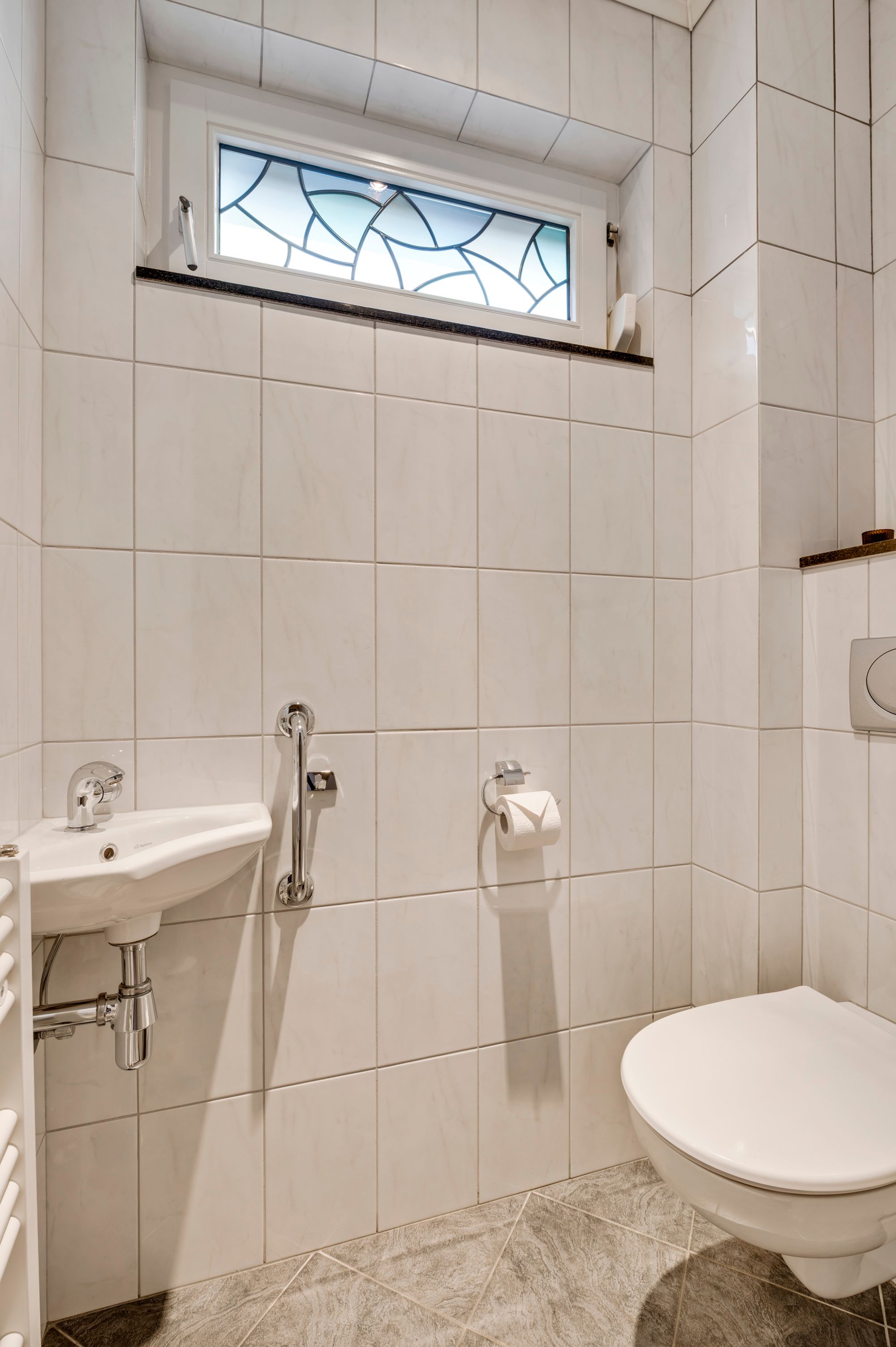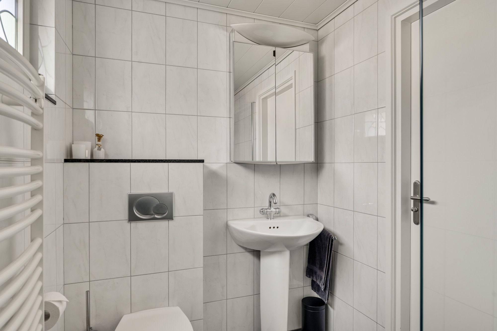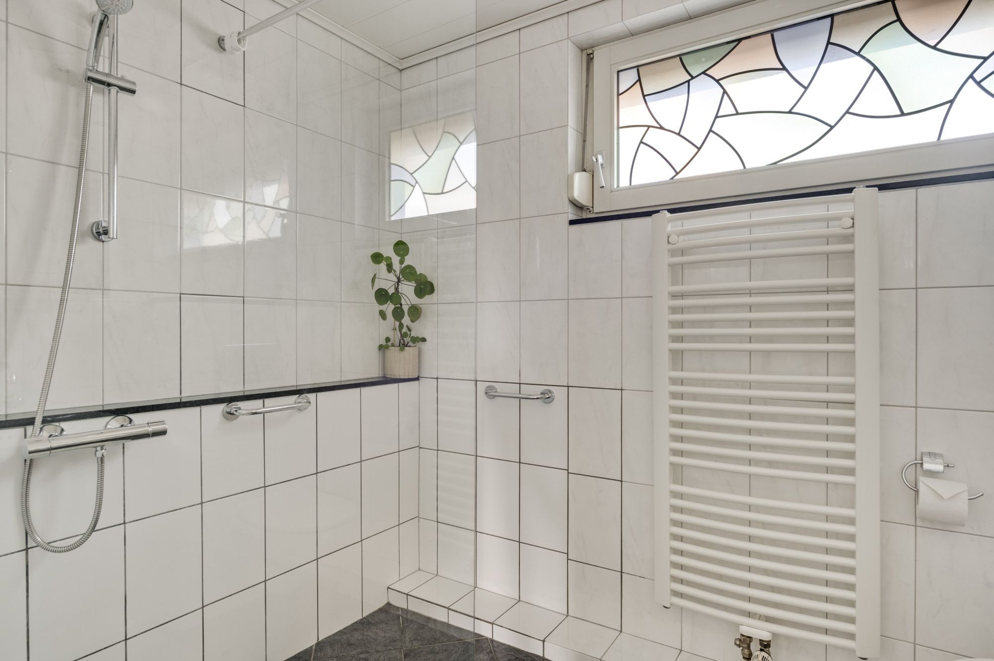 De overloop biedt toegang tot drie comfortabele slaapkamers en de fijne badkamer. Deze badkamer is netjes en modern afgewerkt en voorzien van een inloopdouche, toilet, wastafel en comfortabele vloerverwarming.