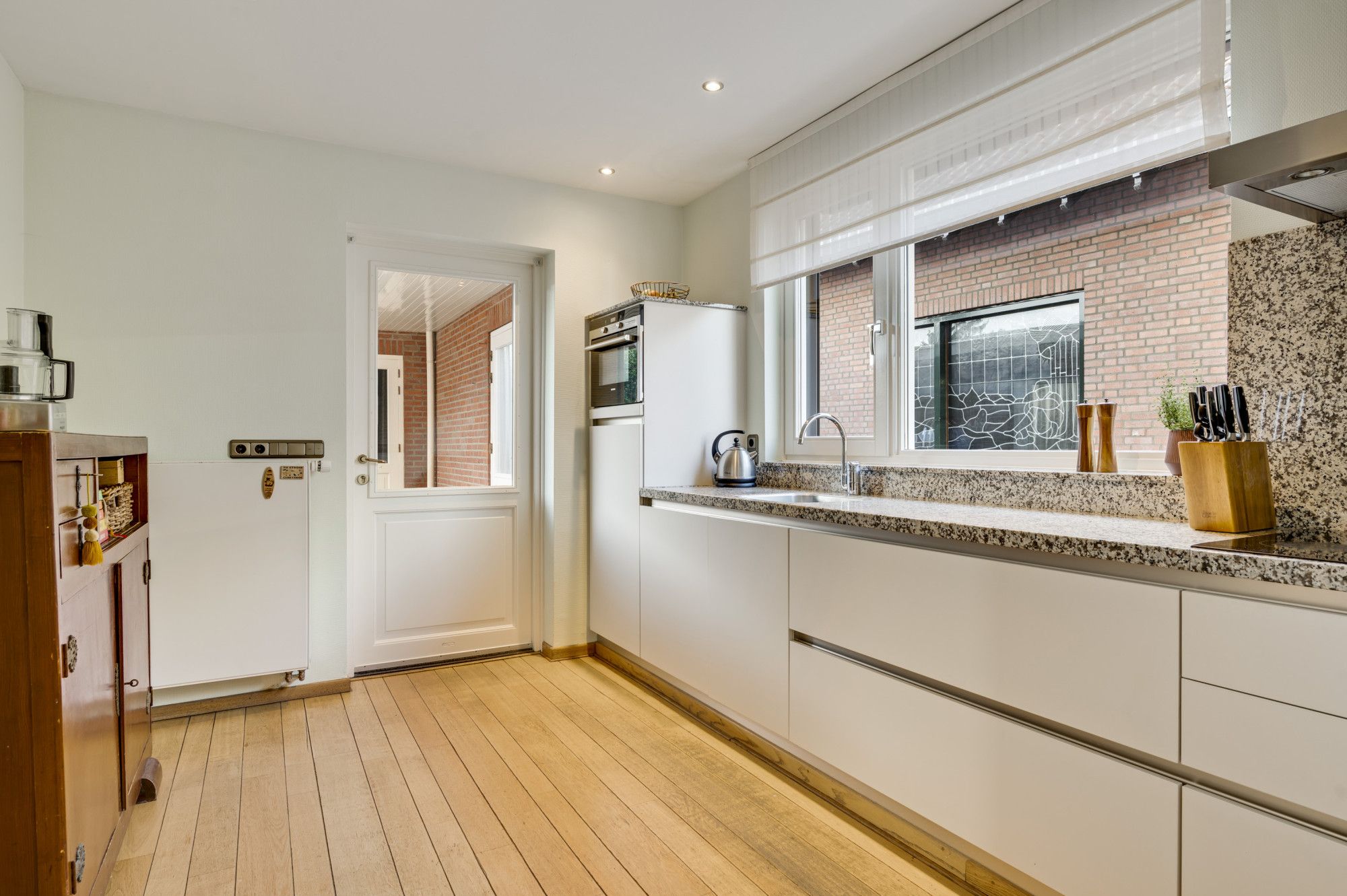 De entree van de woning is via de ruime ontvangsthal voorzien van een garderobe, meterkast, trapopgang naar de eerste verdieping en toiletruimte met zwevend toilet en fonteintje. De sfeervolle, zonnige woonkamer is voorzien van een massief eiken parketvloer, een gezellige schouwpartij, open haard en grote raampartijen, wat zorgt voor een prettige lichtinval en een mooi contact met de tuin. Aansluitend bevindt zich de woonkeuken, uitgevoerd met een moderne en luxe keukencombinatie met granieten werkblad en diverse inbouwapparatuur, te weten een inductiekookplaat, afzuigkap, koelkast, combi-oven en een vaatwasser. Vanuit de keuken heeft u direct toegang tot het terras met overkapping. Het overdekte terras vormt tevens een praktische, droge verbinding met de riante garage.