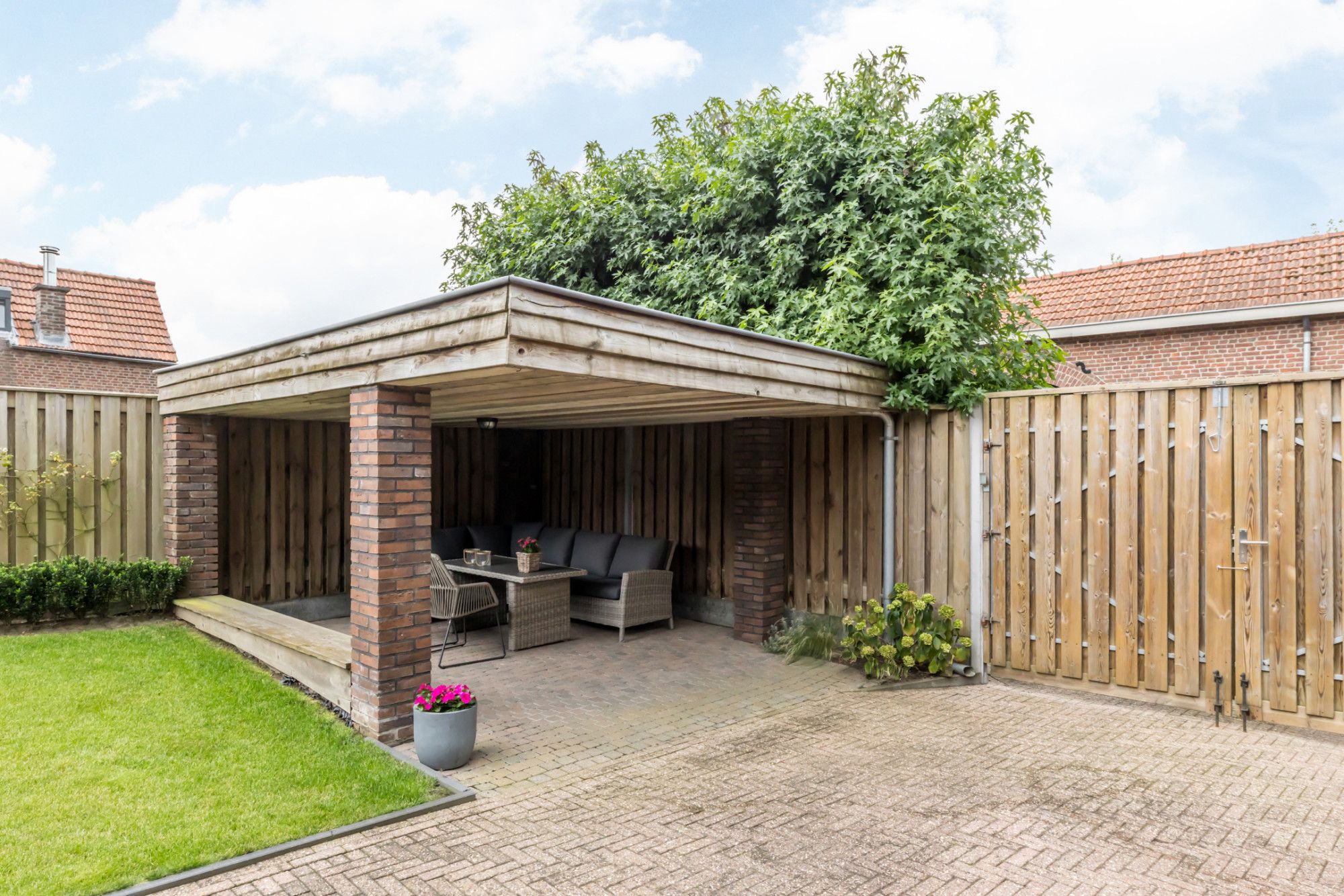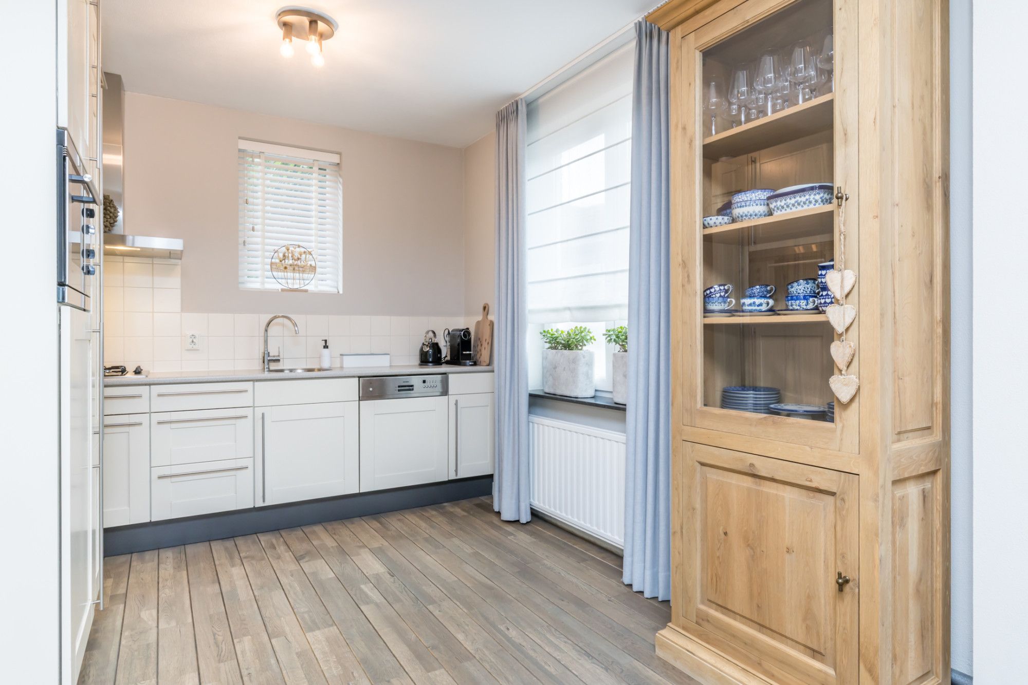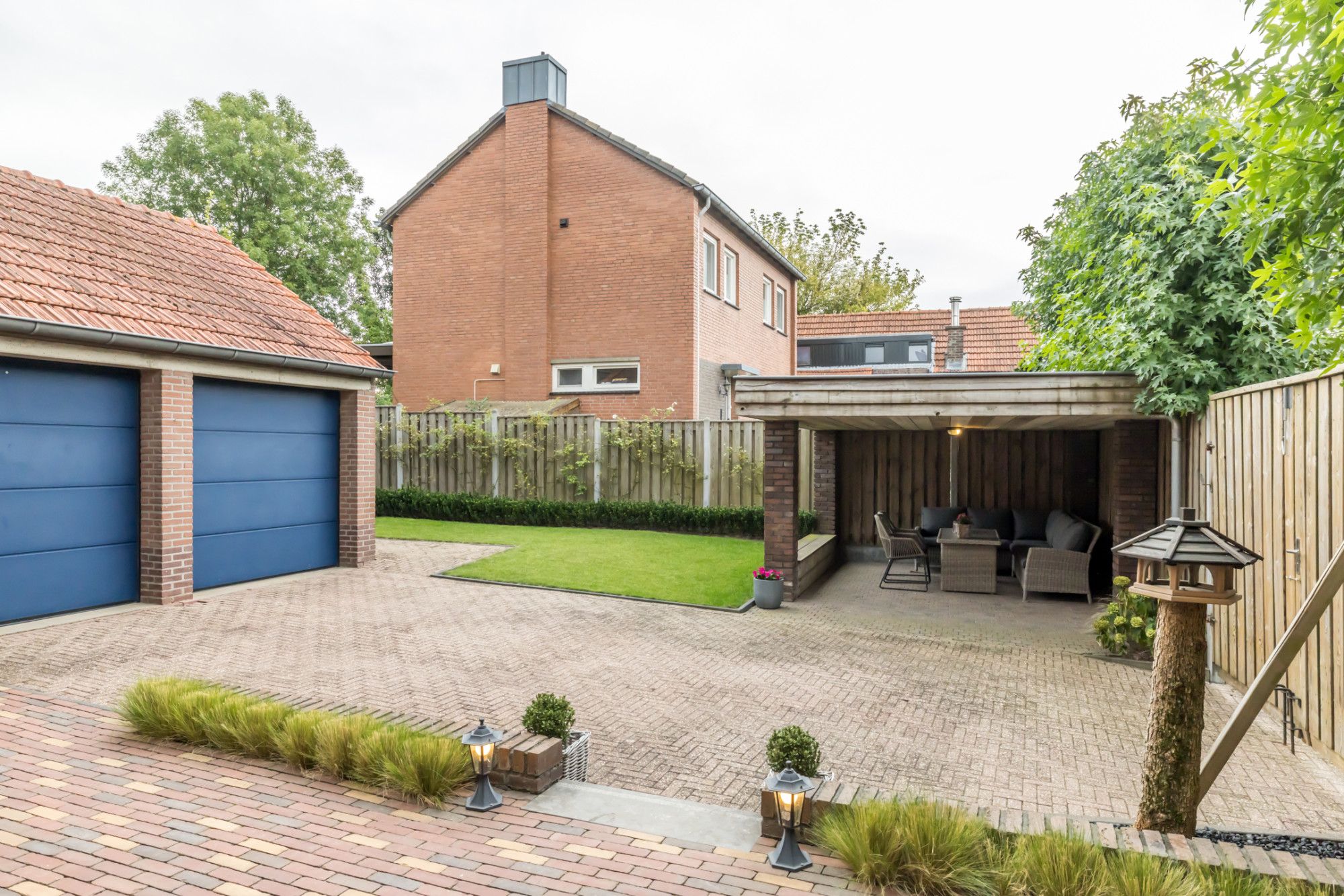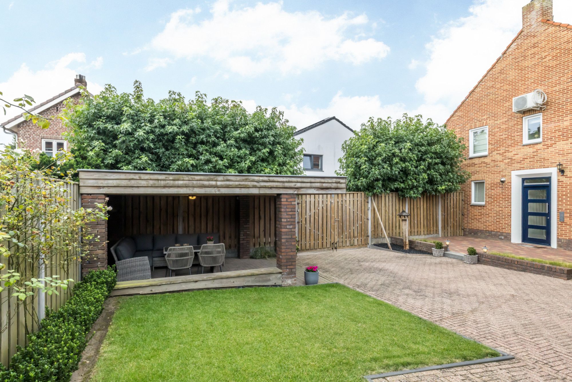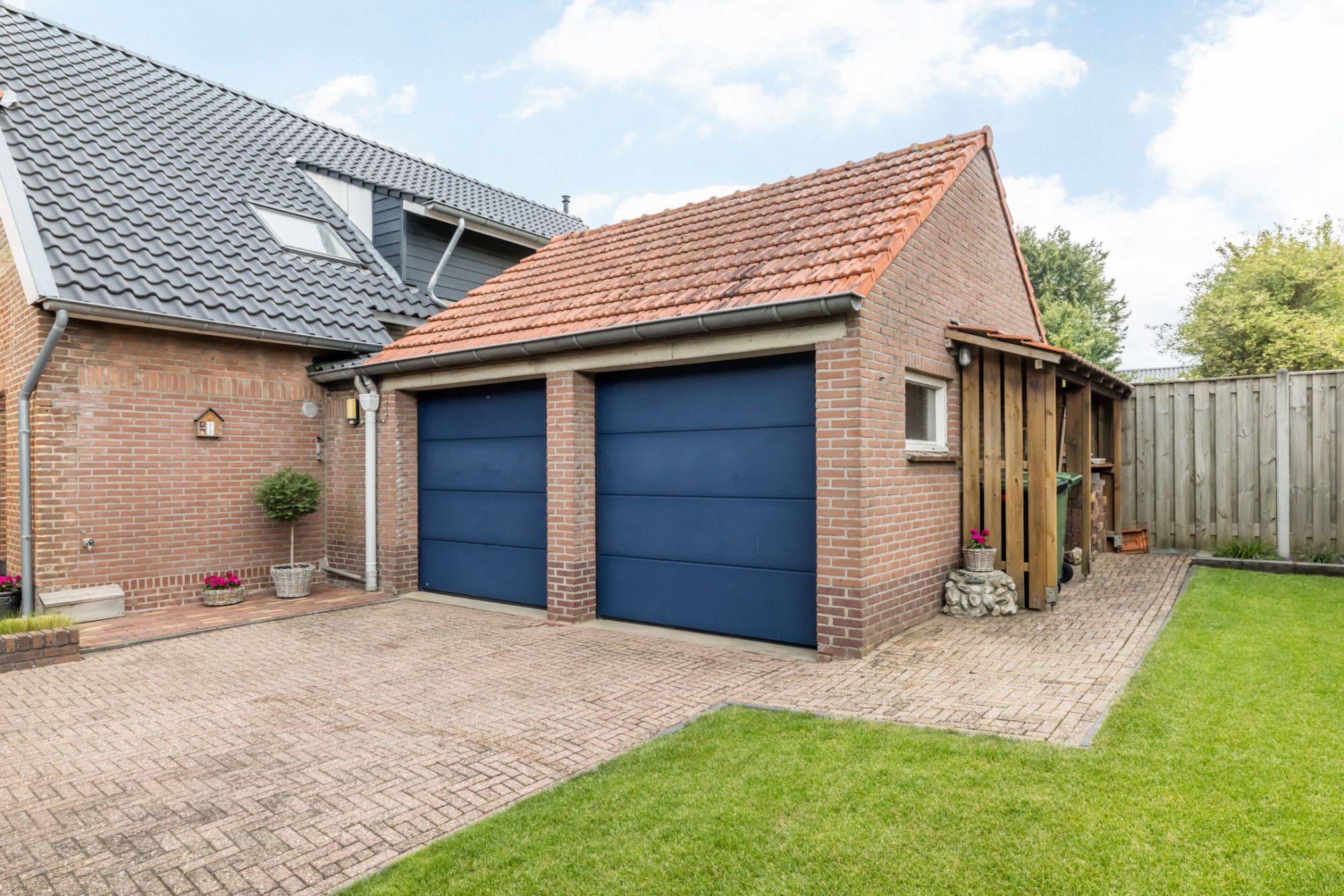 Via een poortje te bereiken voordeur. Entree. Hal met moderne meterkast, trappartij en toegang naar de woonkamer. De gezellige woonkamer is voorzien van een fraaie parketvloer en een open keuken. De keuken verkeert in een goede staat en is uitgevoerd met een apothekerskast, diverse ladekasten en de volgende inbouwapparatuur: vaatwasser, koelkast, combi-oven en RVS schouwkap. Vanuit de woonkamer toegang naar de toiletruimte met houten schuifdeur. Tevens via de woonkamer toegang naar de bijkeuken met voldoende bergruimte, aansluitpunten voor de wasapparatuur en deur naar de tuin. De tuin is fraai aangelegd, ligt zeer gunstig ten opzichte van de zon en is aangelegd met een looppad, oprit, terras en terrasoverkapping. De tuin is omheind en geniet veel privacy. In de tuin bevindt zich een dubbele garage met elektrische sectionaal poorten. De garage is uitgevoerd in spouwmuren en voorzien van een zolderberging. Er is tevens voldoende parkeergelegenheid op de oprit aanwezig.