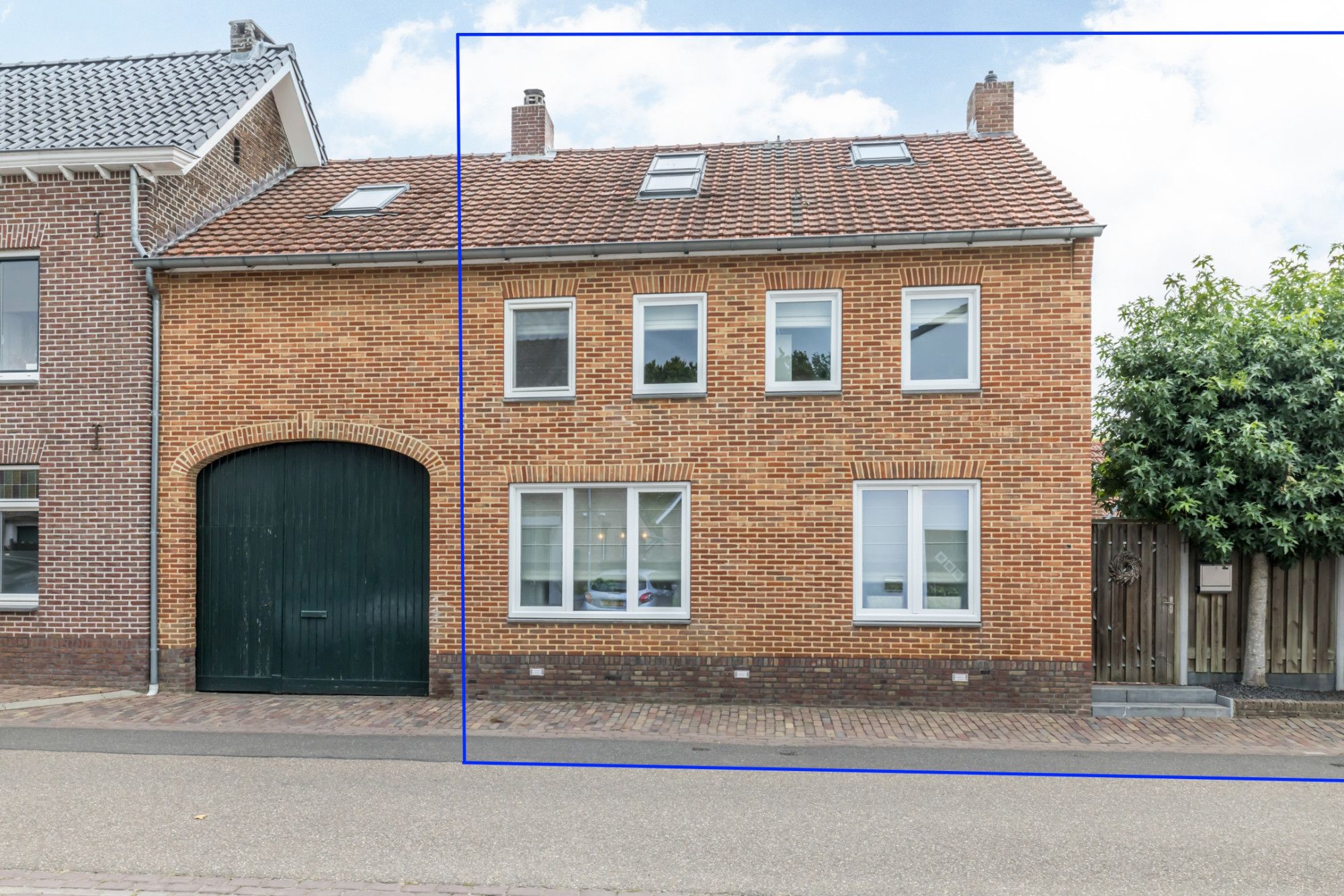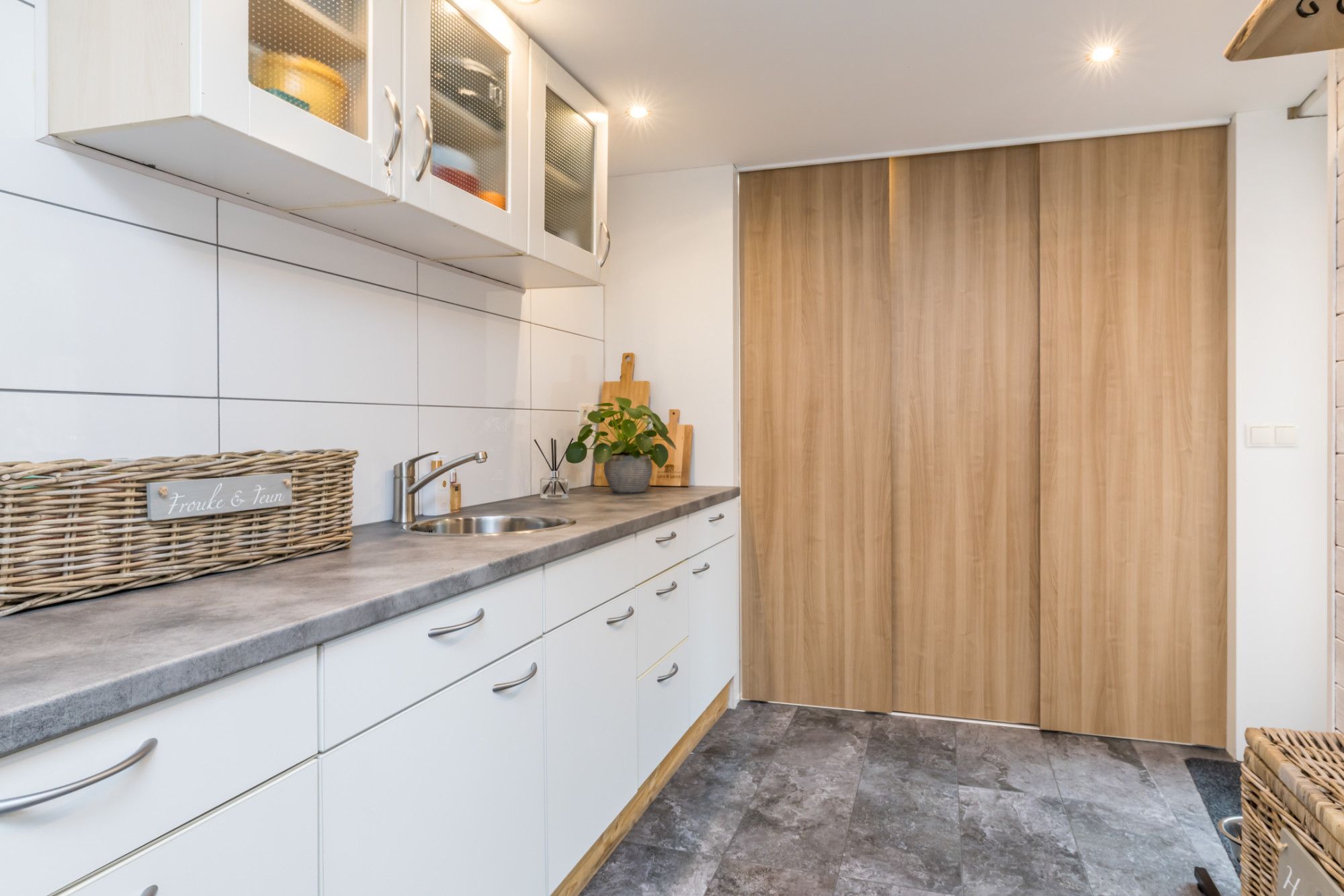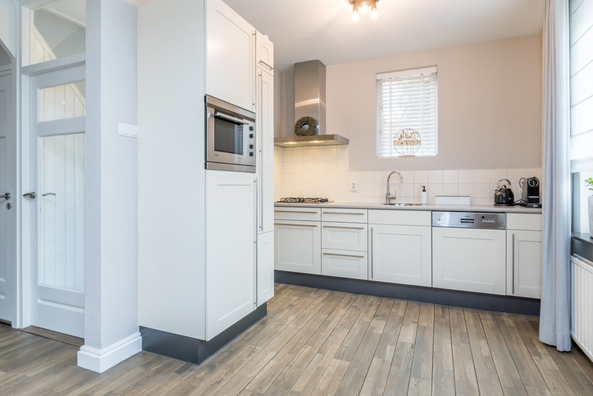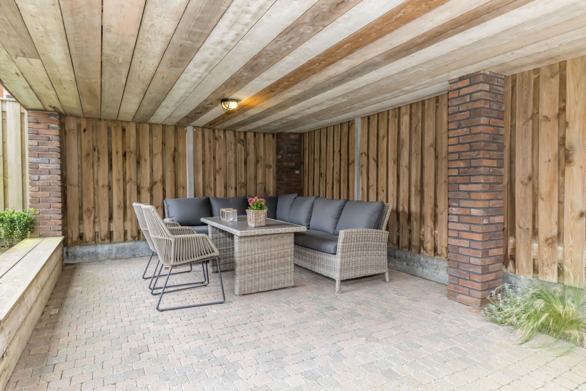 Via een poortje te bereiken voordeur. Entree. Hal met moderne meterkast, trappartij en toegang naar de woonkamer. De gezellige woonkamer is voorzien van een fraaie parketvloer en een open keuken. De keuken verkeert in een goede staat en is uitgevoerd met een apothekerskast, diverse ladekasten en de volgende inbouwapparatuur: vaatwasser, koelkast, combi-oven en RVS schouwkap. Vanuit de woonkamer toegang naar de toiletruimte met houten schuifdeur. Tevens via de woonkamer toegang naar de bijkeuken met voldoende bergruimte, aansluitpunten voor de wasapparatuur en deur naar de tuin. De tuin is fraai aangelegd, ligt zeer gunstig ten opzichte van de zon en is aangelegd met een looppad, oprit, terras en terrasoverkapping. De tuin is omheind en geniet veel privacy. In de tuin bevindt zich een dubbele garage met elektrische sectionaal poorten. De garage is uitgevoerd in spouwmuren en voorzien van een zolderberging. Er is tevens voldoende parkeergelegenheid op de oprit aanwezig.