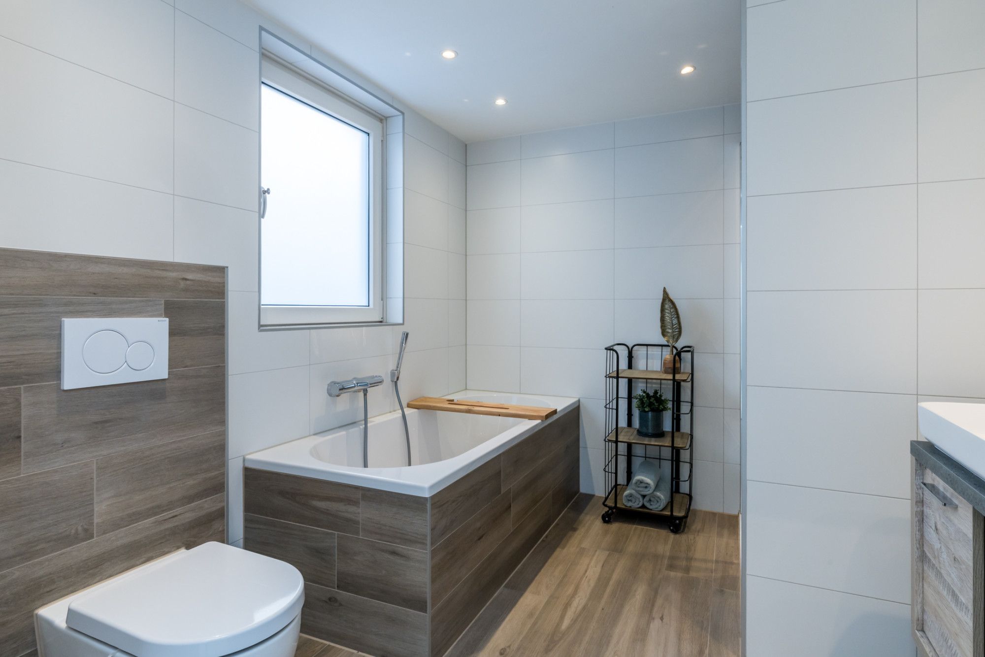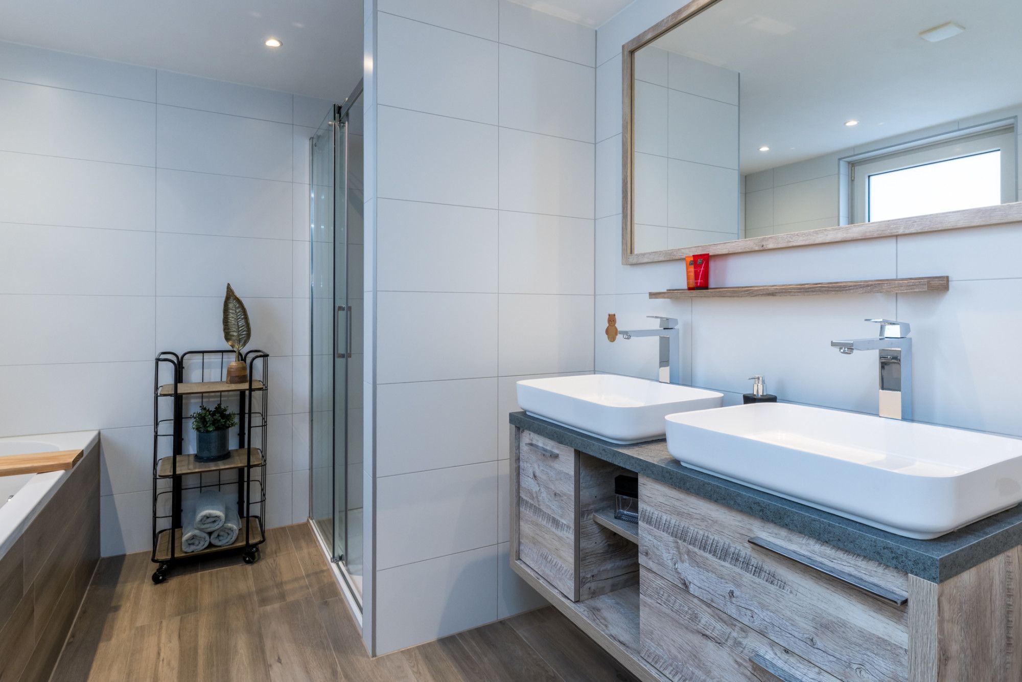 - moderne badkamer (2020) voorzien van ligbad, inloopdouche, badmeubel met dubbele wastafel en zwevend
