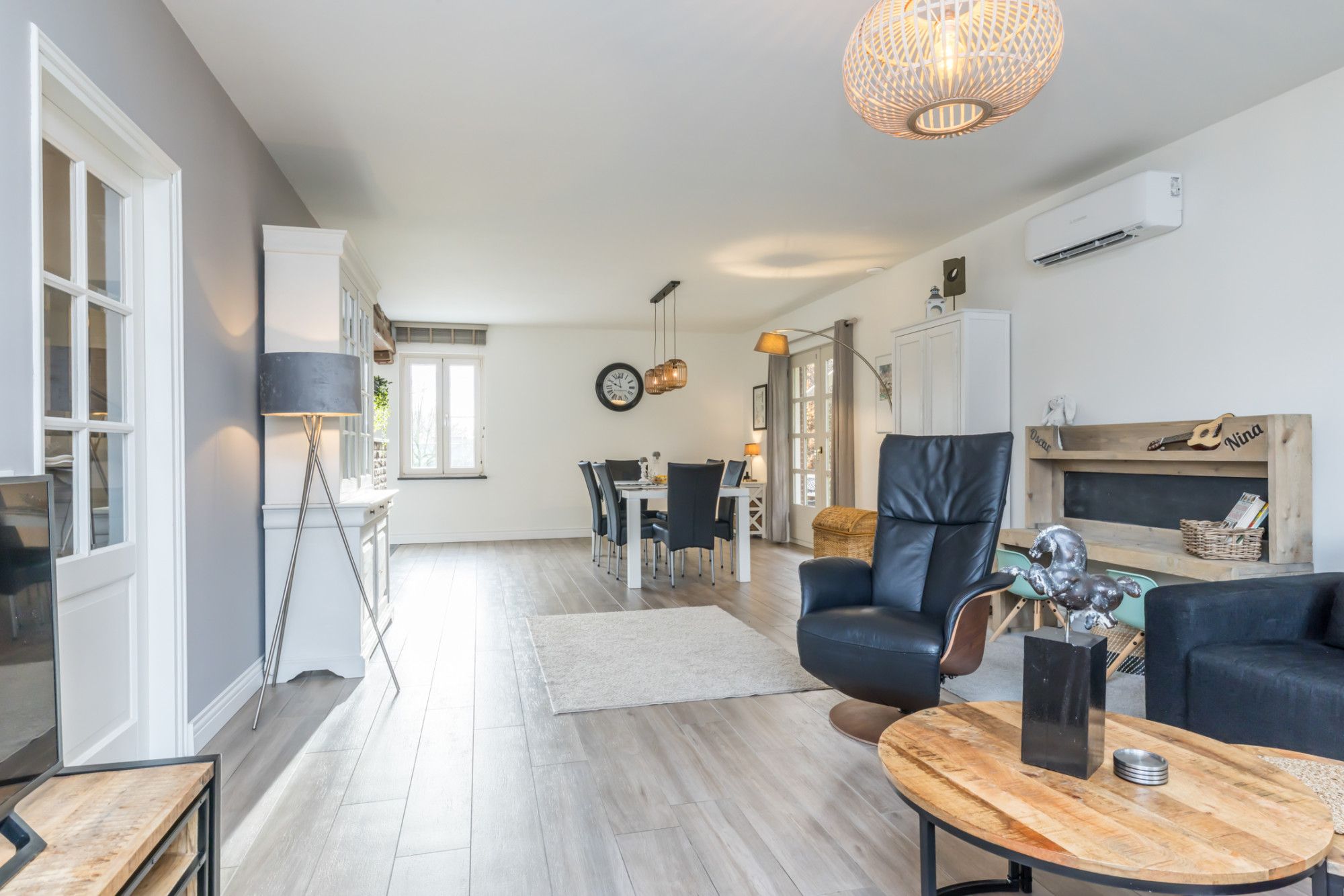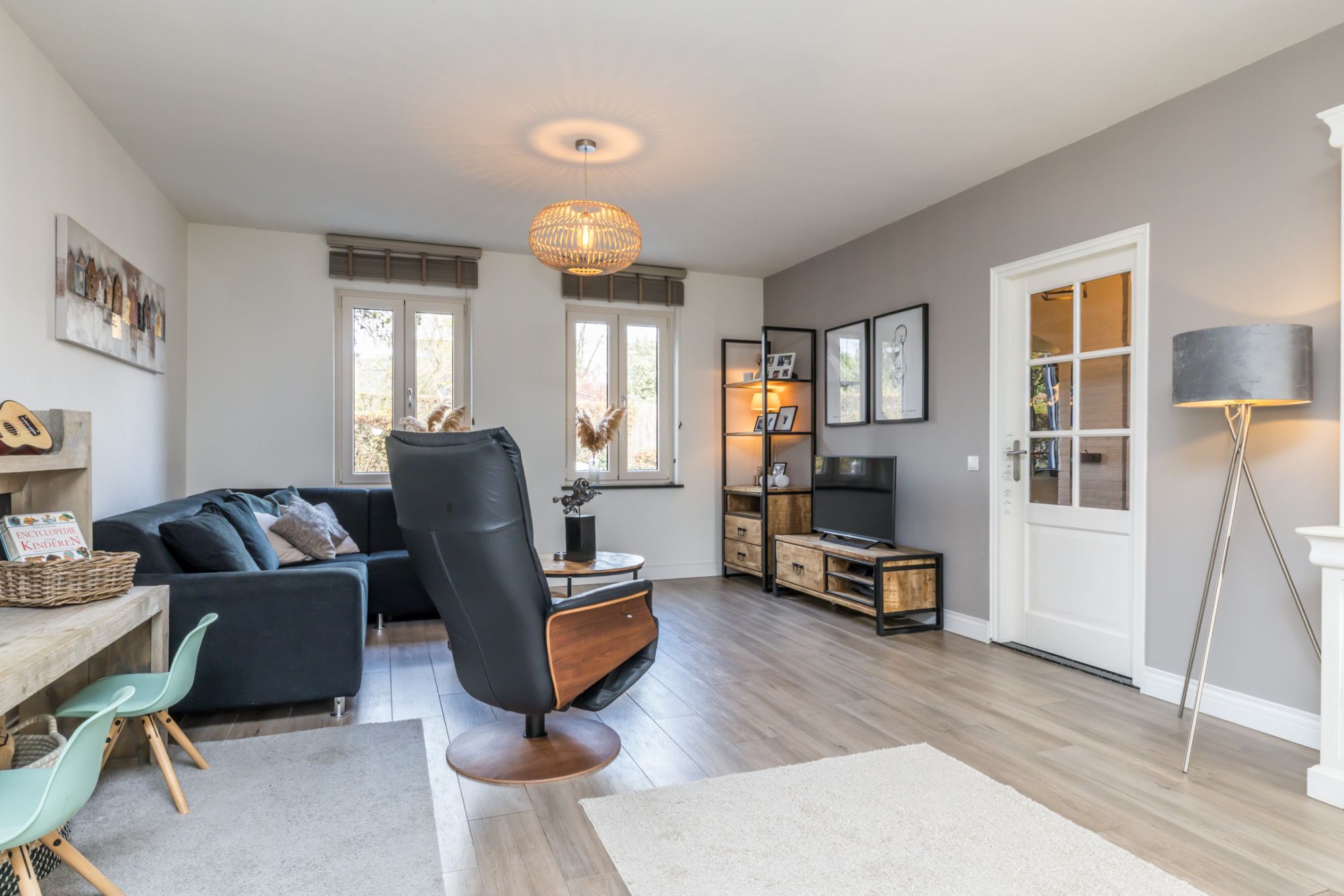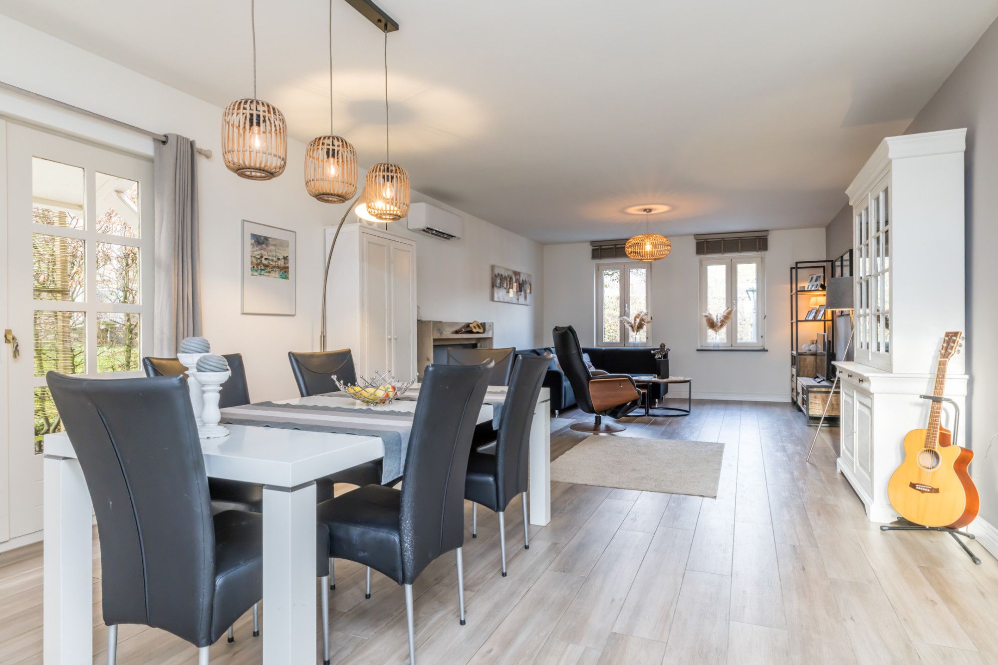 - woonkamer met plavuizenvloer in houtlook (met vloerverwarming) en openslaande deuren naar het terras