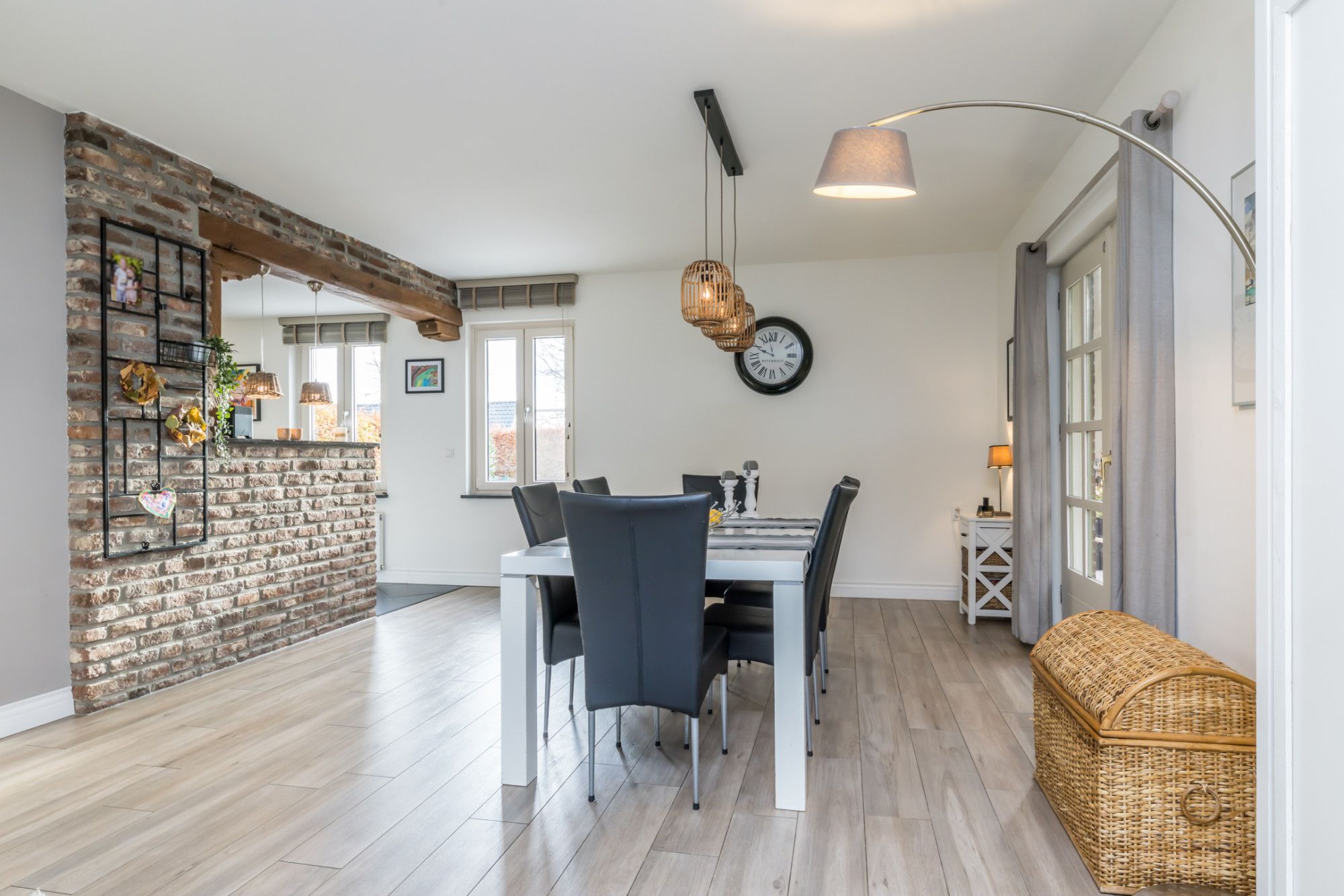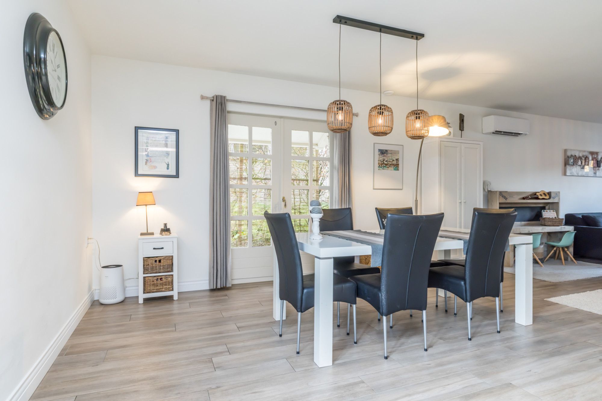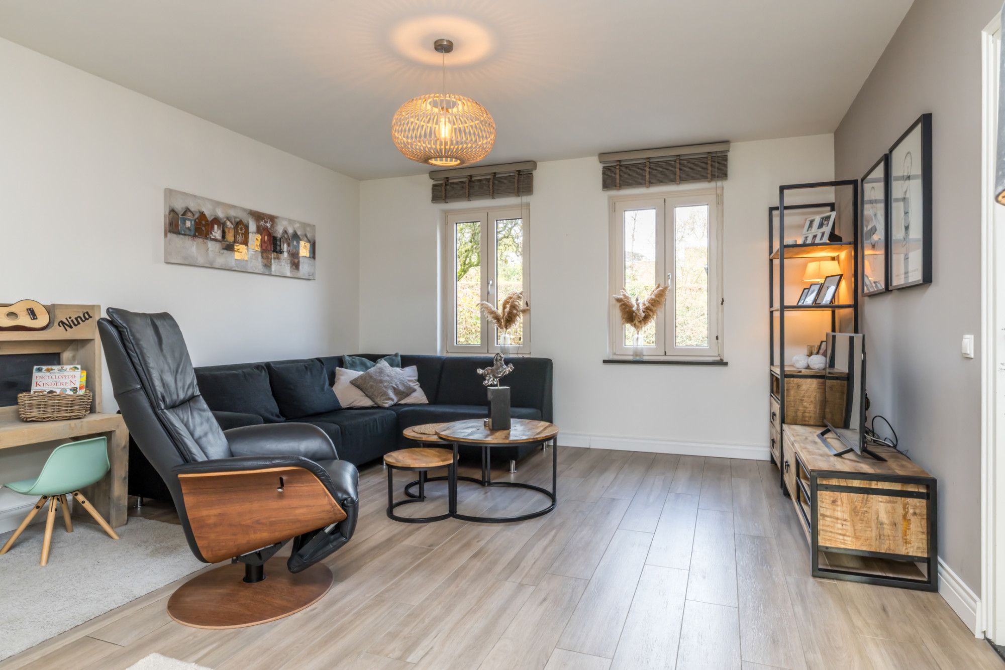 - woonkamer met plavuizenvloer in houtlook (met vloerverwarming) en openslaande deuren naar het terras