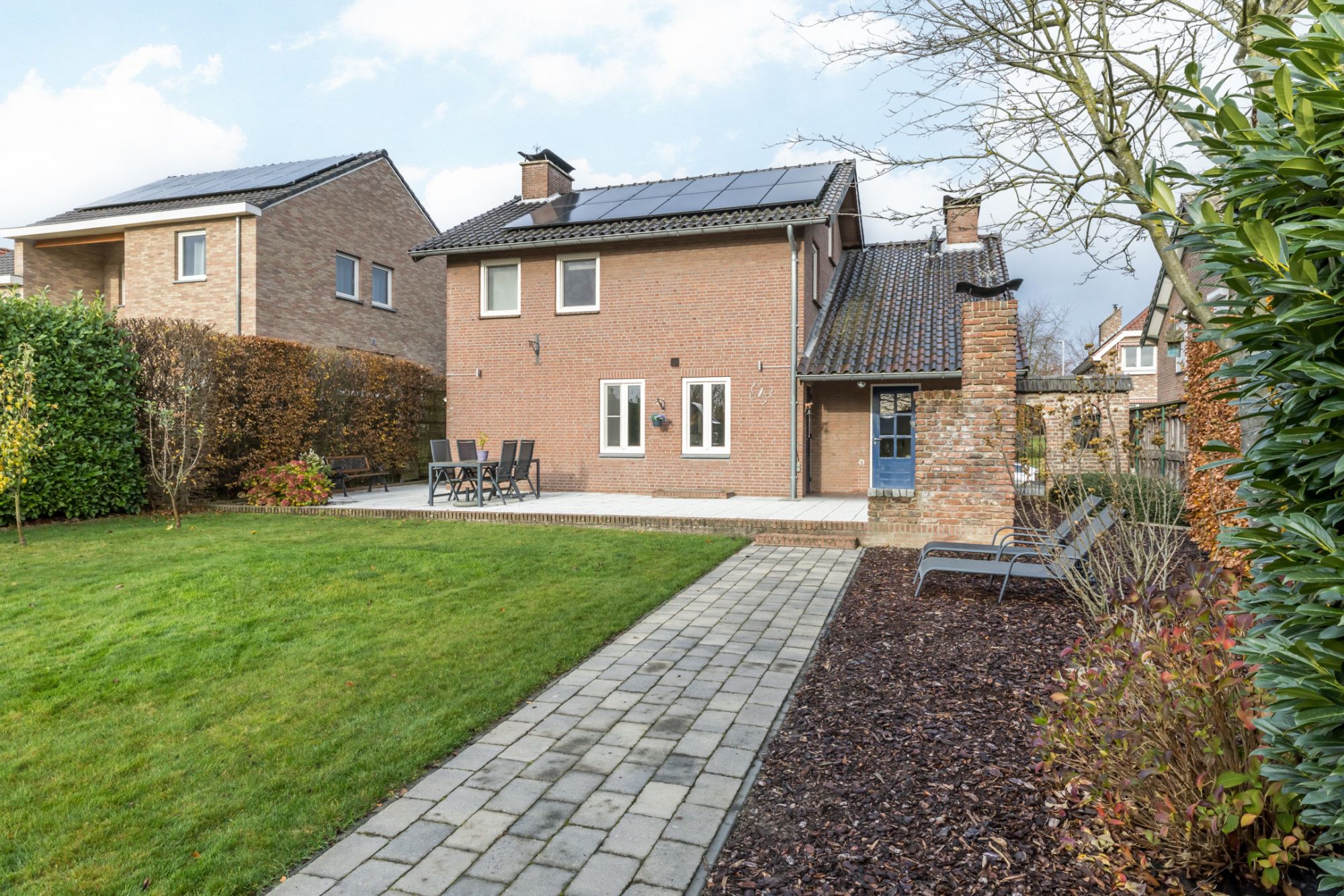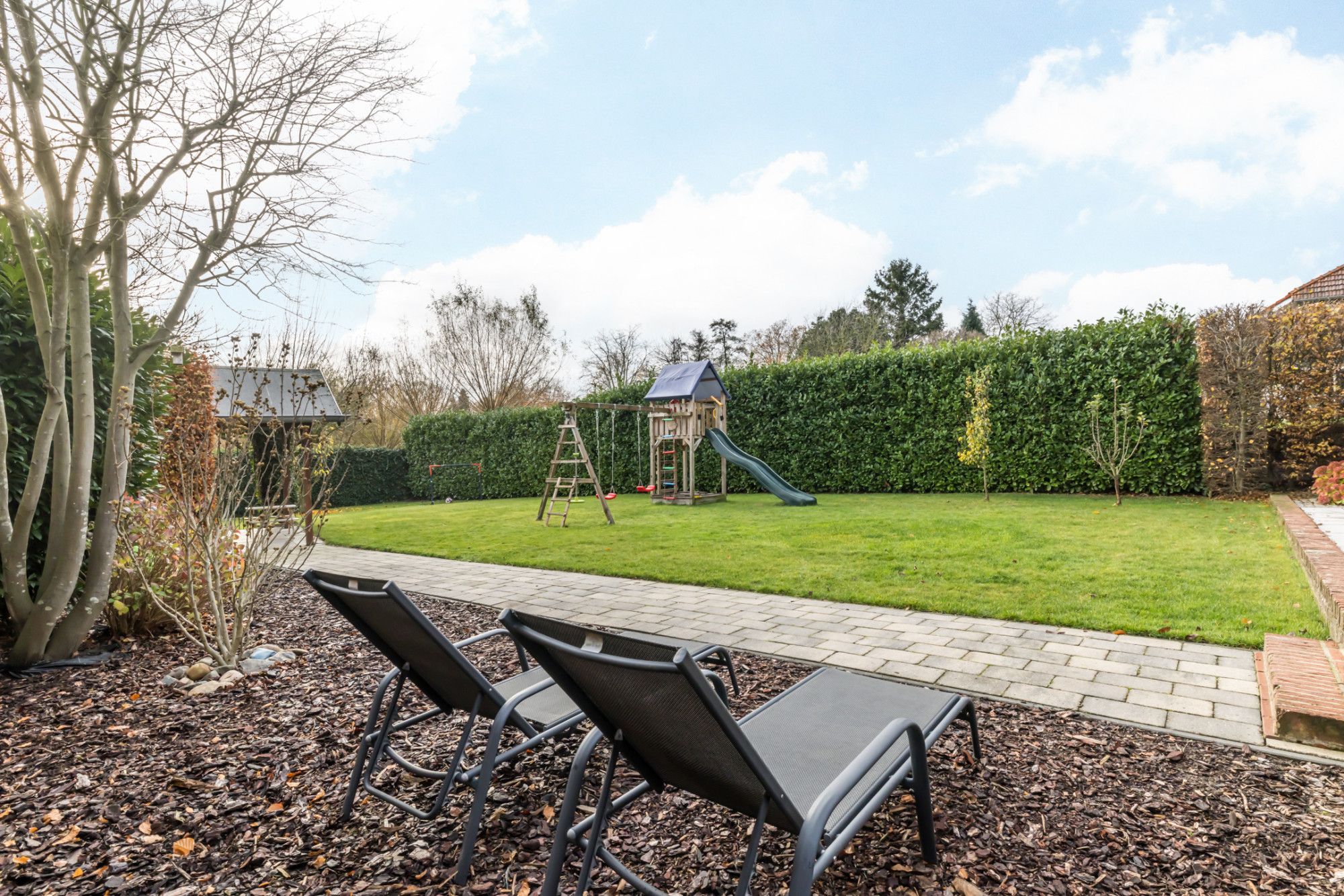 Aangelegde achtertuin met terras, plantenborders en houten tuinberging met overkapping.