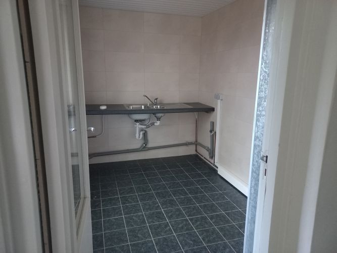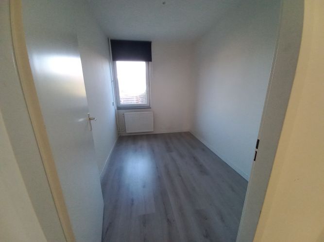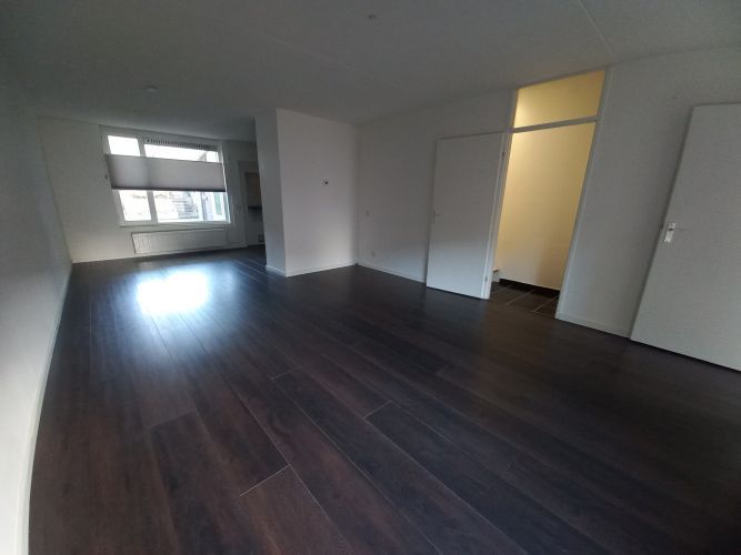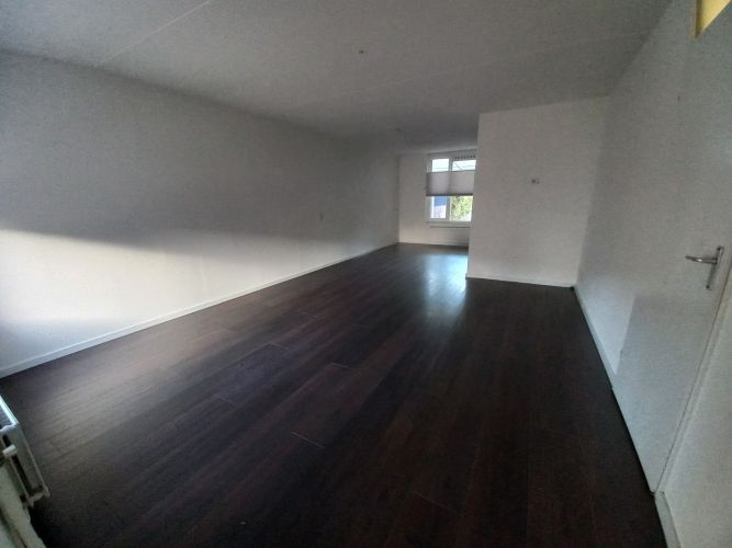 - L-vormige doorzon woonkamer met halfopen keuken (totaal 37 m2) met laminaatvloer en toegang naar hal met meterkast.