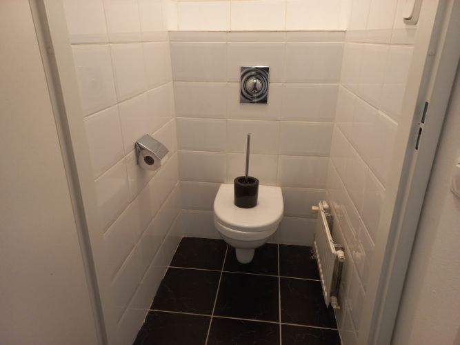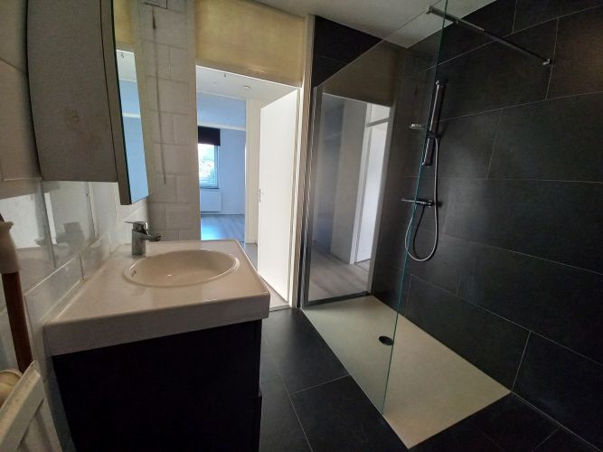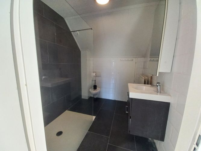 - Geheel betegelde badkamer (ca. 2.61 x 2.20 m) met tegelvloer, inloopdouche v.v. douchescherm, badmeubel met vaste wastafel en 2e toilet. Tevens bergruimte in achterwand.