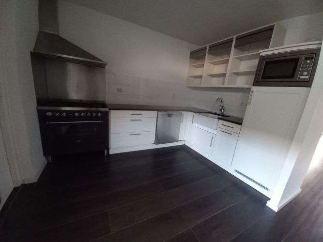 De halfopen keuken is v.v. een moderne hoekinstallatie met apparatuur, o.a. Boretti 6-pits gasfornuis met oven, vaatwasser, koelkast, ingebouwde magnetron en RVS afzuiging. Vanuit de keuken toegang tot de wasberging.