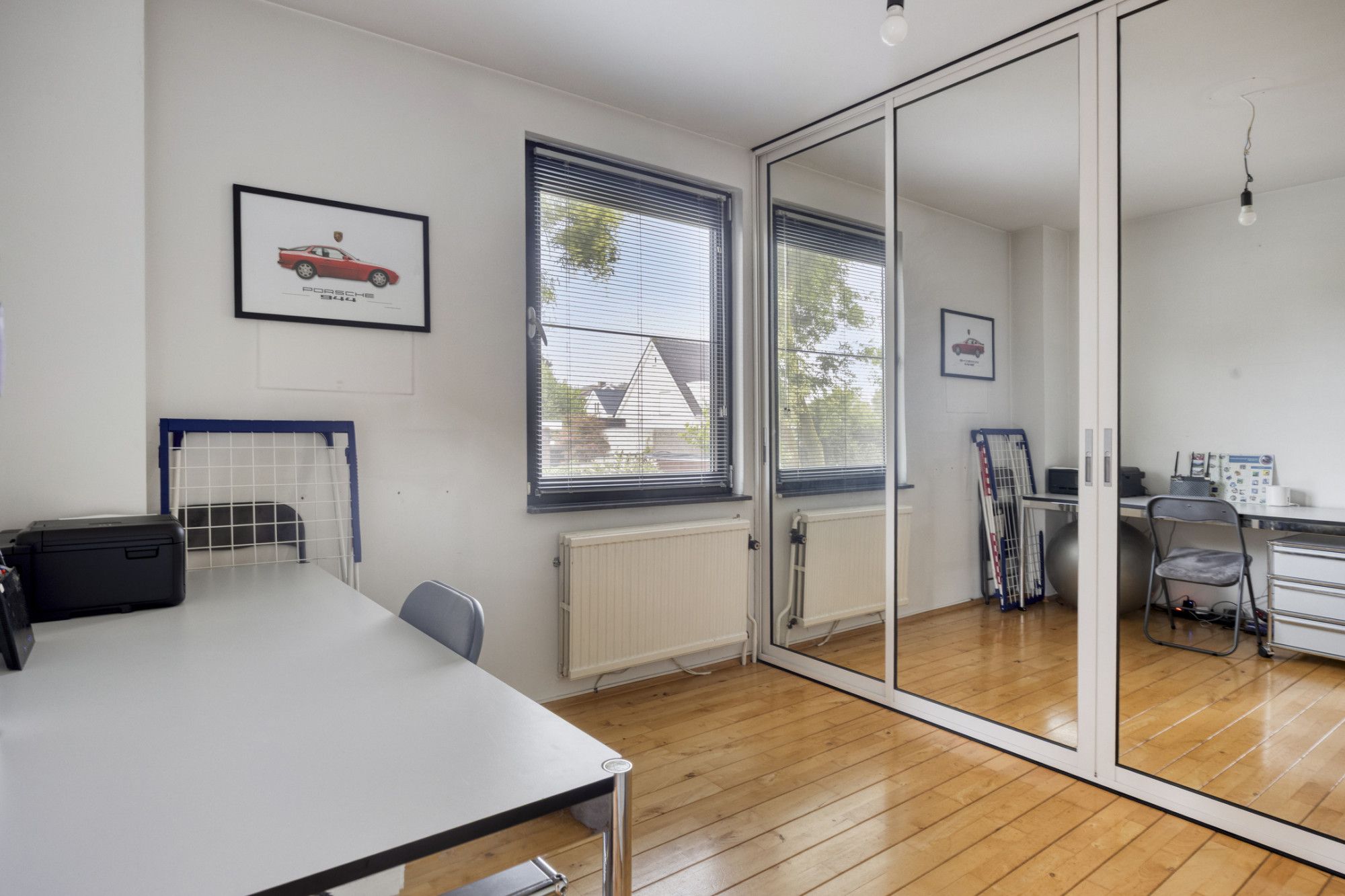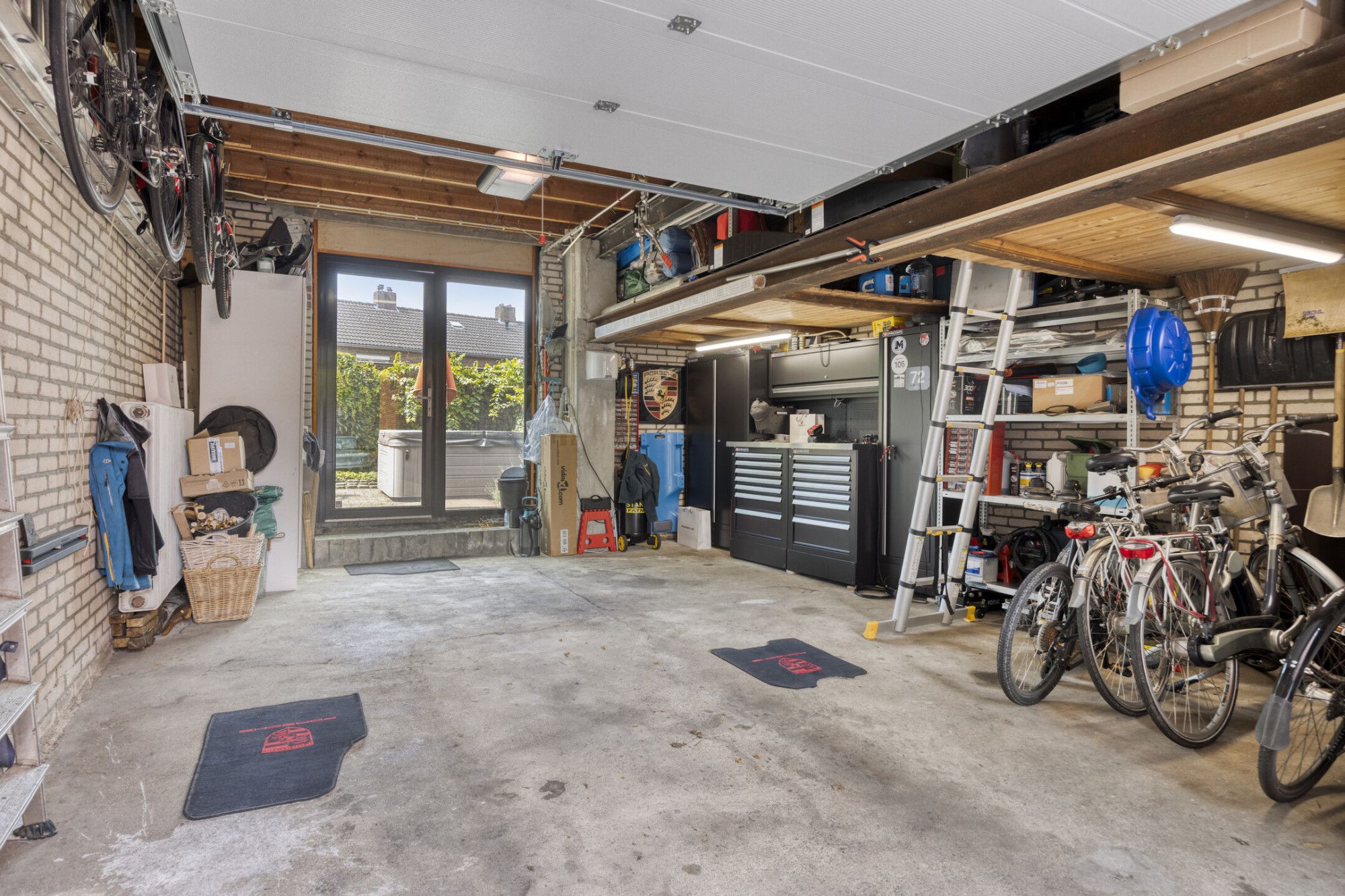 Ruime verwarmde garage (6.21 x 4.73/5.15 m) geschikt voor het stallen van 2 auto's met elektrisch bedienbare sectionaal poort en bergvliering. Oprit met oplaadpunt voor elektrische auto.