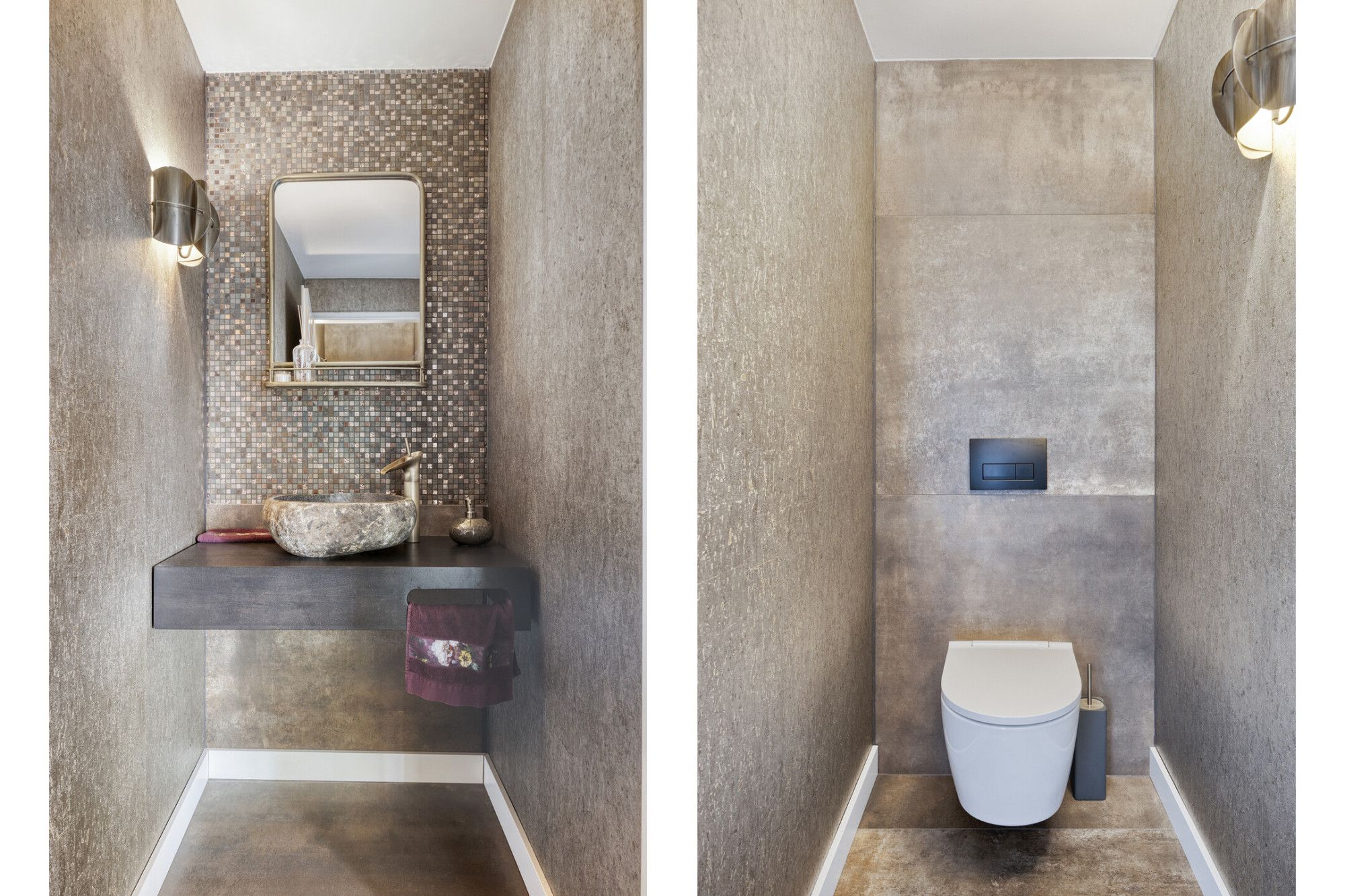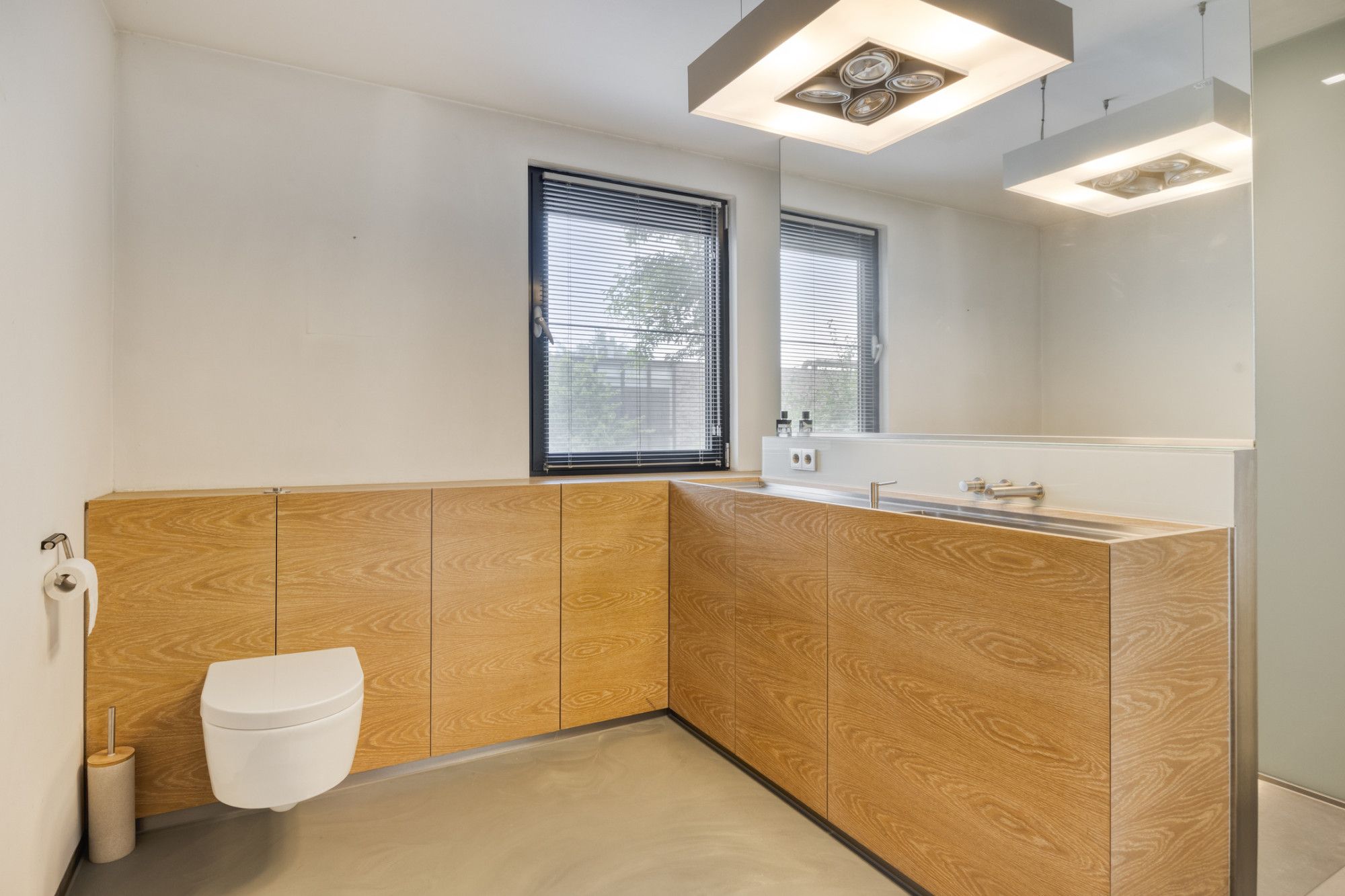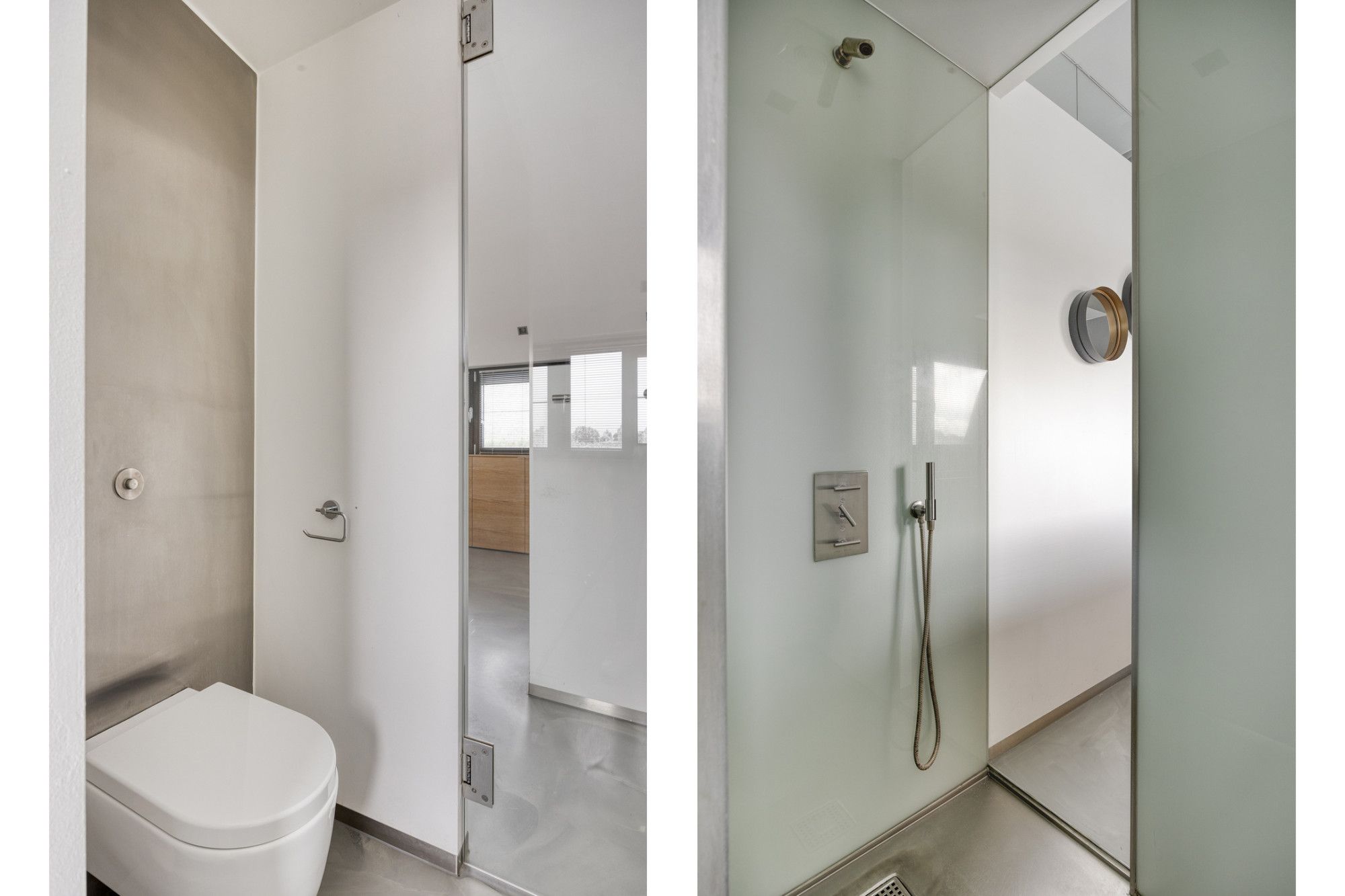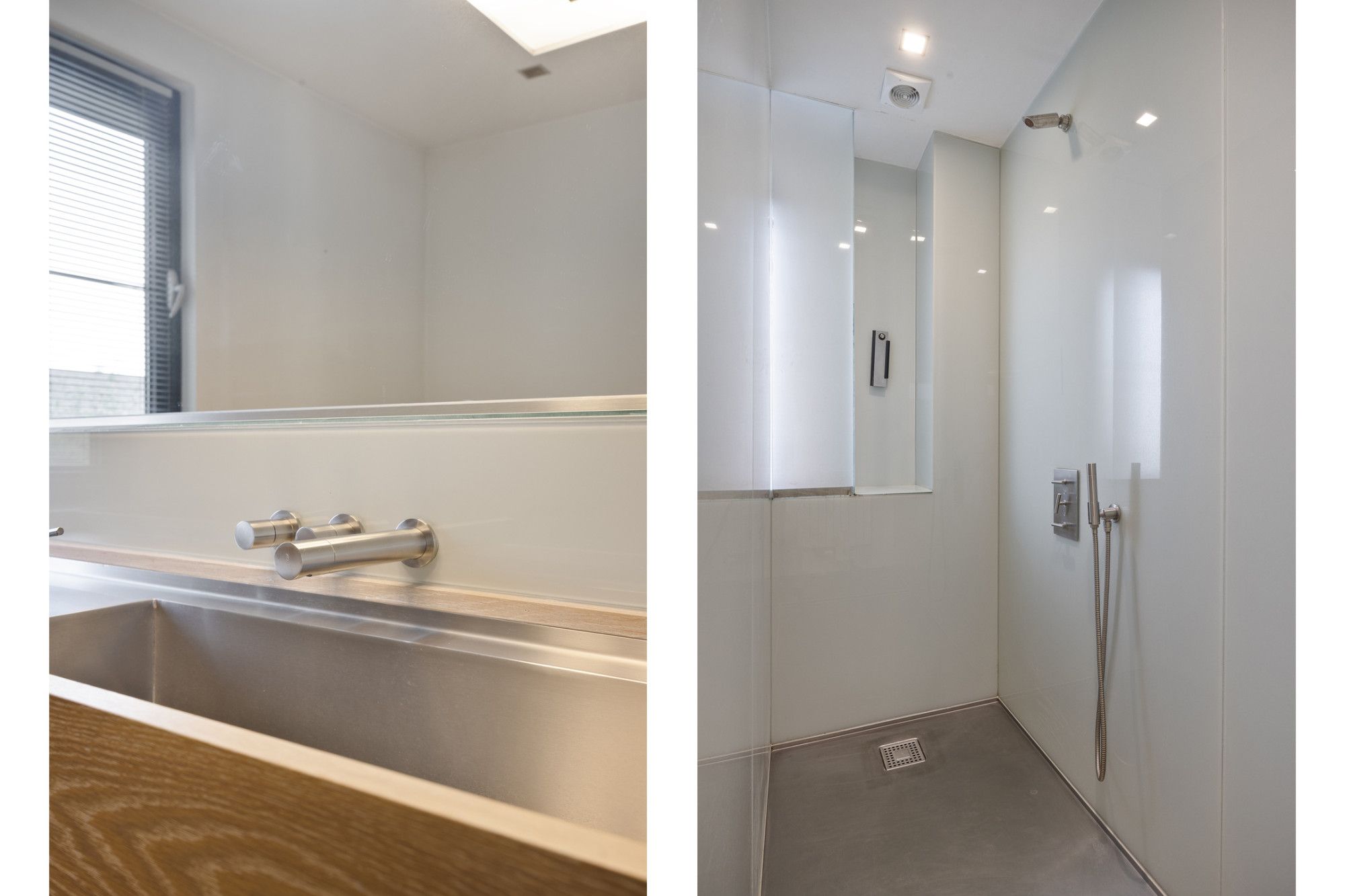 Badkamer 1 (3.28 x 2.70 m) voorzien van gietvloer, inloopdouche met RVS vloer, 2e wandcloset en op maat gemaakt badmeubel met voldoende bergruimte met geïntegreerde RVS wastafel.