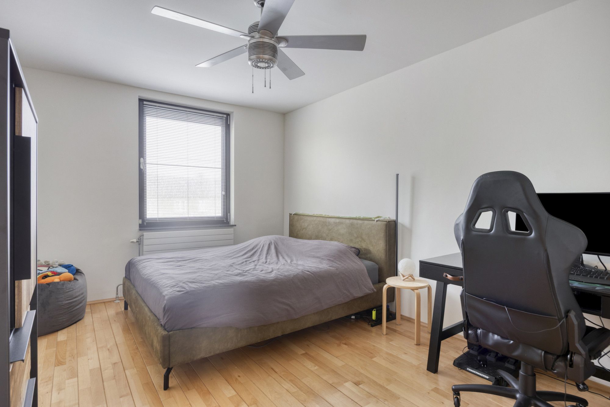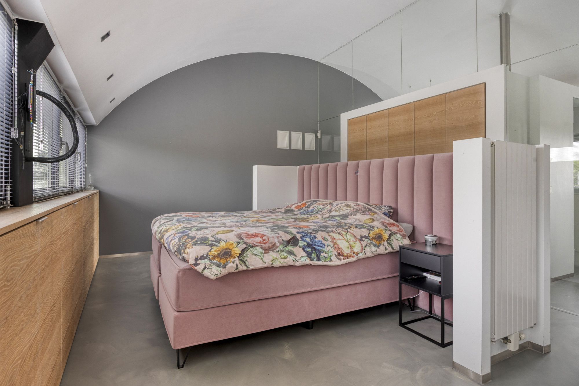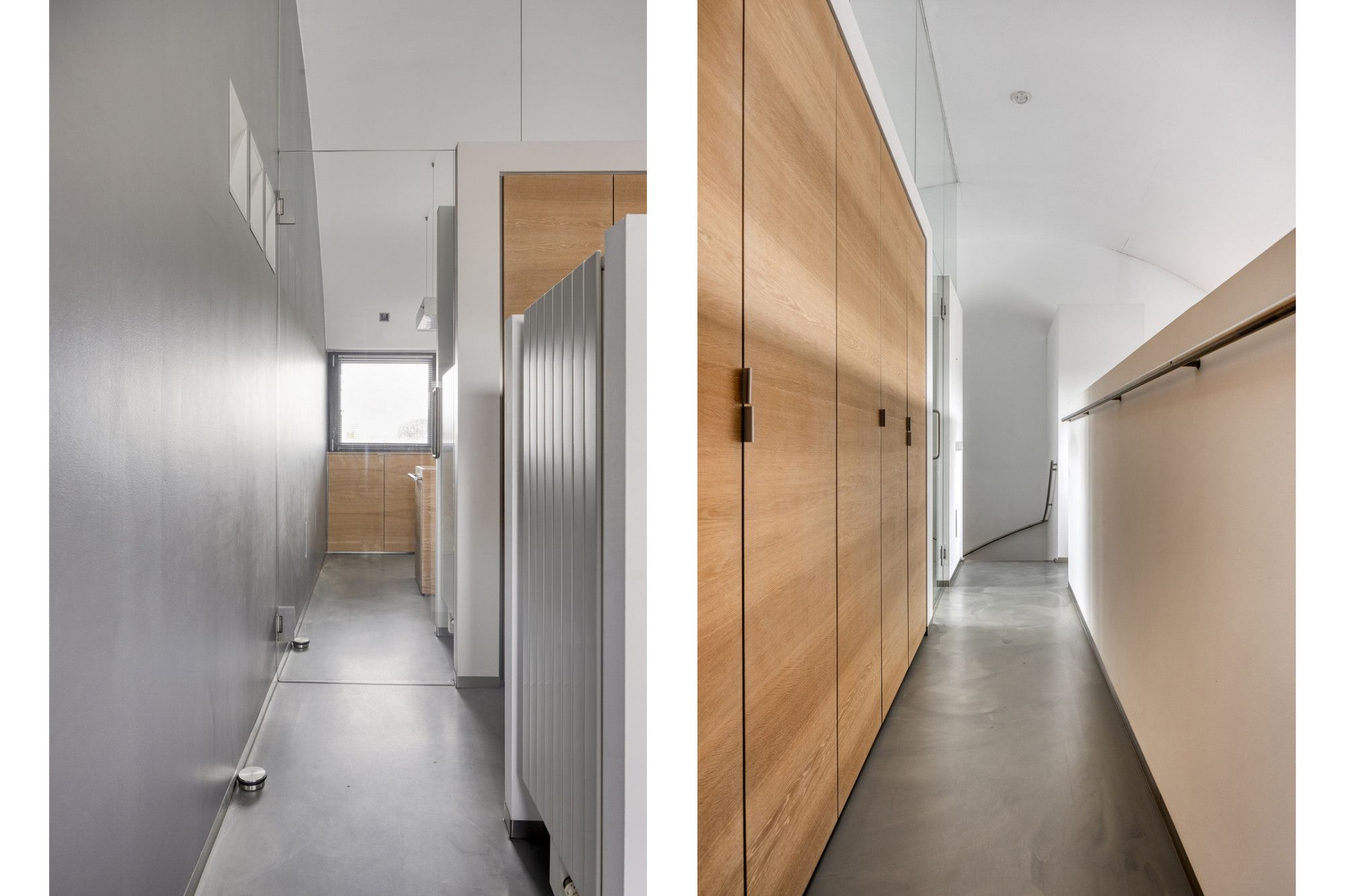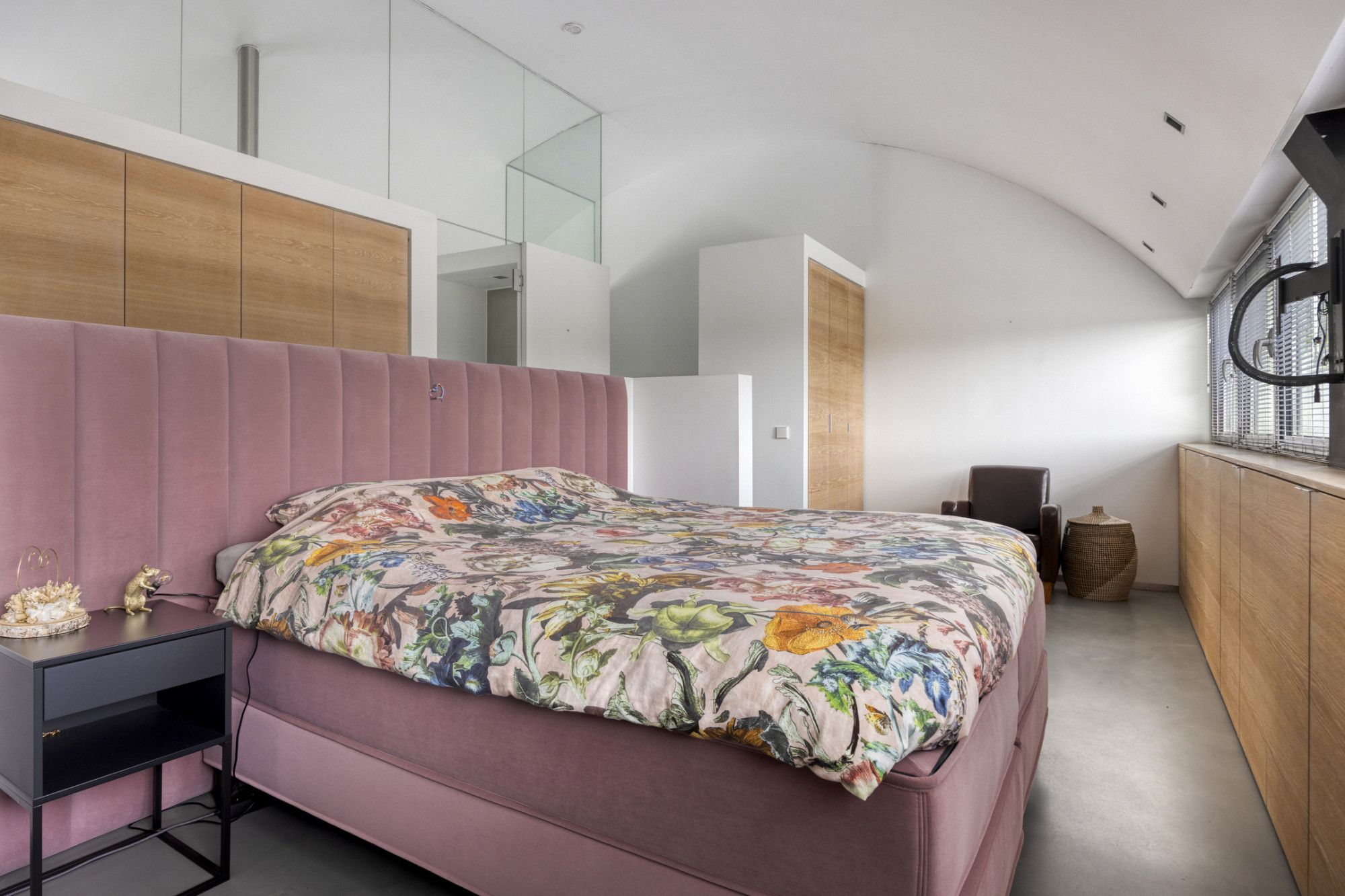 Middels vaste trap te bereiken luxe ouder verdieping met slaapkamer annex badkamer voorzien van doorlopende gietvloer met een fraaie nokhoogte van 3.65 m en diepe ingebouwde op maat gemaakte bergkasten in beide buitenwanden.