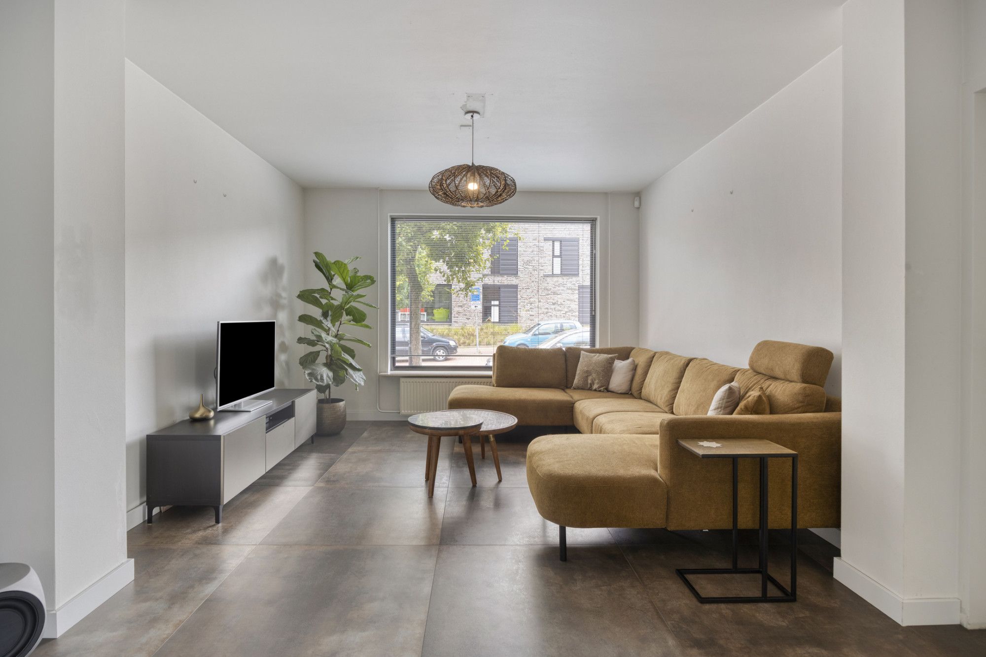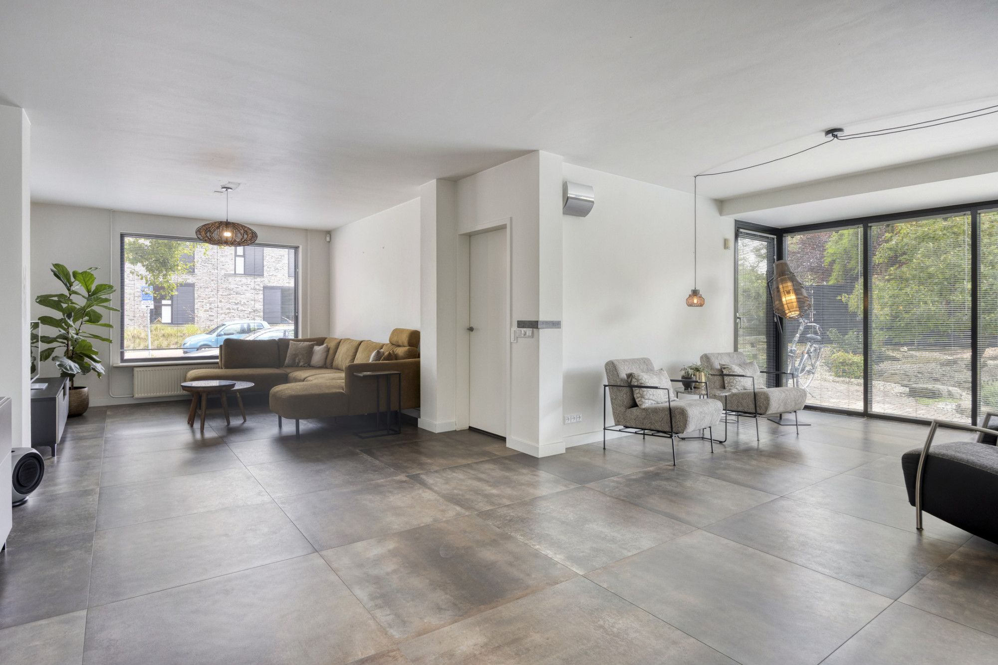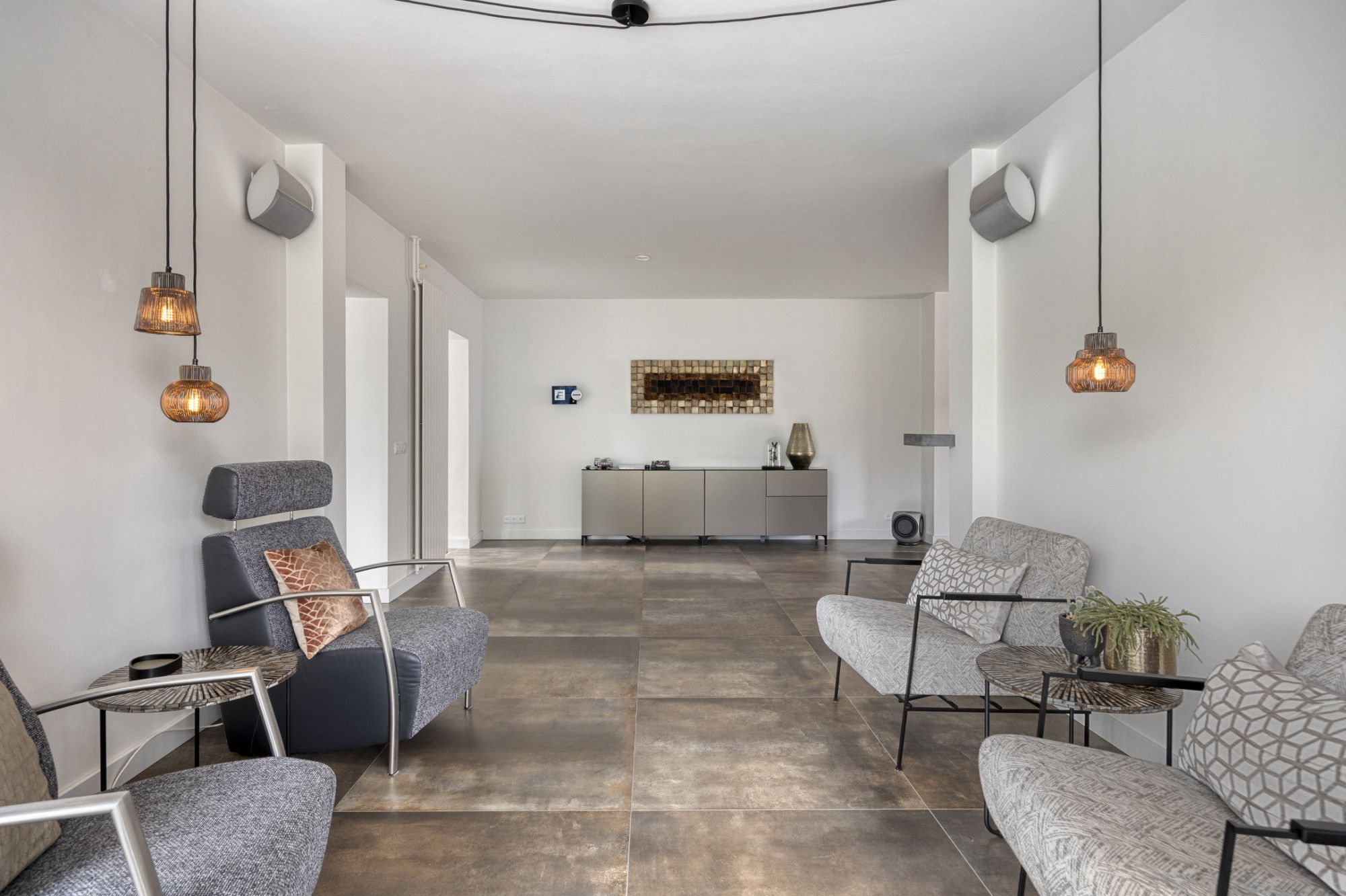 Mooie speels ingedeelde lichte leefruimte eveneens voorzien van tegelvloer voorzien van vloerverwarming totaal 62 m² verdeeld in een L-woonkamer (8.40 x 8.00/3.66 m - totaal 46 m²) en een separate eetkamer (5.30 x 3.05 m - totaal 16 m²). Portaal (2.40 x 0.90 m) met wasbak en design kraan en separate toiletruimte met wandcloset.