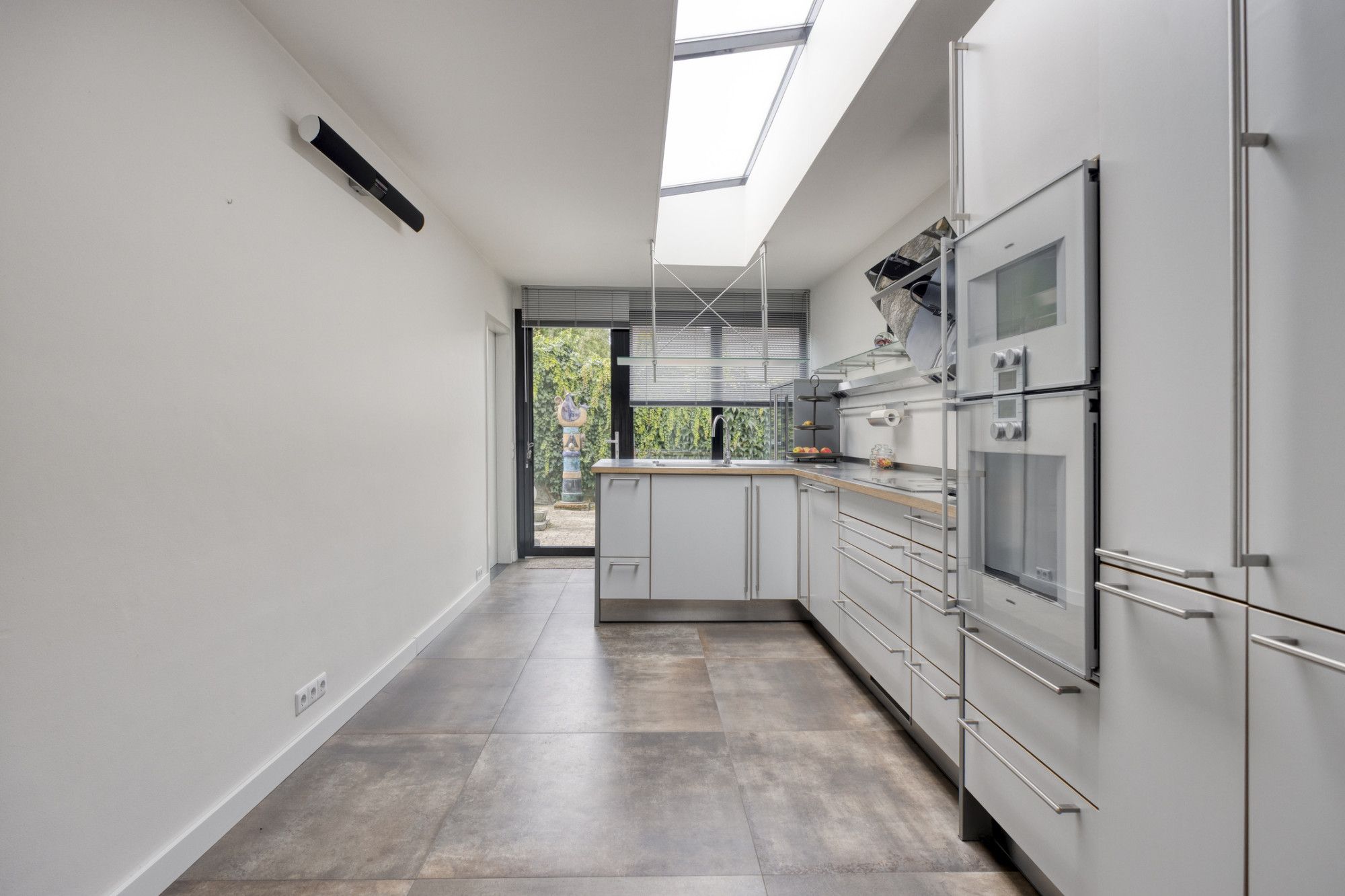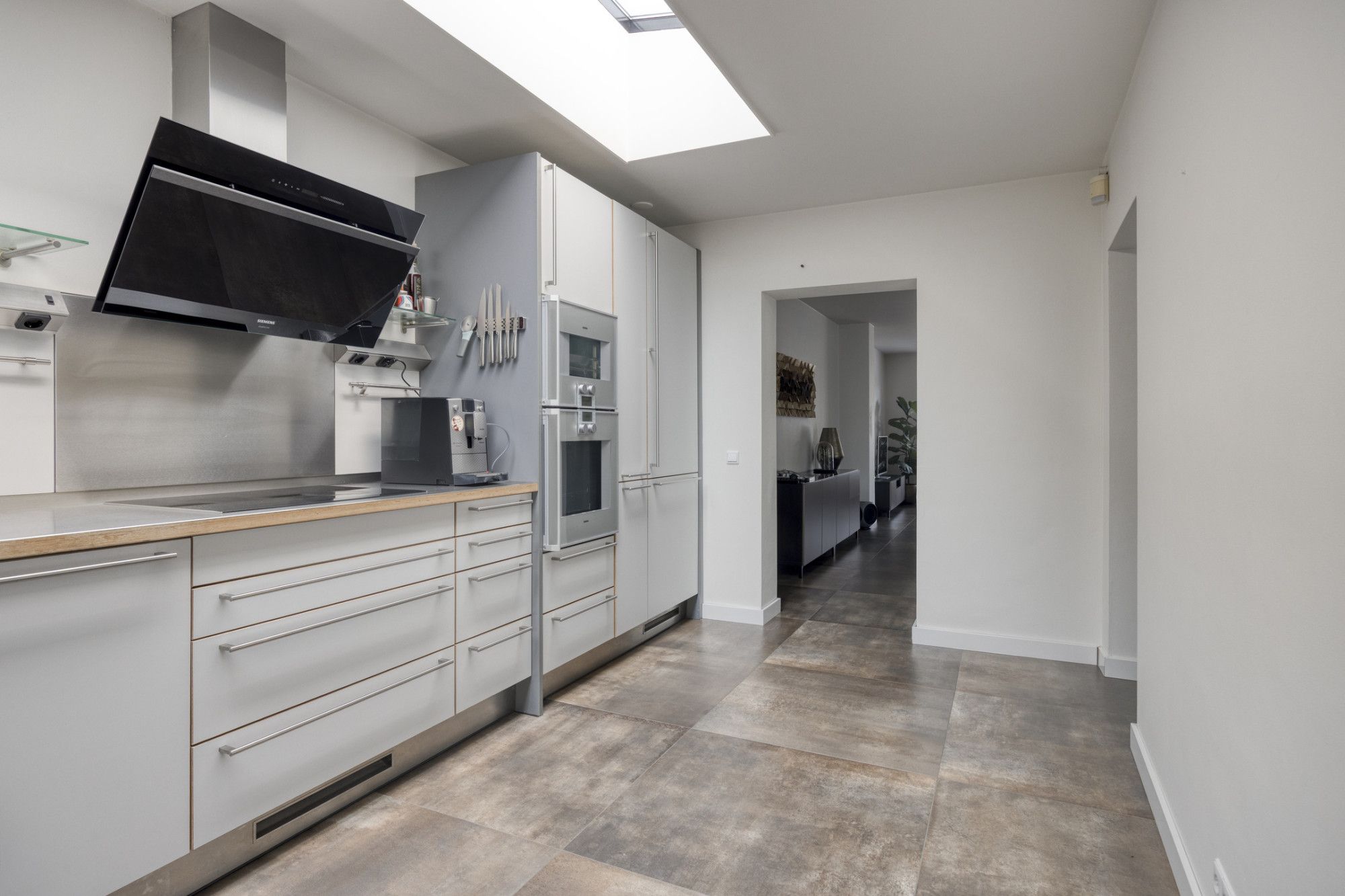 Half open keuken (6.21 x 2.79 m) met lichtstraat en voorzien van luxe Bulthaup keukeninstallatie in hoekopstelling met diverse onderkasten, apothekerskast, separate servieskast en spoel/werkeiland met RVS werkblad, inbouwapparatuur te weten: 4-pits inductie kookplaat met flexzone, afzuigkap, oven met pizzasteen, separate stoomoven met vaste wateraansluiting, vaatwasser en koelkast met freshzone (Siemens en Gaggenau apparatuur).
