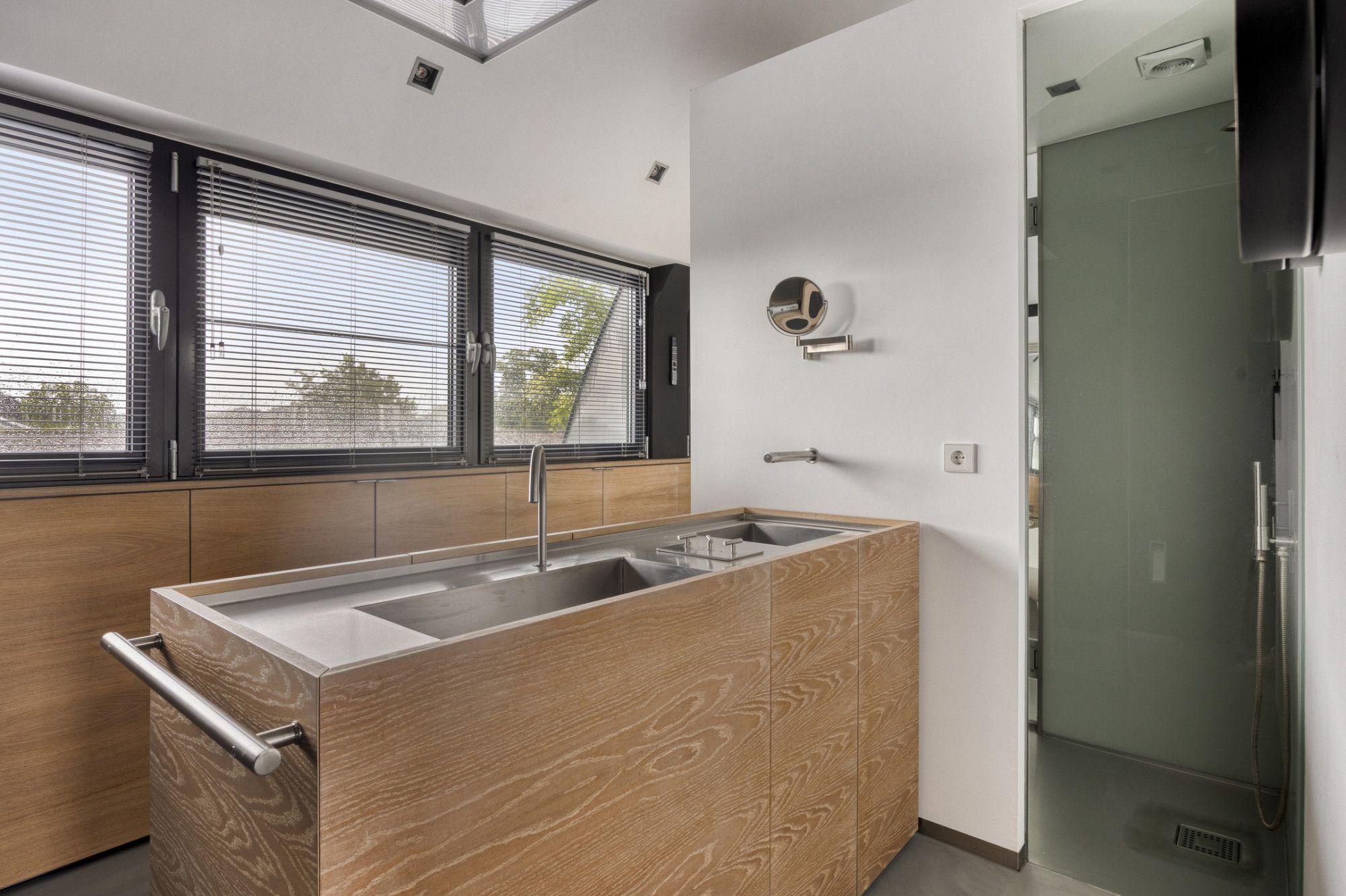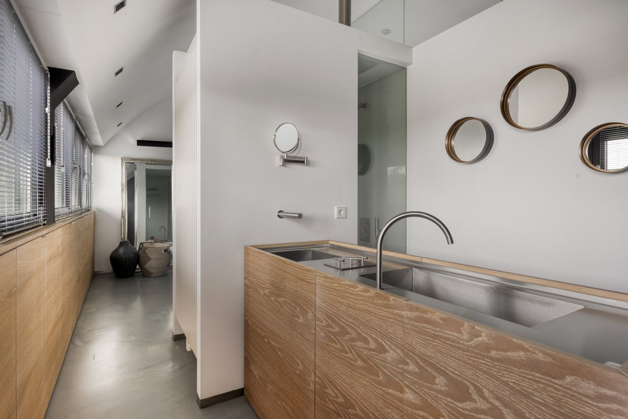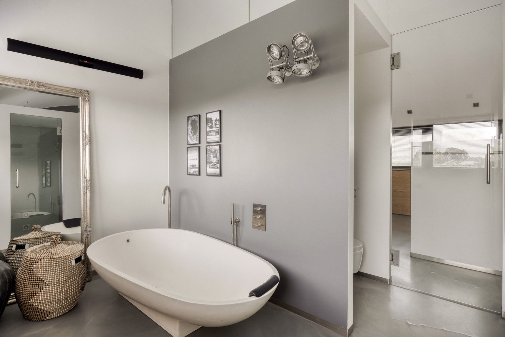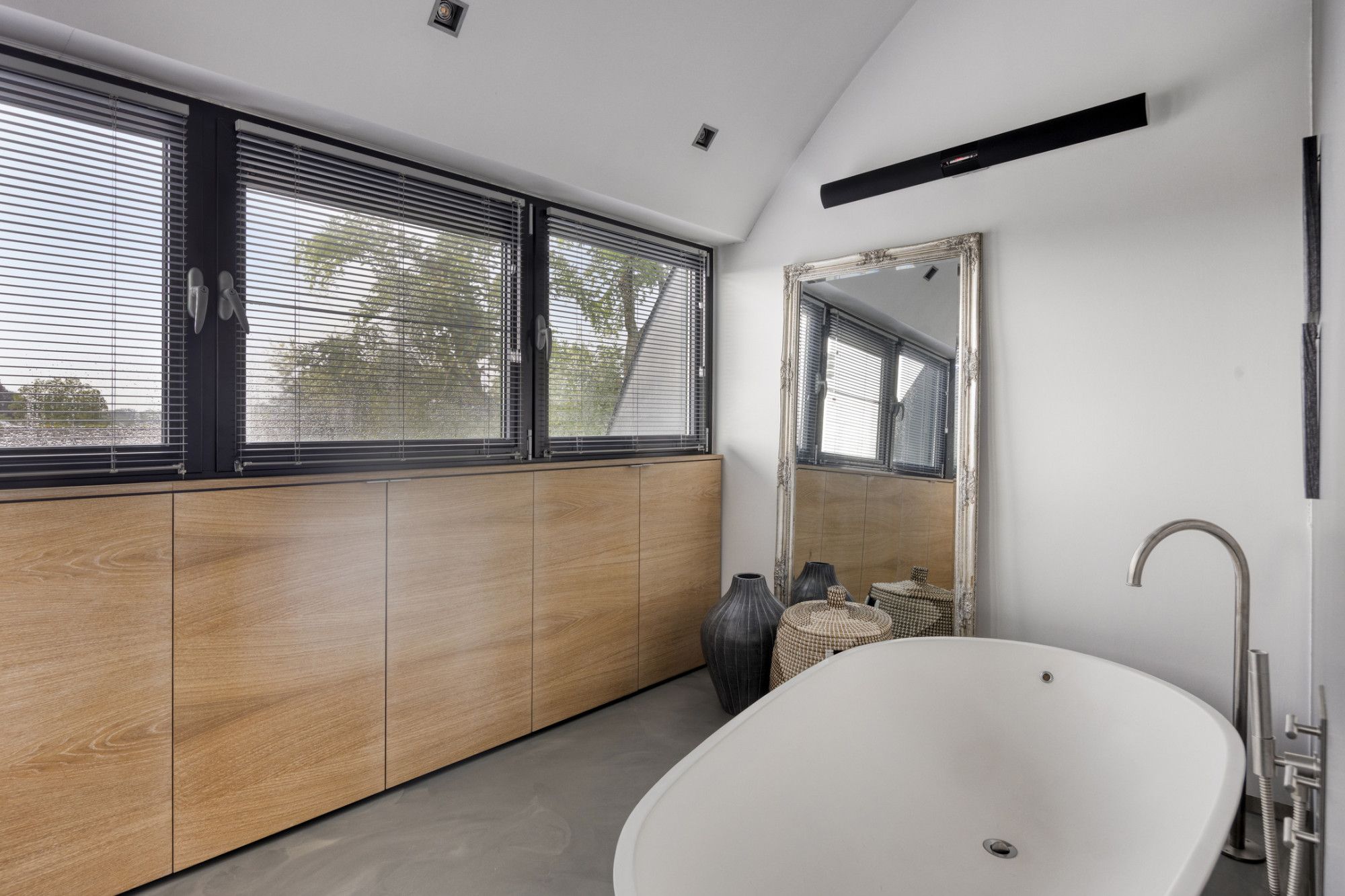 Luxe badkamer (6.64 x 2.40 m) met inloopdouche met RVS vloer, op maat gemaakt badmeubel met voldoende bergruimte en geïntegreerde RVS wastafel, nis met wandcloset en luxe vrijstaand marmer-epoxy bad.