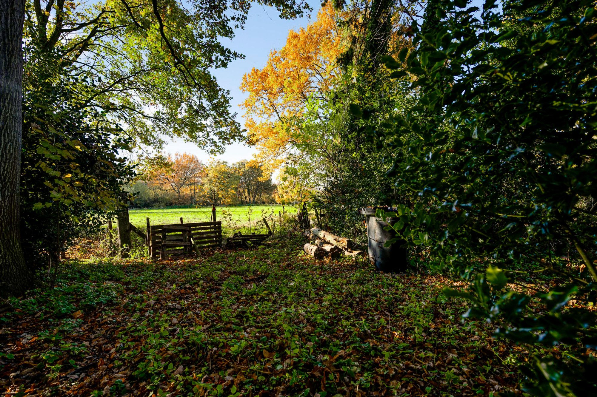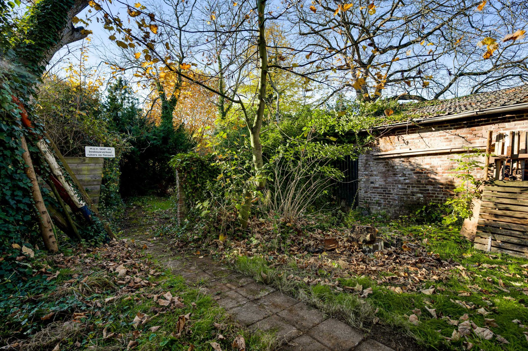 Naast de woning is de oprit en een vrije achterom naar de berging en de achtertuin, die op het zuidwesten is gericht. De tuin heeft een gazon en een ruim terras. Borders geven het geheel een levendig en sfeervol karakter. Achterin de tuin is een bospartij, die zowel voor de bewoners als voor de dieren een natuurlijke oase biedt. Het geheel ademt rust, ruimte, natuur en biedt volop mogelijkheden voor buitenactiviteiten en ontspanning.
